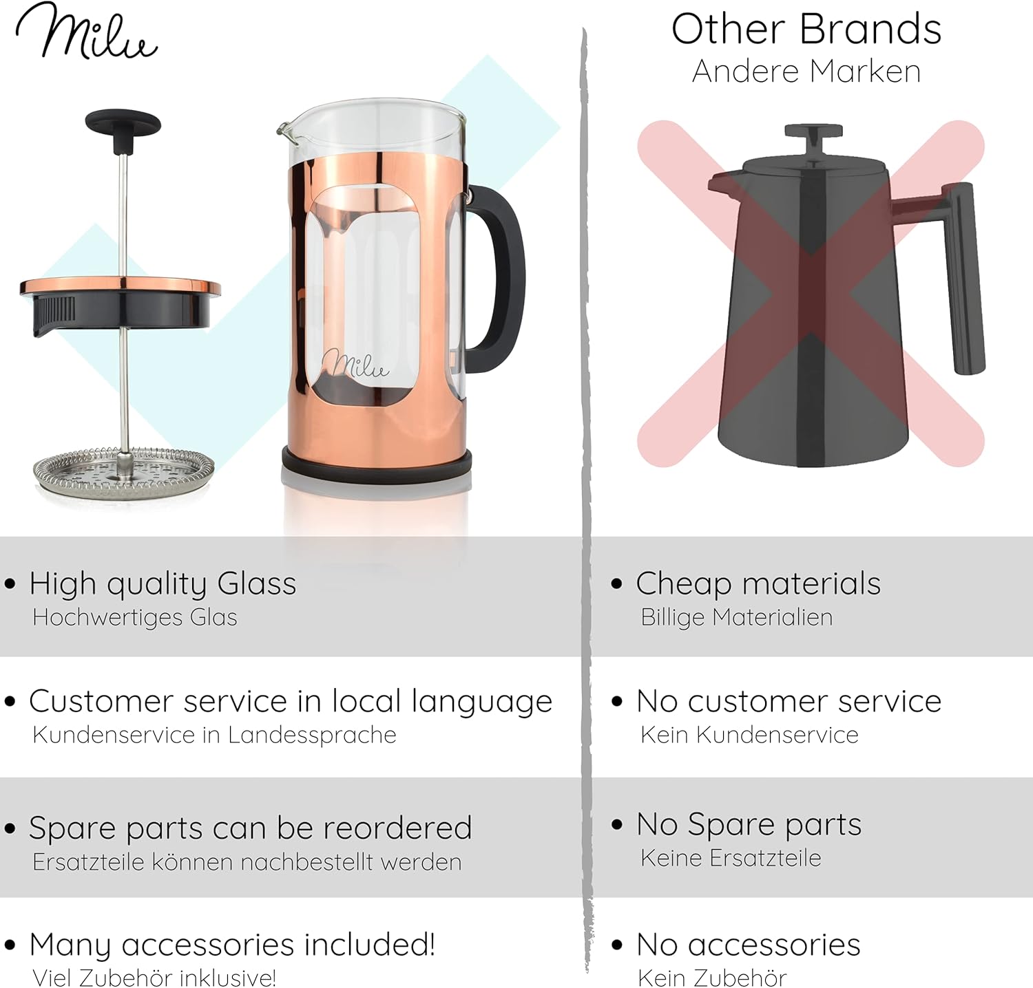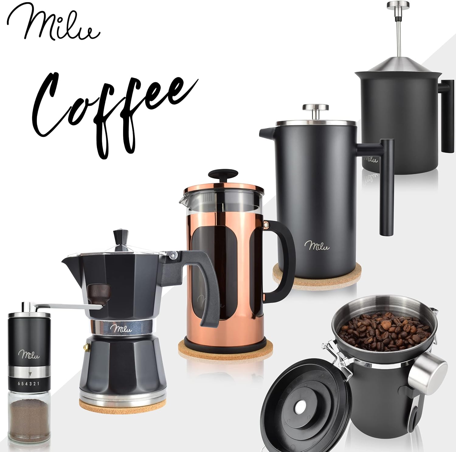 • У дома и в движение: нечупливото стъкло в пластмасов корпус прави вашата френска преса Milu не само истинска забележителност във вашата кухня, но и много здрава за вашите приключения и екскурзии.
