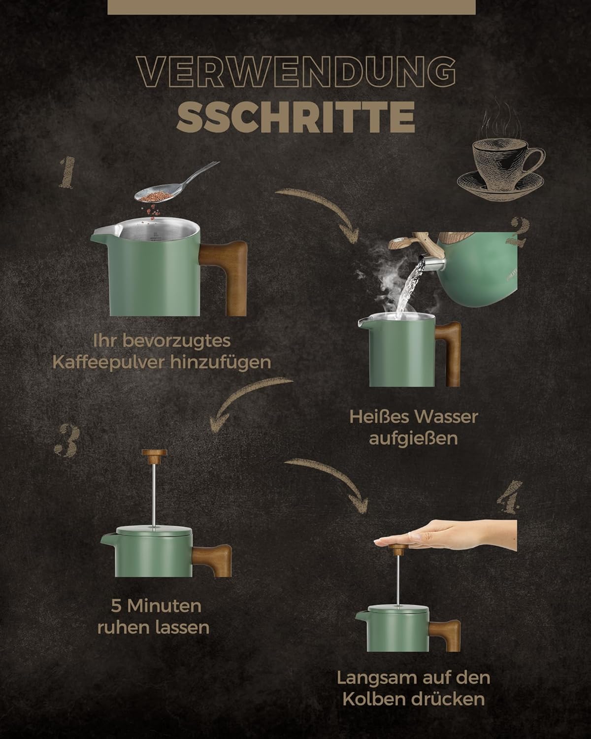 • Перфектни подаръци: Идеална като машина за кафе или чай. Подходяща също за горещо мляко, шоколад, плодов чай, лимонада. Независимо дали сте у дома или на път, за къмпинг, пътуване или пикник, тази преса за кафе е незаменим спътник. Идеален подарък за всички любители на кафето, любители на „Направи си сам“ и здравословни гастрономи!