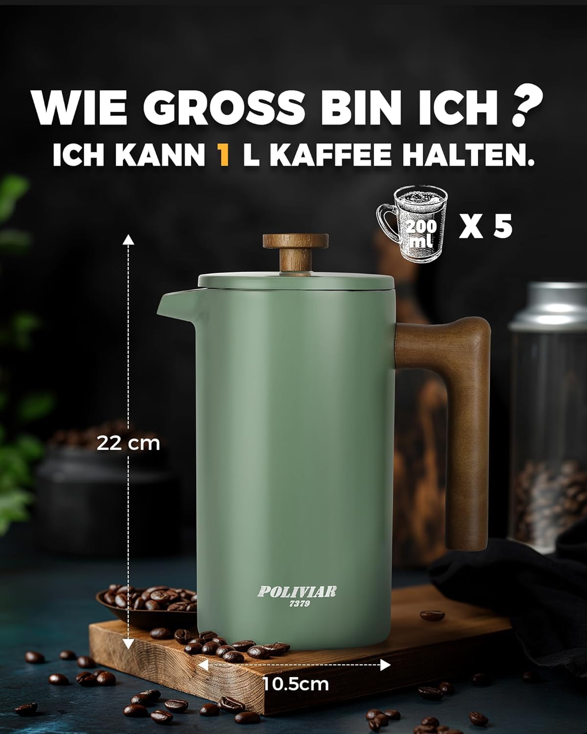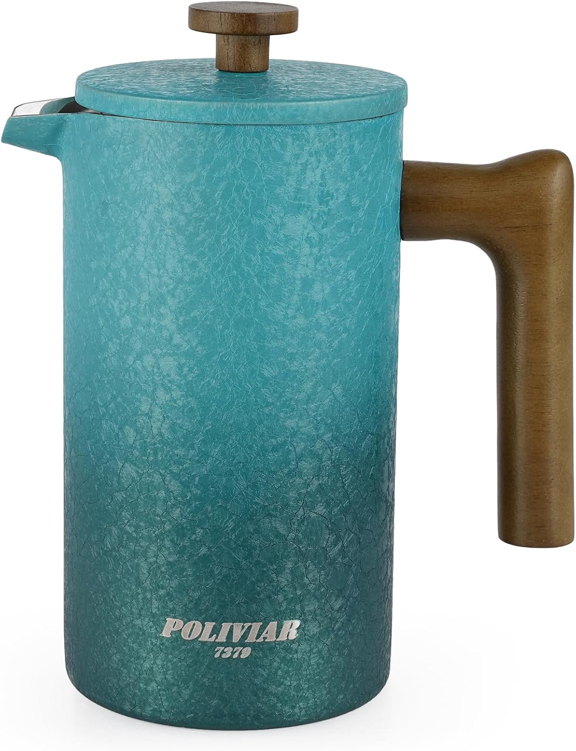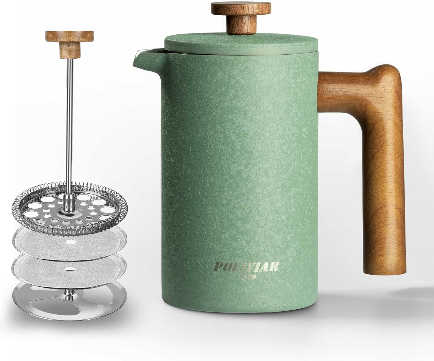 Кафемашина Poliviar French Press 1 литър / 8 чаши, двустенна изолирана кана за кафе и чай, ръчна филтърна преса за кафе с бутало и дървена дръжка, Flatland (зелена) JX2020-FPN-DE