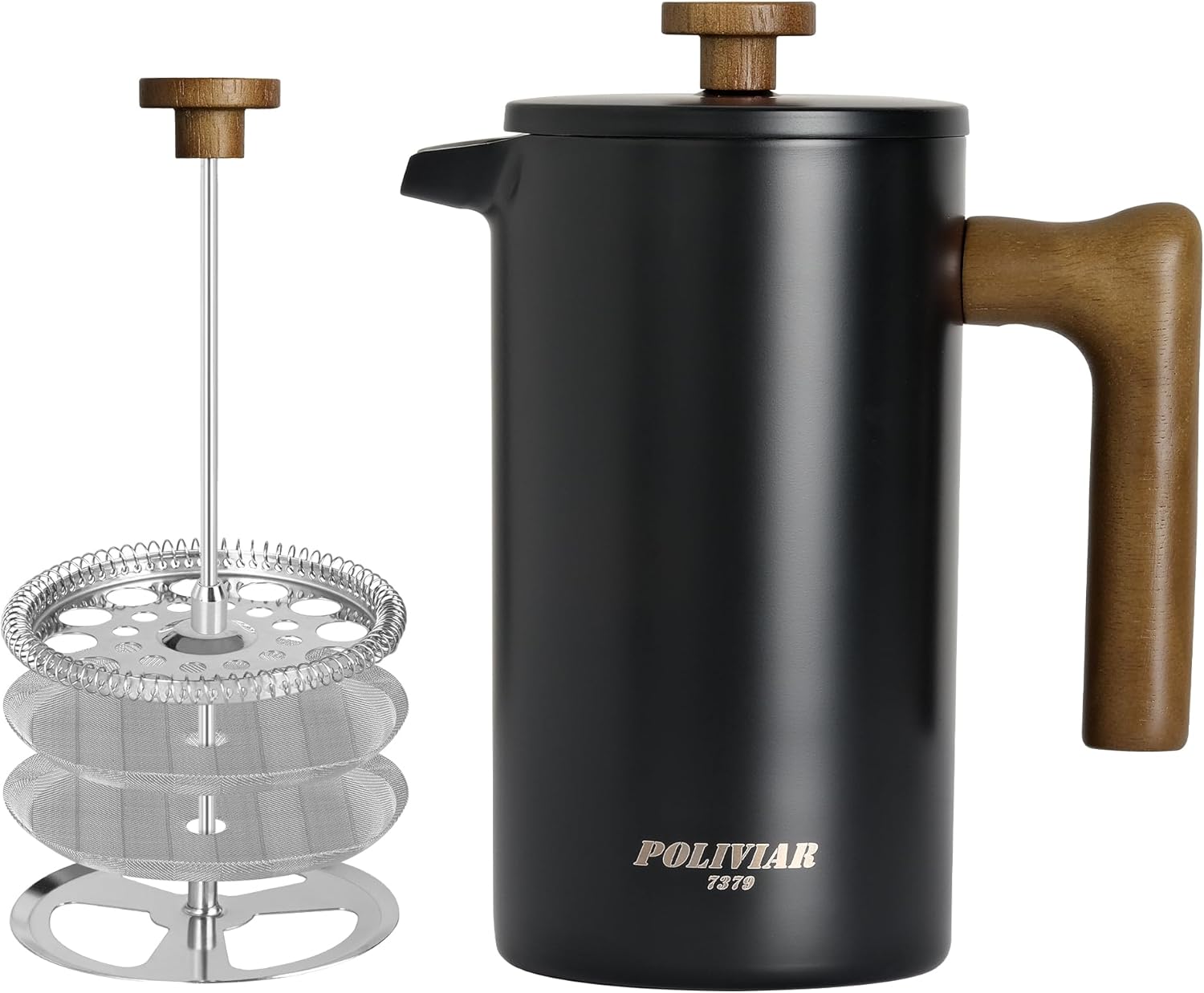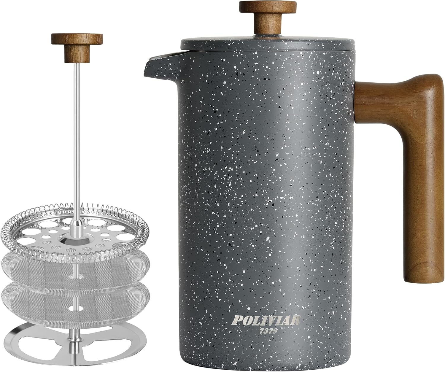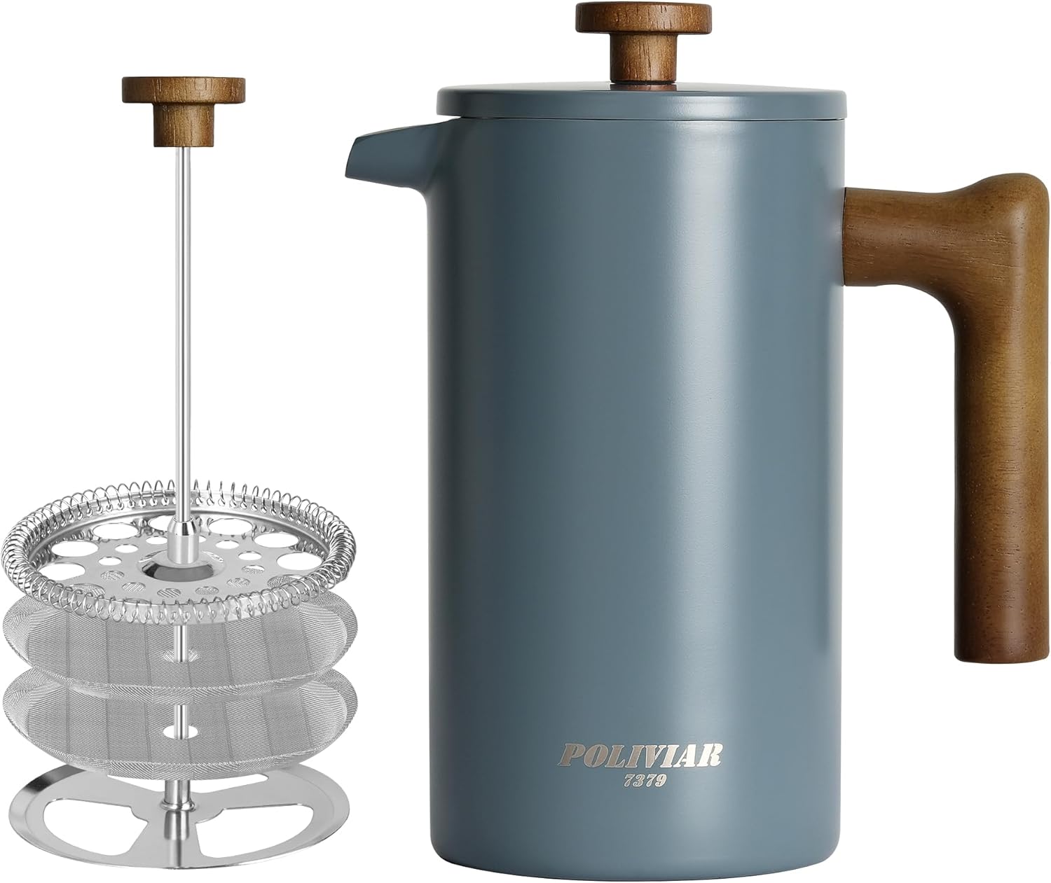 Кафемашина Poliviar French Press 1 литър / 8 чаши, двустенна изолирана кана за кафе и чай, ръчна филтърна преса за кафе с бутало и дървена дръжка, Flatland (зелена) JX2020-FPN-DE