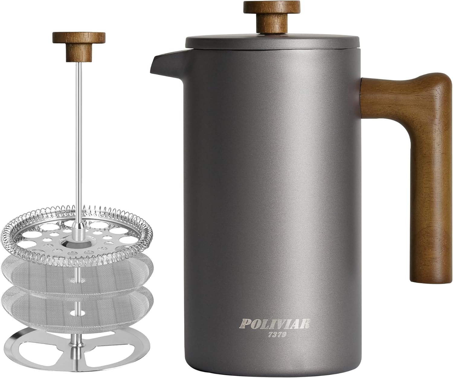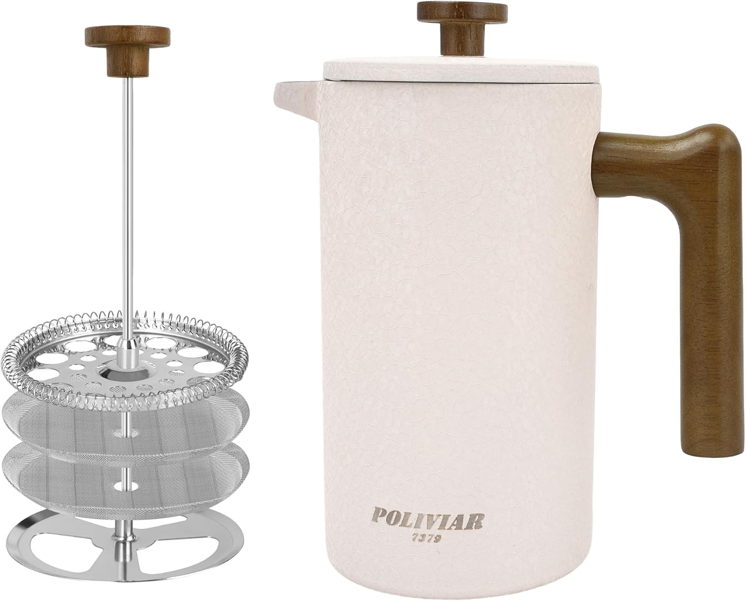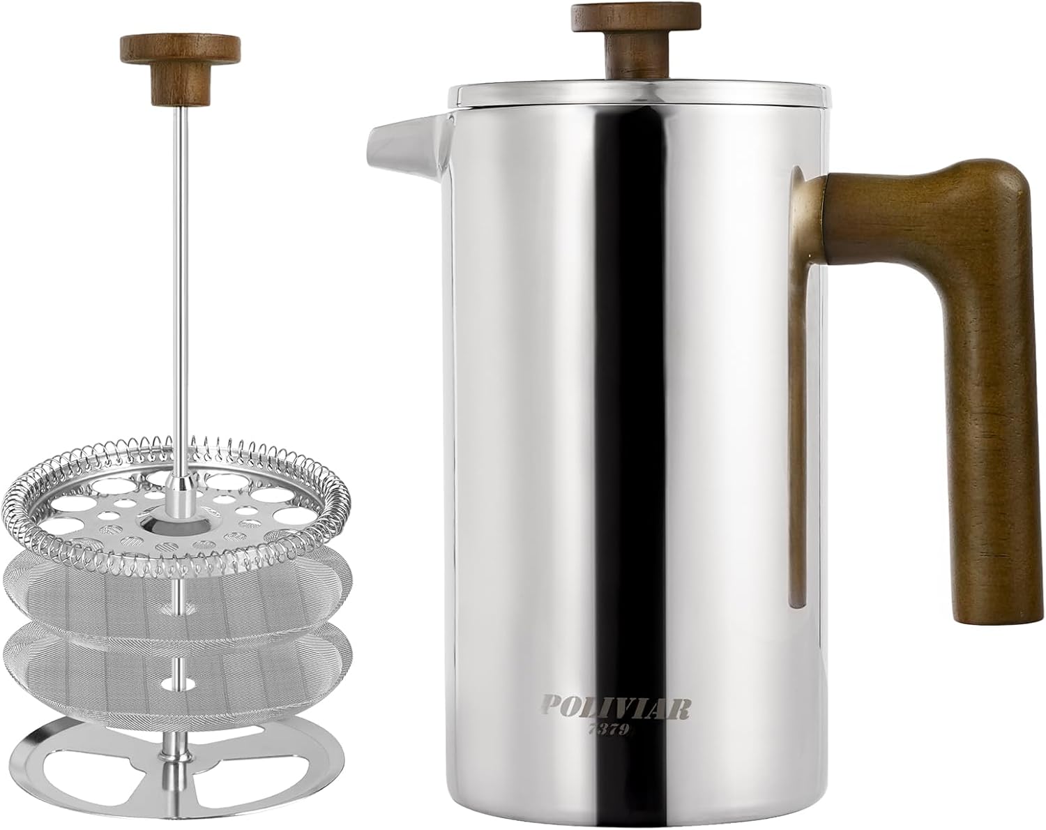 • Изключително издръжлива: Кафемашината Poliviar е изработена от изключително висококачествена неръждаема стомана (304), която е особено издръжлива благодарение на своята здравина и прецизна изработка. В сравнение с други стъклени преси, нашите френски преси от неръждаема стомана са по-безопасни и по-подходящи за употреба на открито.