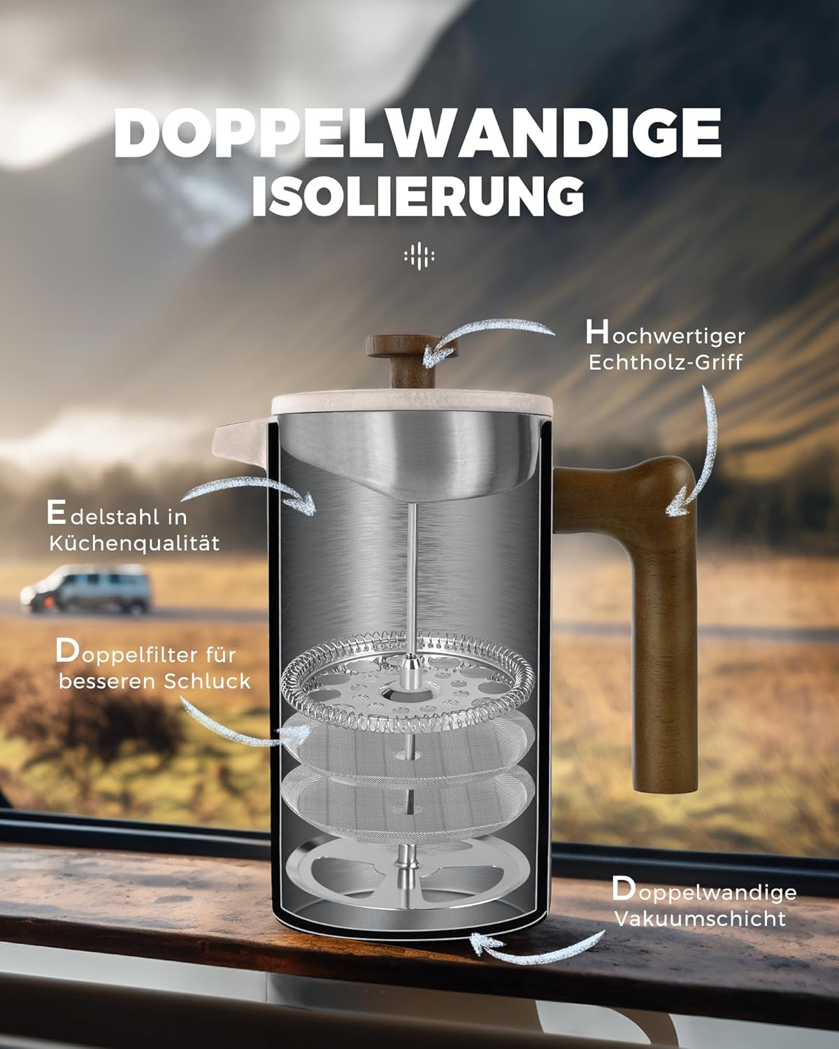• Двустенна изолация: Нашата кафеварка с двуслойна конструкция е изработена от двустенна неръждаема стомана, така че можете да поддържате кафето си топло за по-дълго време, отколкото стъклена френч преса. Средно напитките остават топли за 60 минути по-дълго. Следователно, кафеварката поддържа кафето или чая топли за по-дълго време, като при допир отвън не се усеща твърде горещо.