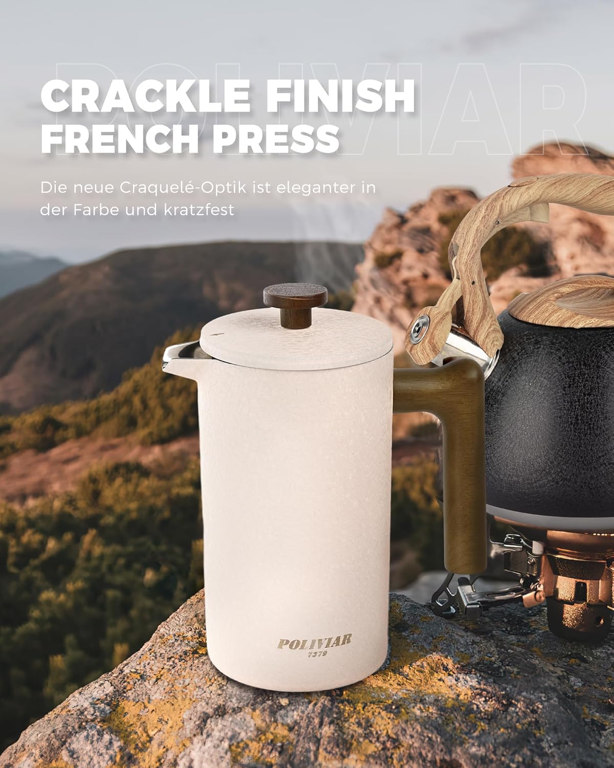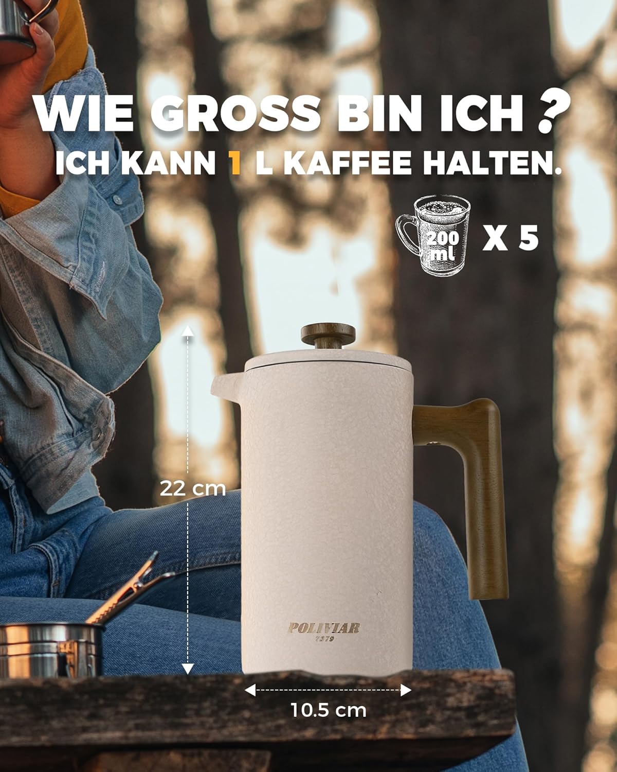 Кафемашина Poliviar French Press 1 литър/8 чаши, двустенна изолирана кана за кафе, ръчна филтърна преса за кафе с бутало и дървена дръжка, плоска (бежова)