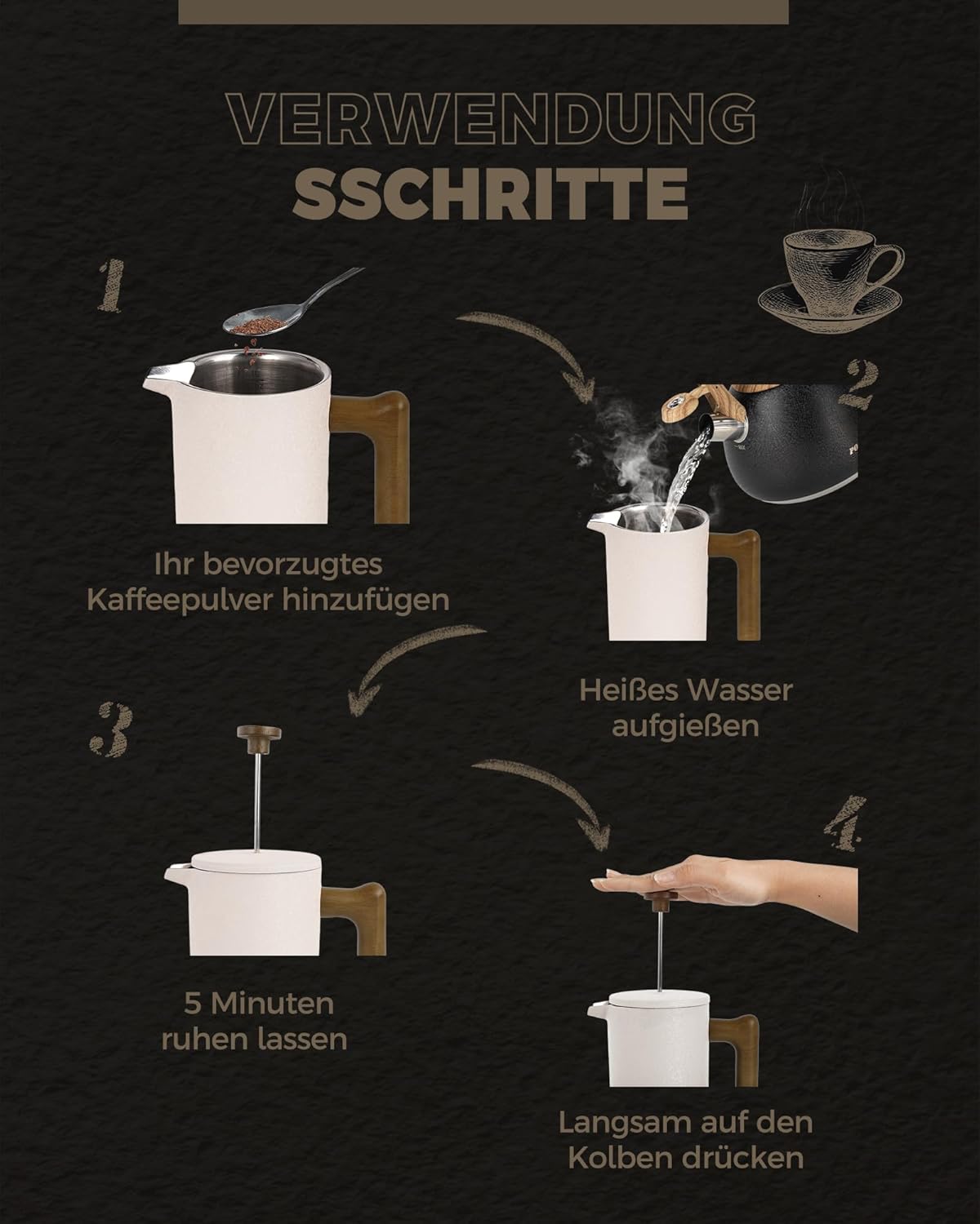 • Перфектни подаръци: Идеална като машина за кафе или чай. Подходяща също за горещо мляко, шоколад, плодов чай, лимонада. Независимо дали сте у дома или на път, за къмпинг, пътуване или пикник, тази преса за кафе е незаменим спътник. Идеален подарък за всички любители на кафето, любители на „Направи си сам“ и здравословни гастрономи!