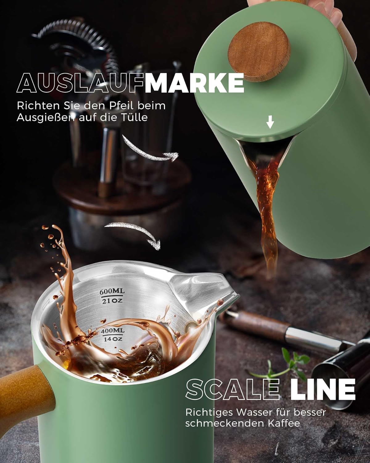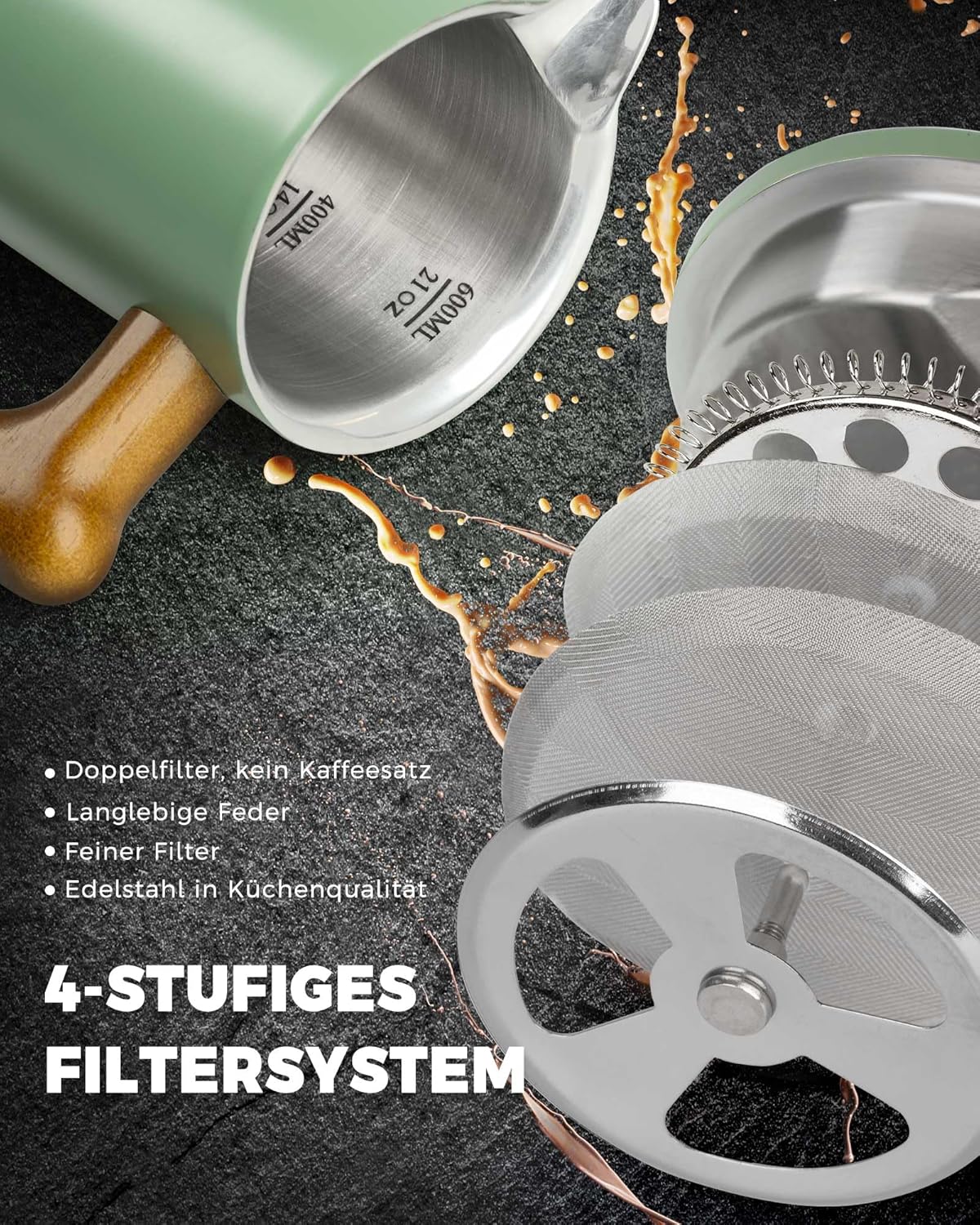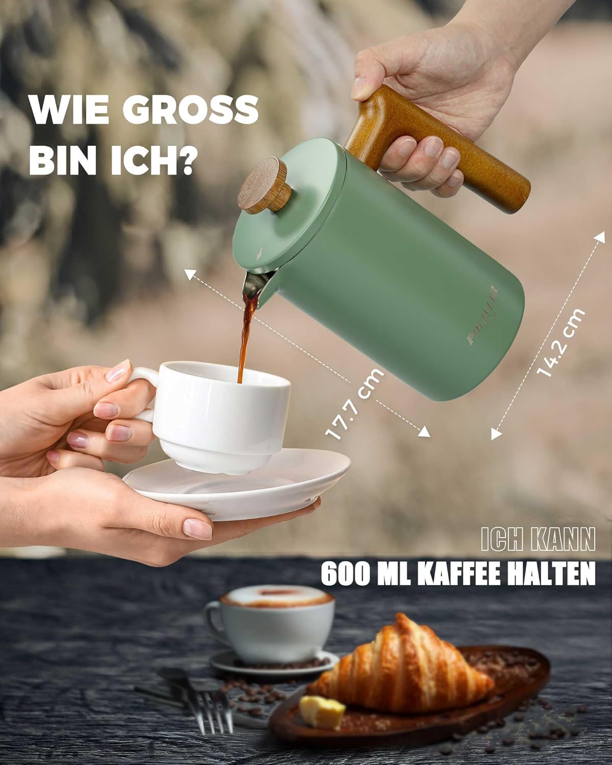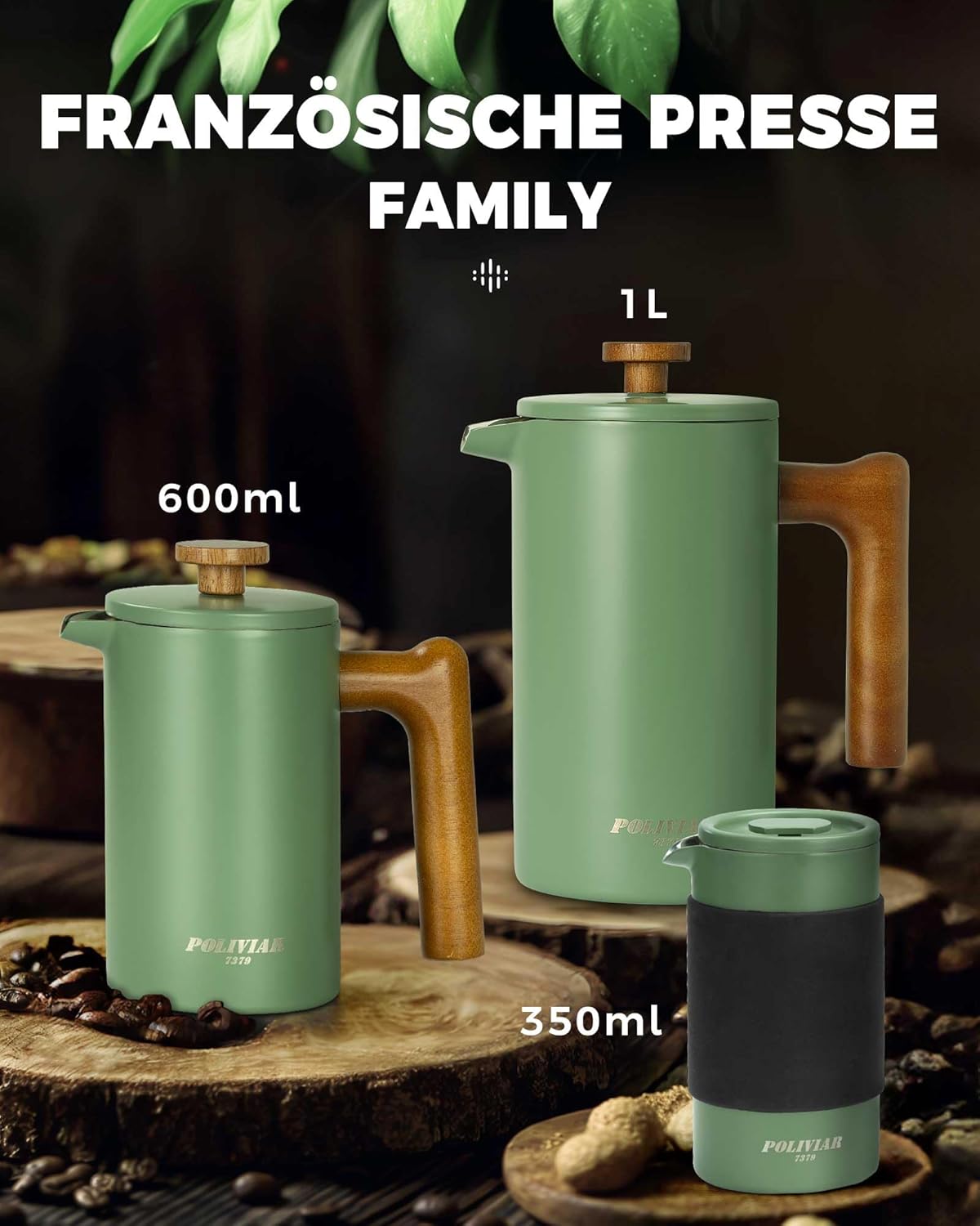 Кафемашина Poliviar French Press 600 мл/21 унции, двустенна изолирана кана за кафе и чай, ръчна филтърна преса за кафе с бутало и дървена дръжка, Flatland (зелена)