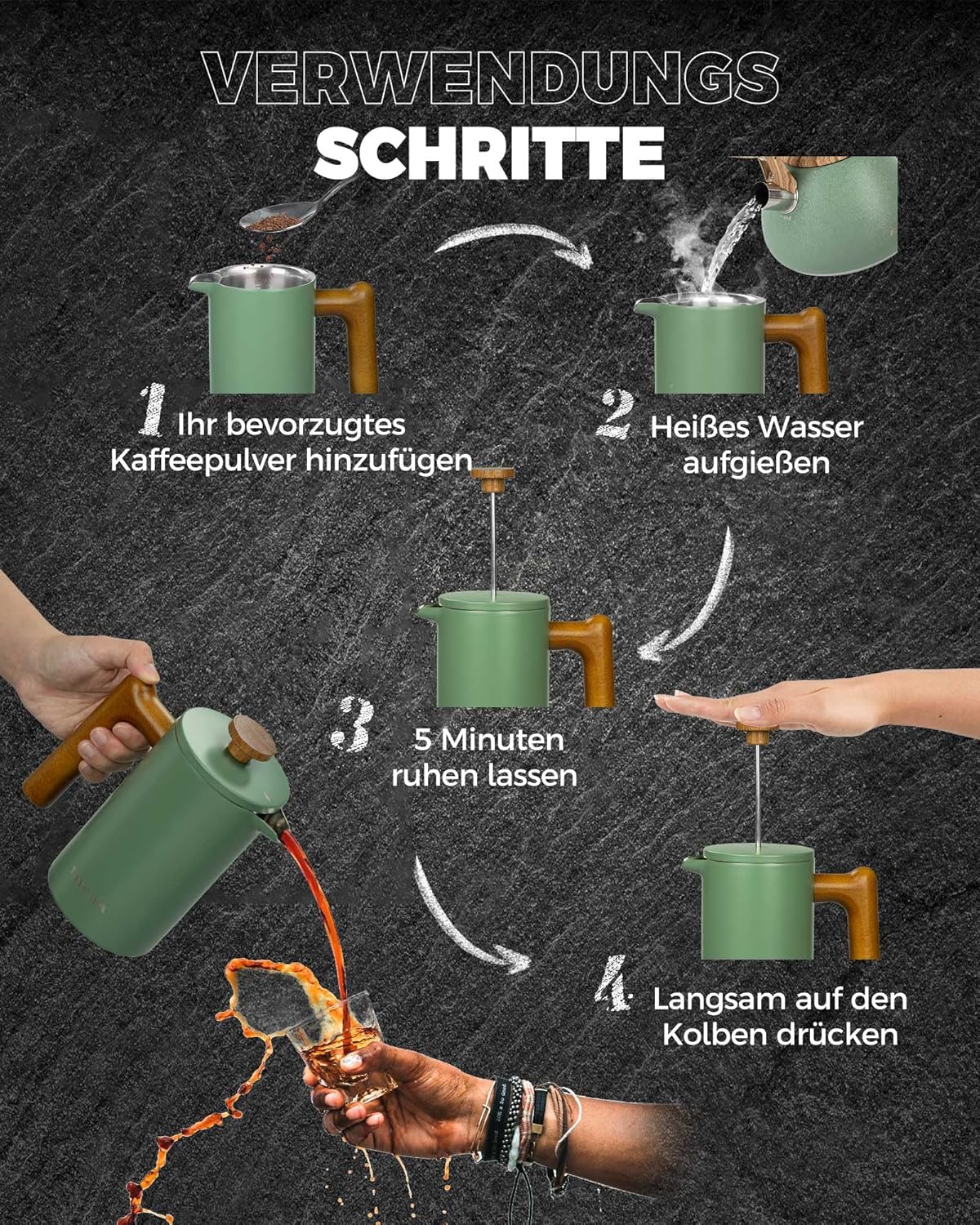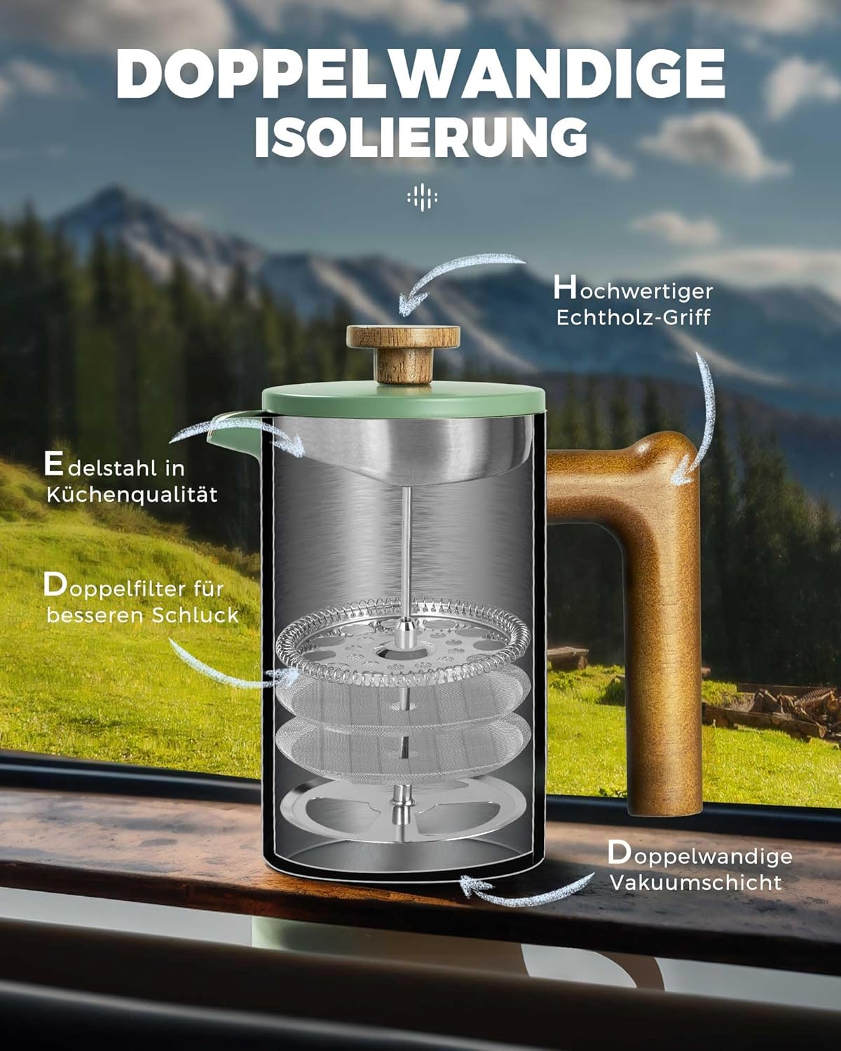 • Двустенна изолация: Нашата кафеварка с двуслойна конструкция е изработена от двустенна неръждаема стомана, така че можете да поддържате кафето си топло за по-дълго време, отколкото стъклена френч преса. Средно напитките остават топли за 60 минути по-дълго. Следователно, кафеварката поддържа кафето или чая топли за по-дълго време, като при допир отвън не се усеща твърде горещо.