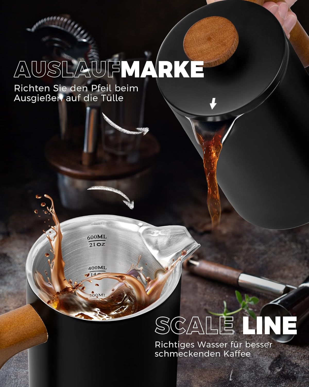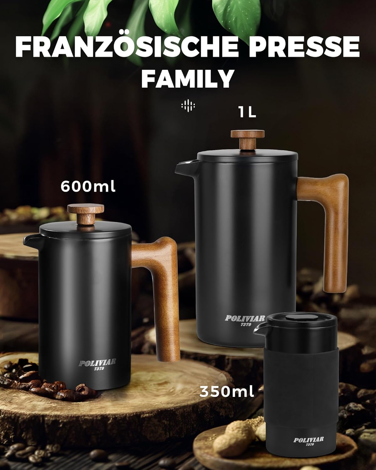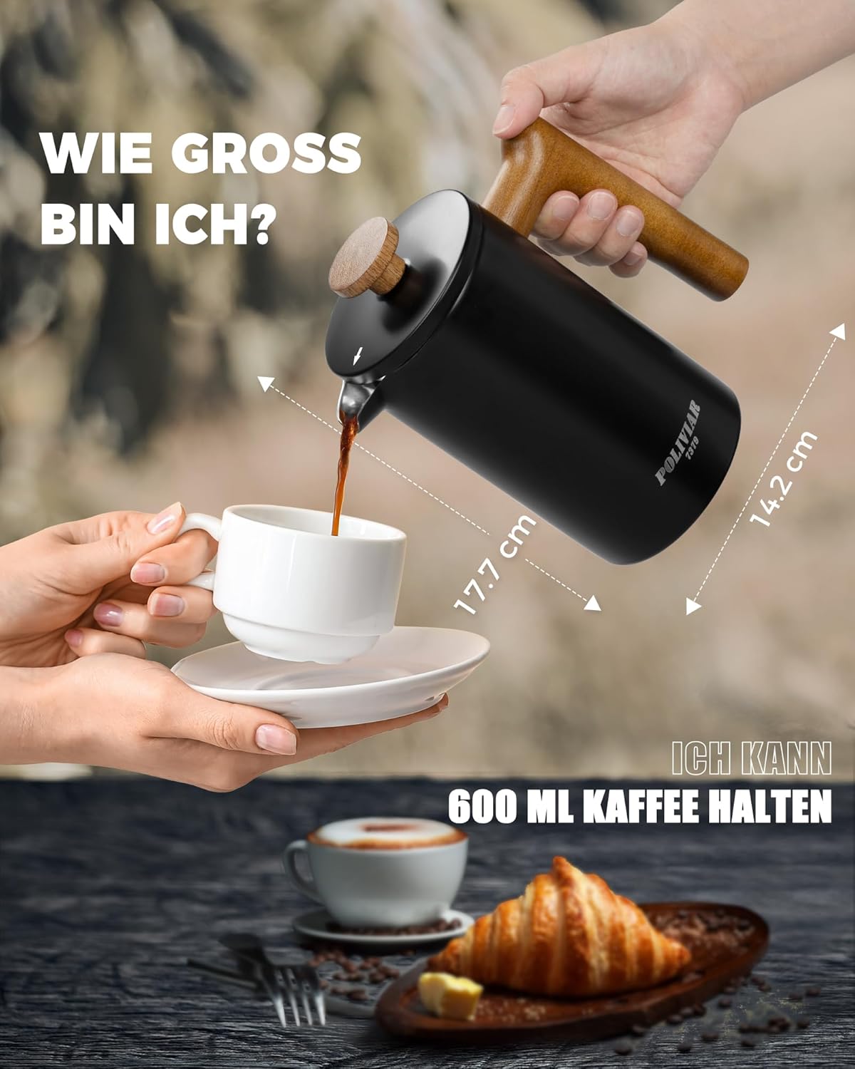 Кафемашина Poliviar French Press 600 мл/21 унции, двустенна изолирана кана за кафе, ръчна филтърна преса за кафе с бутало и дървена дръжка, (черна) JX2024-SFPB-DE
