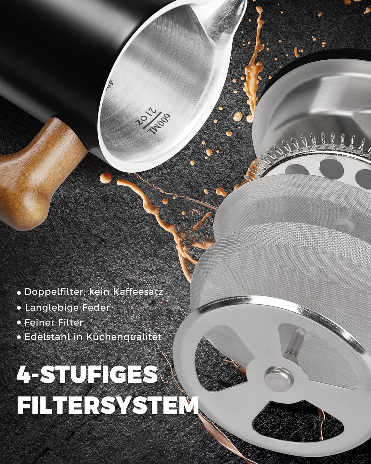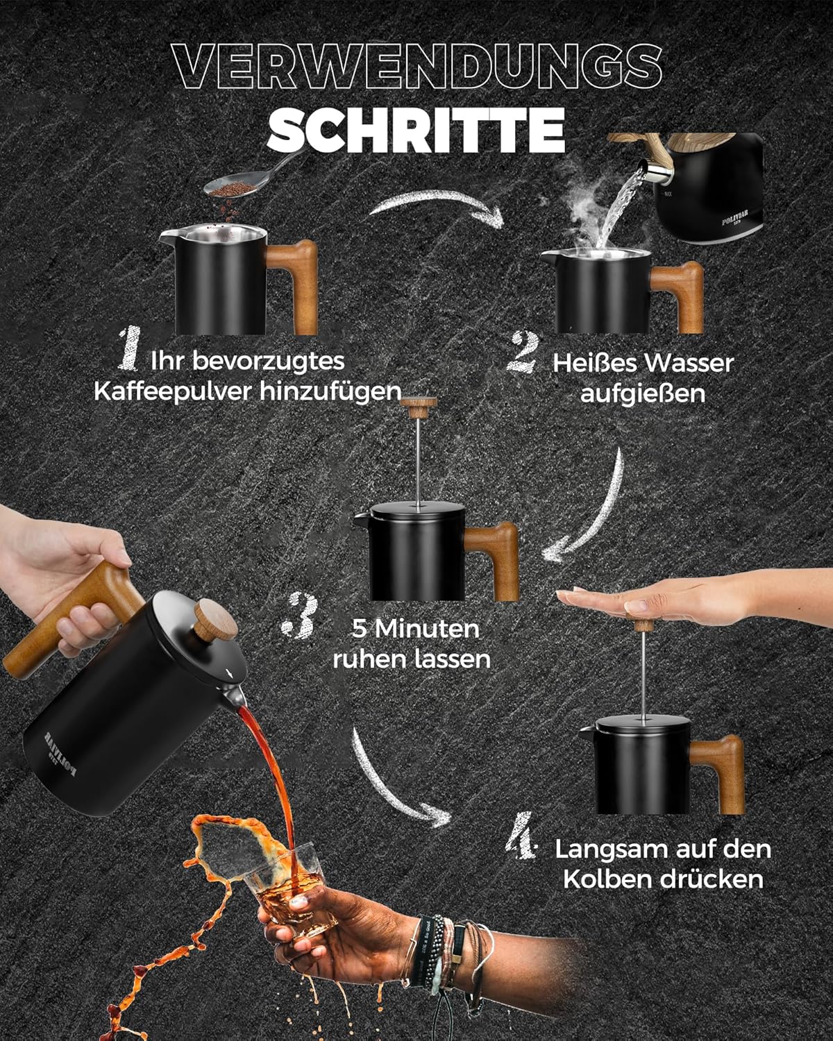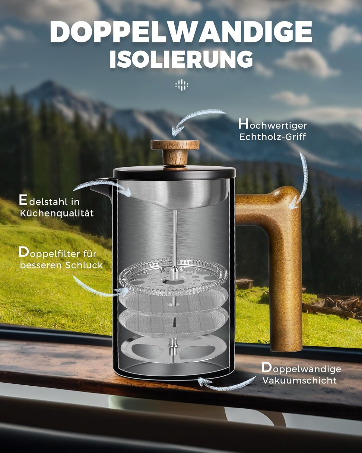 • Двустенна изолация: Нашата кафеварка с двуслойна конструкция е изработена от двустенна неръждаема стомана, така че можете да поддържате кафето си топло за по-дълго време, отколкото стъклена френч преса. Средно напитките остават топли за 60 минути по-дълго. Следователно, кафеварката поддържа кафето или чая топли за по-дълго време, като при допир отвън не се усеща твърде горещо.
