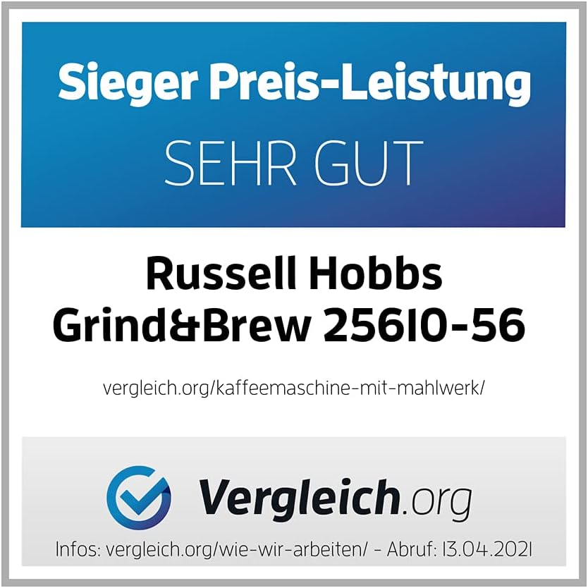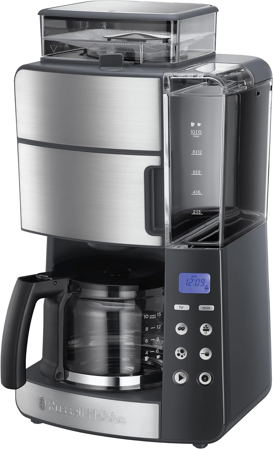 Кафемашина Russell Hobbs Grind & Brew 25610-56 с мелачка, стъклена кана за до 10 чаши, дигитален програмируем таймер, 3 степени на смилане, 1000 W, филтърна кафемашина за кафе на зърна, сива