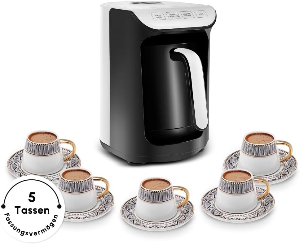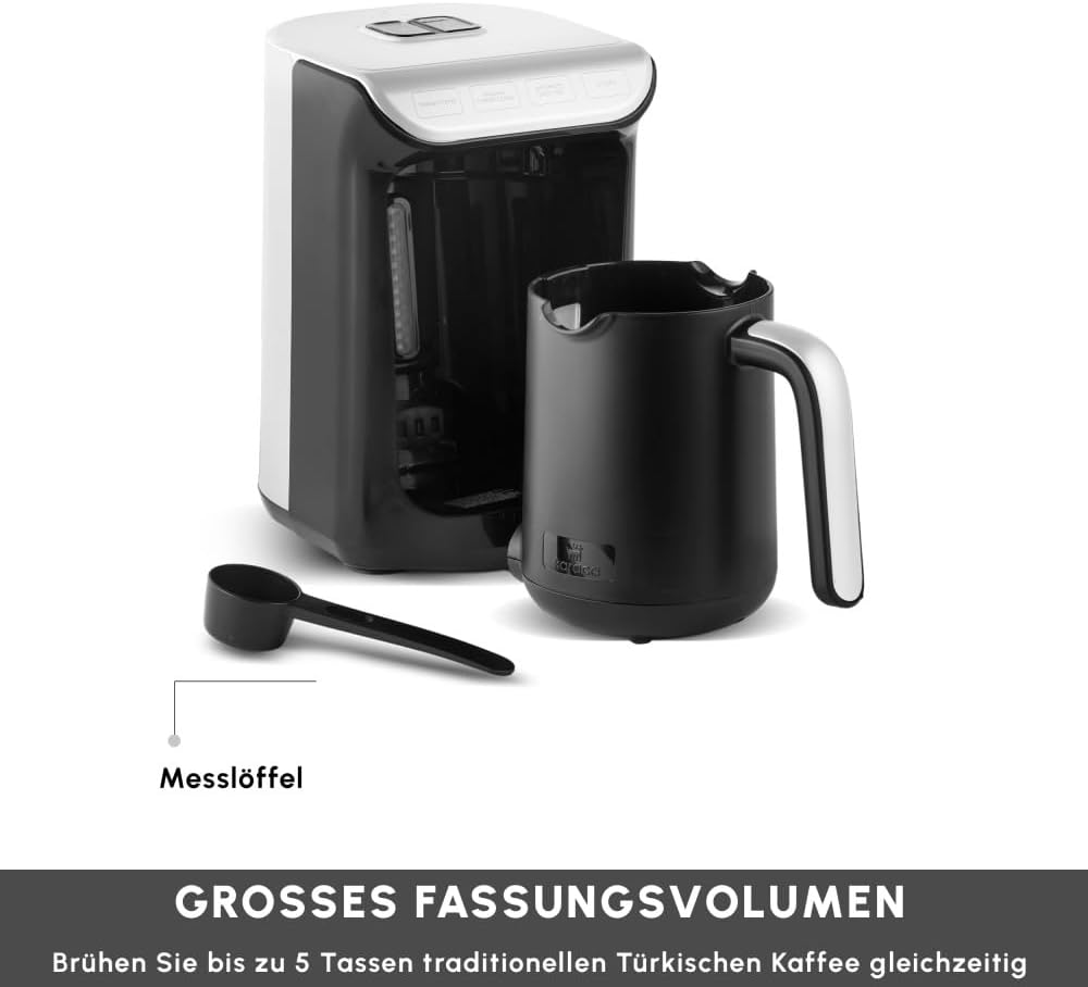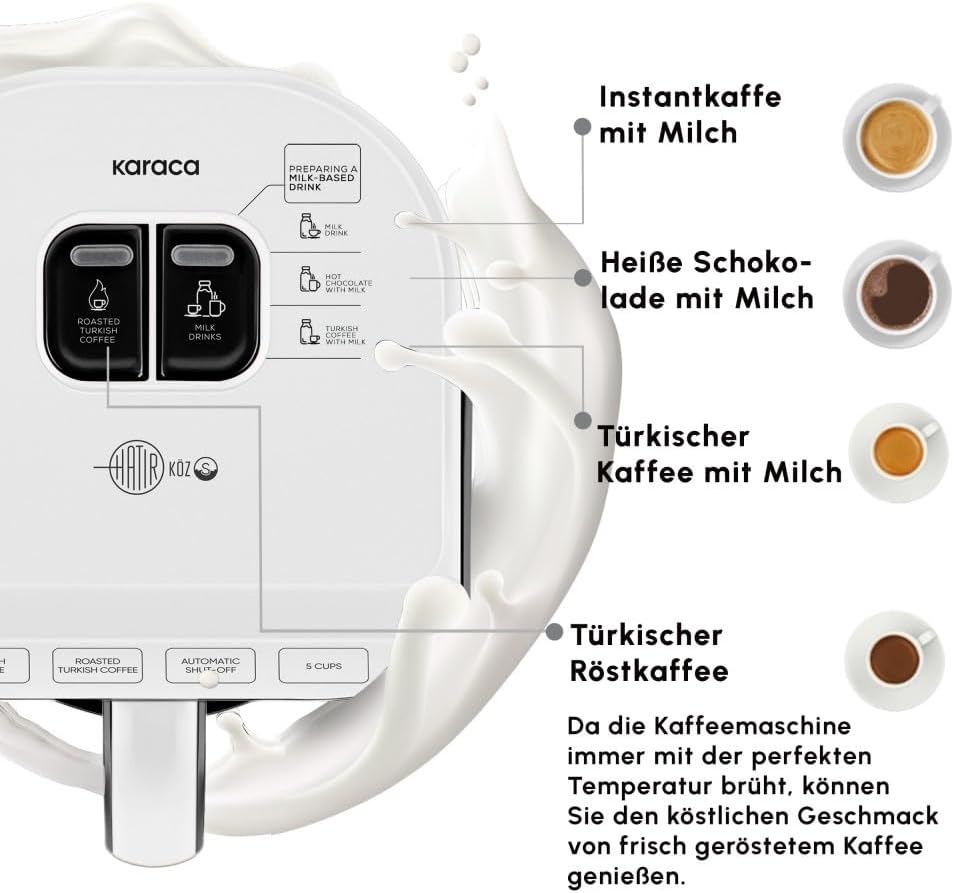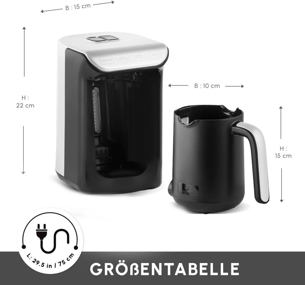 KARACA Hatır машина за печено турско кафе, гланцово черно, голям капацитет: Кафемашината Hatir Köz побира до 5 чаши кафе от 60 мл или 300 мл за по-големи количества. Турското кафе, съгласно вековните традиции, е част от културното наследство на ЮНЕСКО. Изживейте най-доброто от двата свята, благодарение на функцията за приготвяне на традиционно турско кафе, както и на печено турско кафе, което осигурява по-интензивно и плътно вкусово изживяване - всичко това само с една иновативна машина. МОЩНА ПРОИЗВОДИТЕЛНОСТ С мощност на нагряване от 535 вата, нашата кафемашина Hatır Köz осигурява бърз и равномерен резултат приготвяне по всяко време. Автоматичен контрол на температурата: винаги се наслаждавайте на перфектно приготвено кафе благодарение на автоматичната настройка на температурата, която гарантира оптимални условия за приготвяне. ПРЕЦИЗНО И ЛЕСНО ПРИГОТВЯНЕ - Включената специална мерителна лъжичка опростява приготвянето на кафе и гарантира, че добавяте точното количество кафе за постоянно ароматно изживяване. Можете също така да се насладите на удобството на двустранния наливател, който е подходящ както за левичари, така и за десничари и прави наливането много по-лесно.