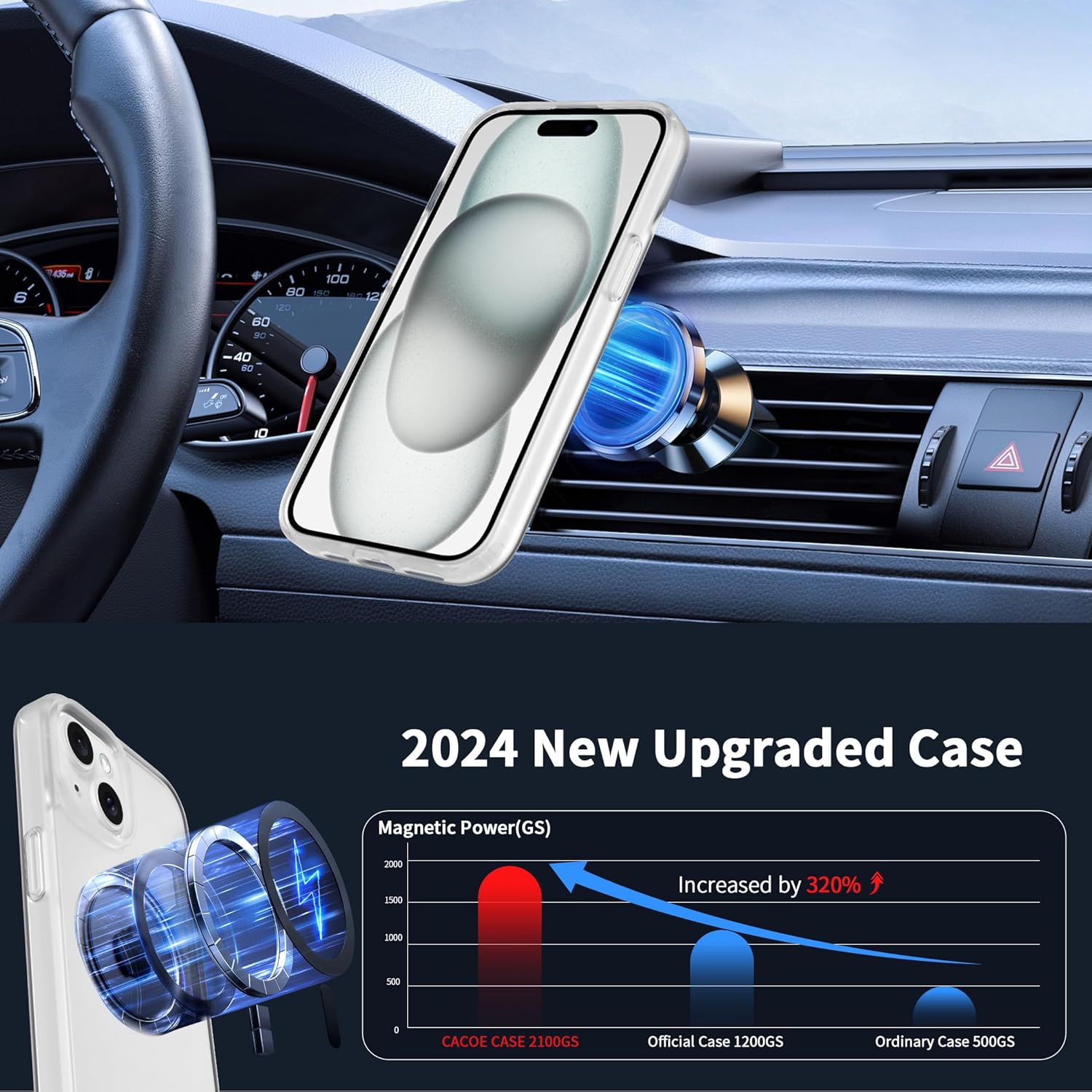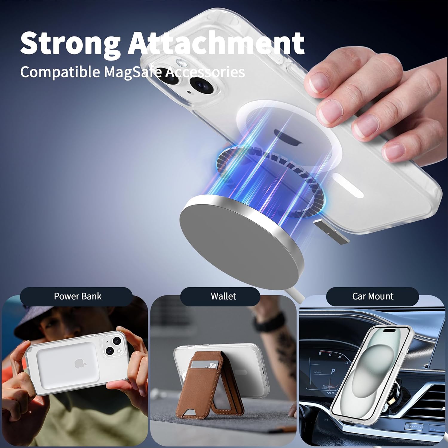 • Силен магнетизъм: Магнитният калъф за iPhone 15 е оборудван с 37 свръхсилни магнита N52, чиято магнитна сила е 2400 GS – седем пъти по-силна от тази на обикновените магнити. Следователно, той няма да падне, дори ако го разклатите енергично по време на зареждане. Съвместим е с MagSafe, магнитни портфейли, магнитни стойки за кола и магнитни зарядни устройства.
