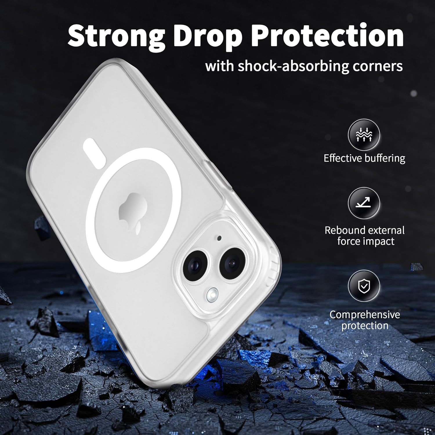 • Защита от 3 м, отговаряща на военни стандарти: Преминава тестове за падане и може да издържи на падания от височина до 3 м. Този матов заден капак за iPhone 15 е изработен от твърд поликарбонат (PC) с гъвкави, абсорбиращи ударите термопластични полиуретанови (TPU) подложки по краищата и разполага с четири въздушни възглавници в ъглите, които абсорбират ударите, предотвратявайки случайни падания, сблъсъци и надрасквания.