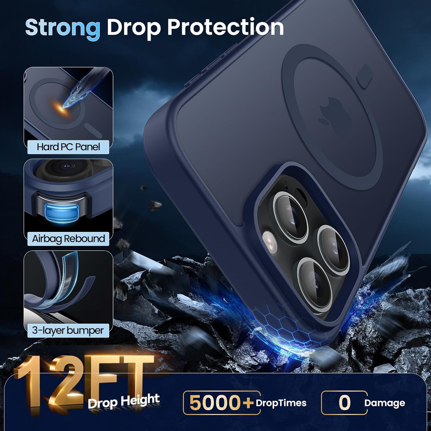 • Защита от 3 м, отговаряща на военни стандарти: Преминава тестове за падане и може да издържи на падания от височина до 3 м. Този матов заден капак за iPhone 15 е изработен от твърд поликарбонат (PC) с гъвкави, абсорбиращи ударите термопластични полиуретанови (TPU) подложки по краищата и разполага с четири въздушни възглавници в ъглите, които абсорбират ударите, предотвратявайки случайни падания, сблъсъци и надрасквания.