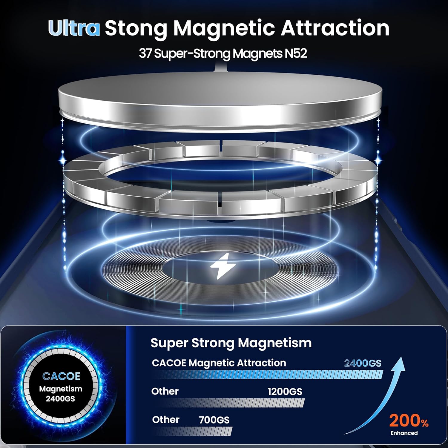 • Силен магнетизъм: Магнитният калъф за iPhone 15 е оборудван с 37 свръхсилни магнита N52, чиято магнитна сила е 2400 GS – седем пъти по-силна от тази на обикновените магнити. Следователно, той няма да падне, дори ако го разклатите енергично по време на зареждане. Съвместим е с MagSafe, магнитни портфейли, магнитни стойки за кола и магнитни зарядни устройства.