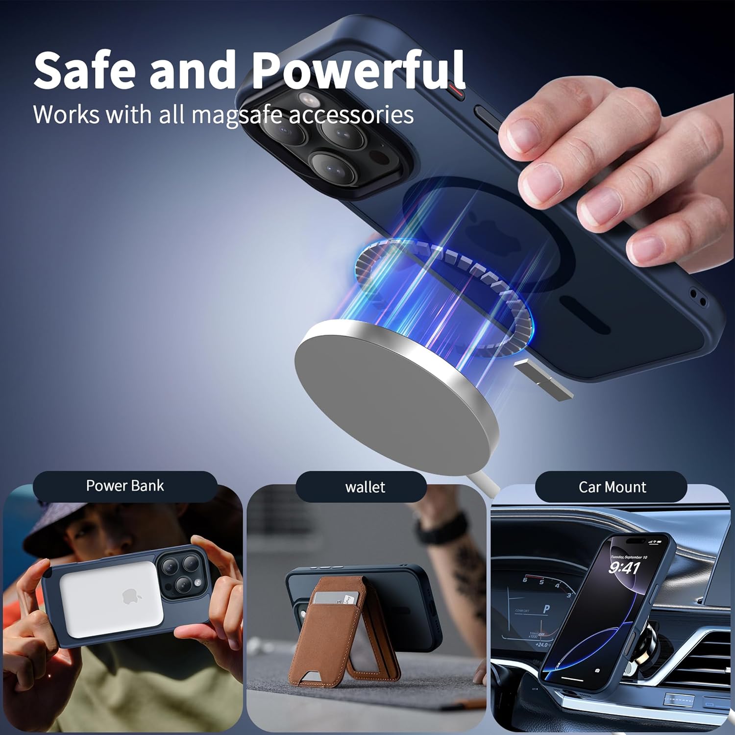 • Силен магнетизъм: Магнитният калъф за iPhone 15 е оборудван с 37 свръхсилни магнита N52, чиято магнитна сила е 2400 GS – седем пъти по-силна от тази на обикновените магнити. Следователно, той няма да падне, дори ако го разклатите енергично по време на зареждане. Съвместим е с MagSafe, магнитни портфейли, магнитни стойки за кола и магнитни зарядни устройства.