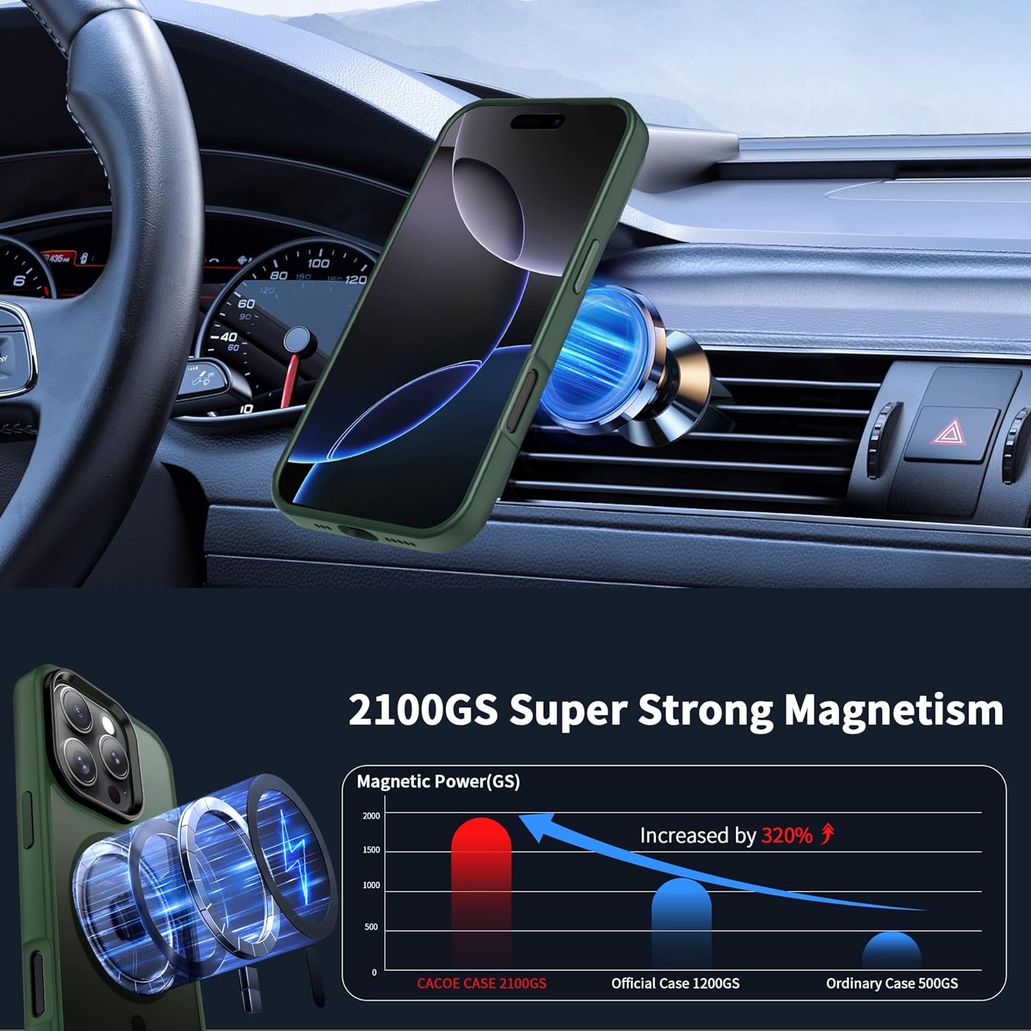 • Силен магнетизъм: Магнитният калъф за iPhone 15 е оборудван с 37 свръхсилни магнита N52, чиято магнитна сила е 2400 GS – седем пъти по-силна от тази на обикновените магнити. Следователно, той няма да падне, дори ако го разклатите енергично по време на зареждане. Съвместим е с MagSafe, магнитни портфейли, магнитни стойки за кола и магнитни зарядни устройства.