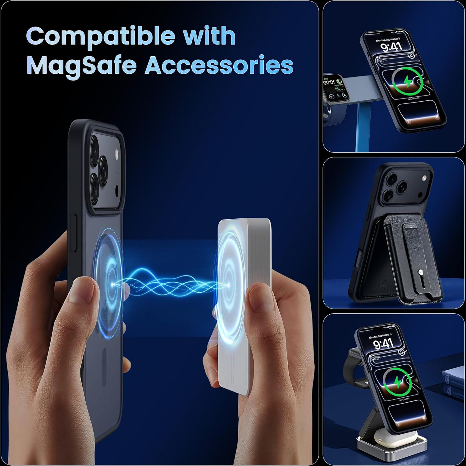 • Силен магнетизъм: Магнитният калъф за iPhone 15 е оборудван с 37 свръхсилни магнита N52, чиято магнитна сила е 2400 GS – седем пъти по-силна от тази на обикновените магнити. Следователно, той няма да падне, дори ако го разклатите енергично по време на зареждане. Съвместим е с MagSafe, магнитни портфейли, магнитни стойки за кола и магнитни зарядни устройства.