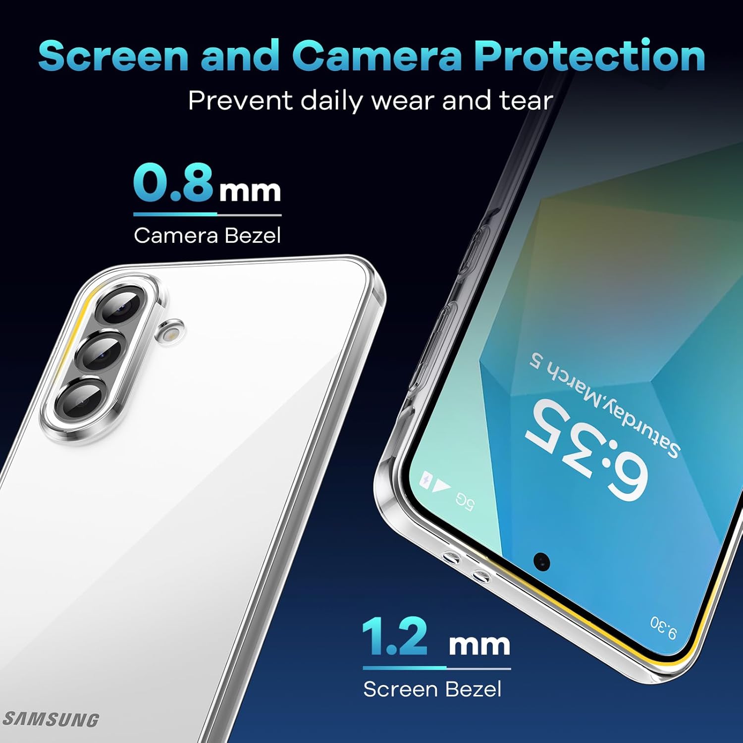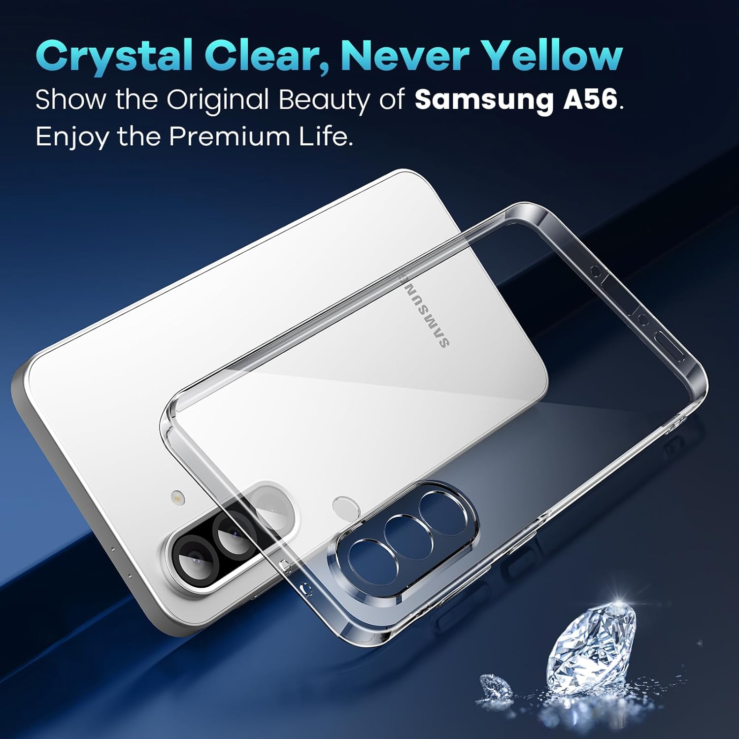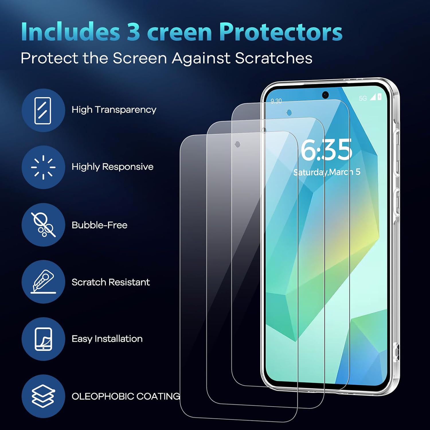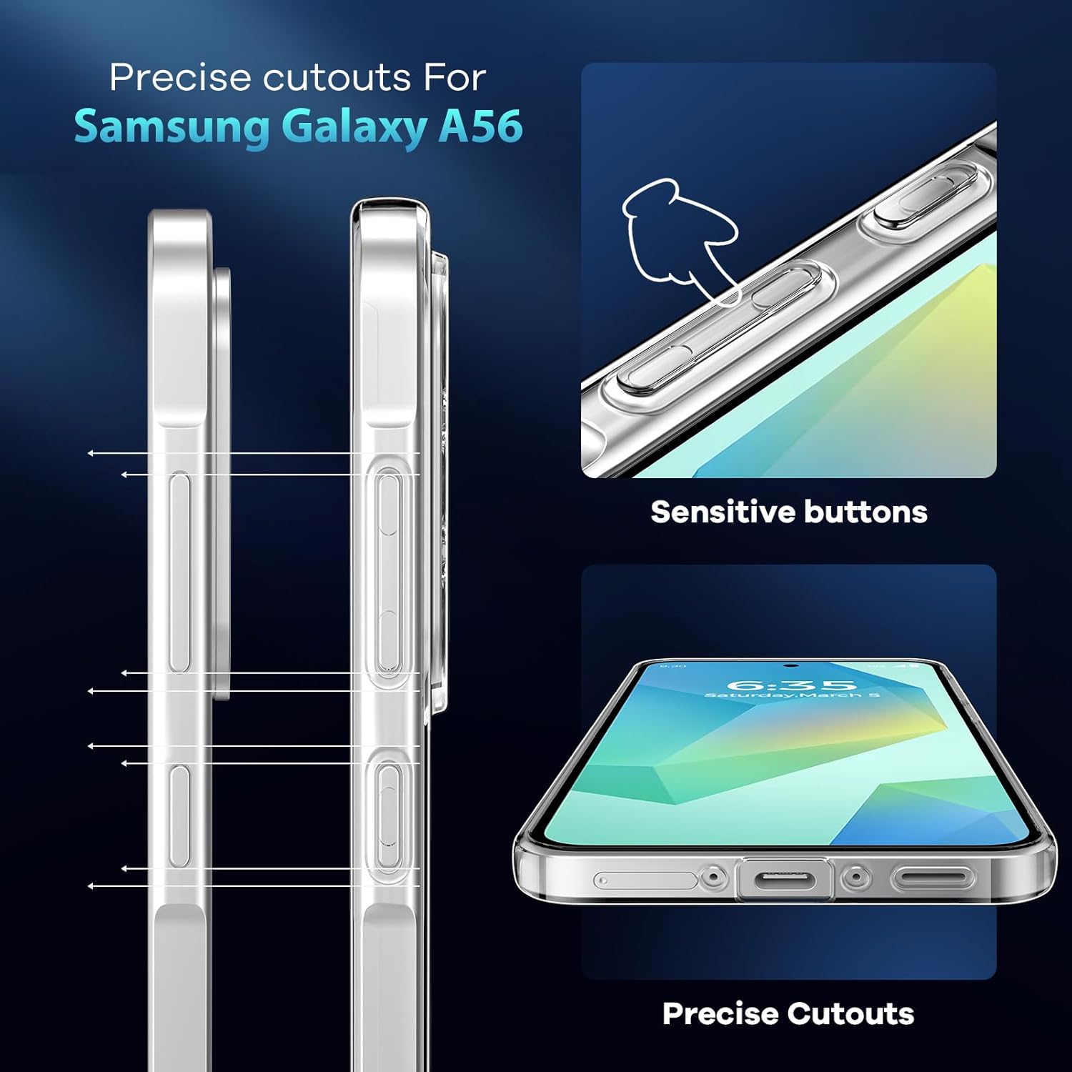 • Съвместим със Samsung Galaxy A56: Този прозрачен калъф с 3 протектора от закалено стъкло за екрана е съвместим със Samsung Galaxy A56, който подчертава оригиналната линия и оригиналния дизайн на вашия телефон. Моля, потвърдете модела на телефона преди покупка. Прозрачният калъф ви позволява да се насладите на оригиналната красота на вашето устройство.