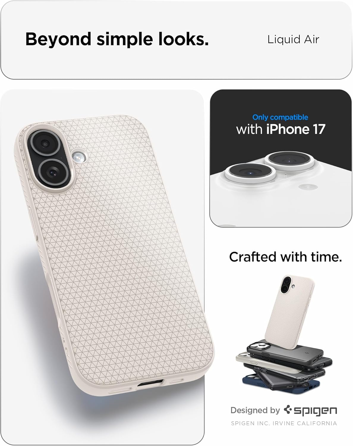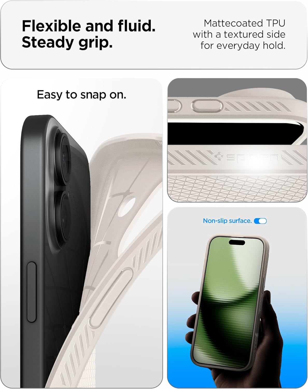 Калъф Spigen за iPhone 17 [Неплъзгащ се] [Обмислени детайли] Тънък TPU калъф Liquid Air с Truss дизайн, военно тествана защита, технология Sound Tunnel Technology, калъф за мобилен телефон - естествен титан