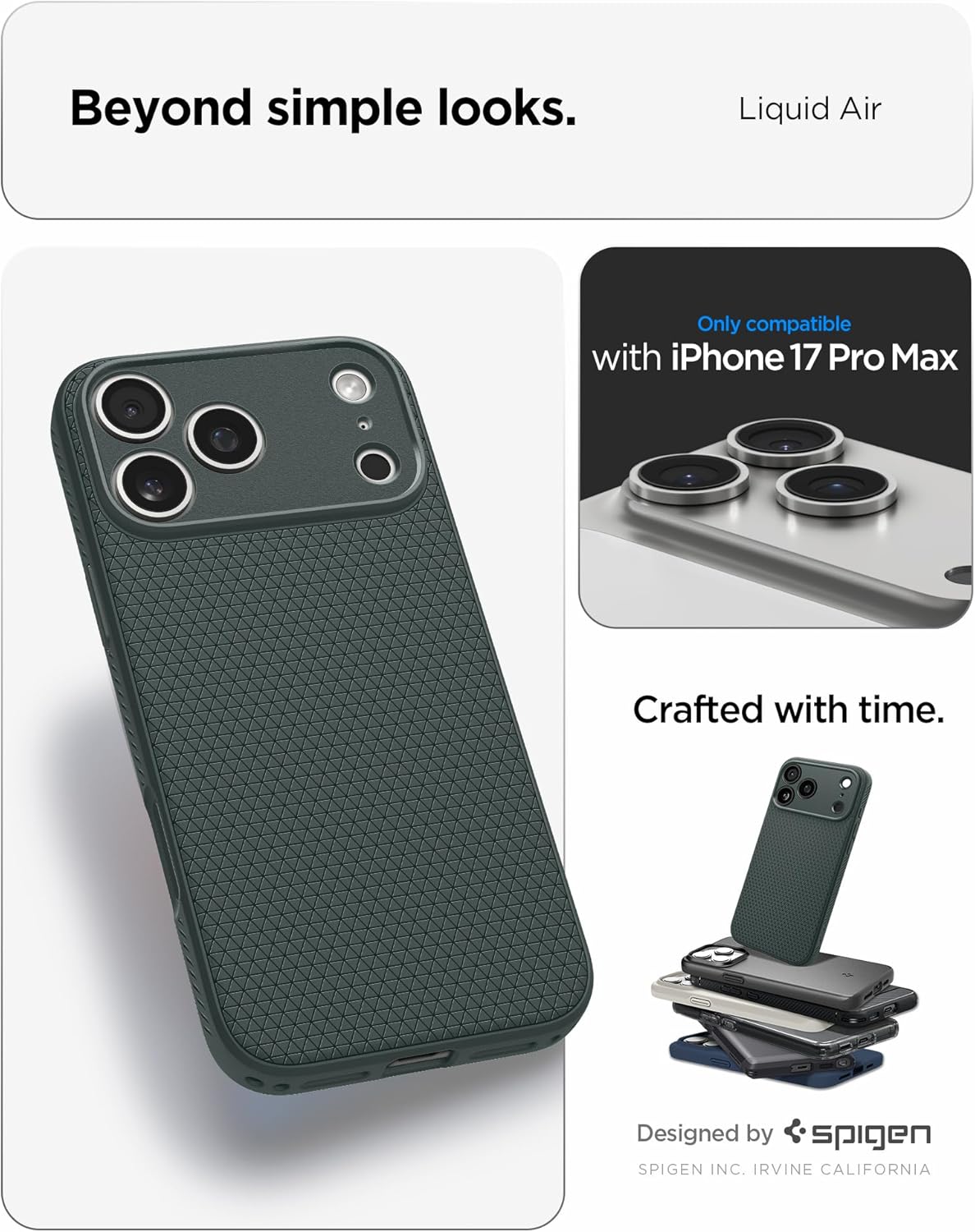 Калъф Spigen за iPhone 17 Pro Max [Неплъзгащ се] [Обмислени детайли] Тънък TPU калъф Liquid Air с Truss дизайн, Военно тествана защита, Технология Sound Tunnel, Калъф за мобилен телефон - Abyss Green
