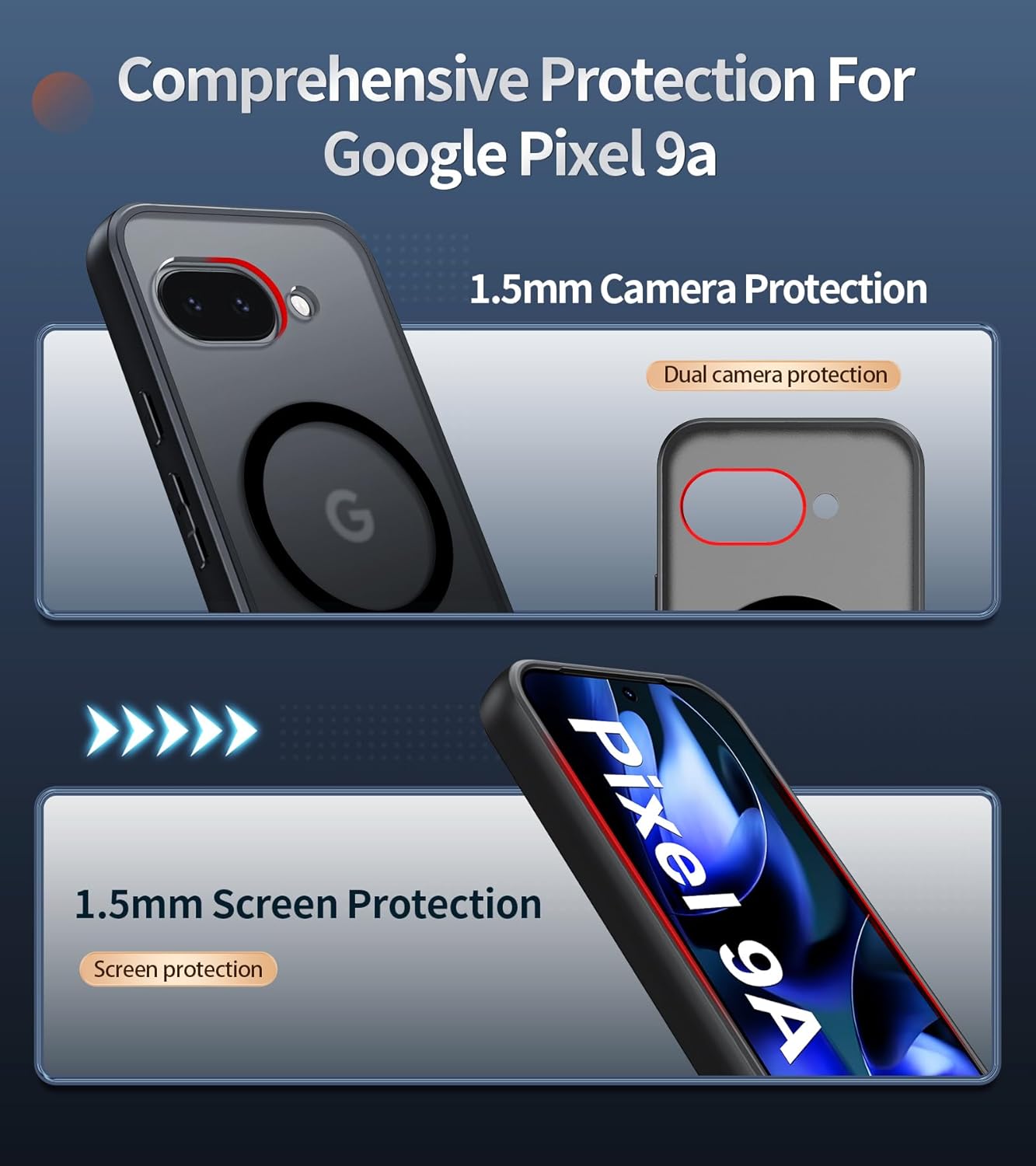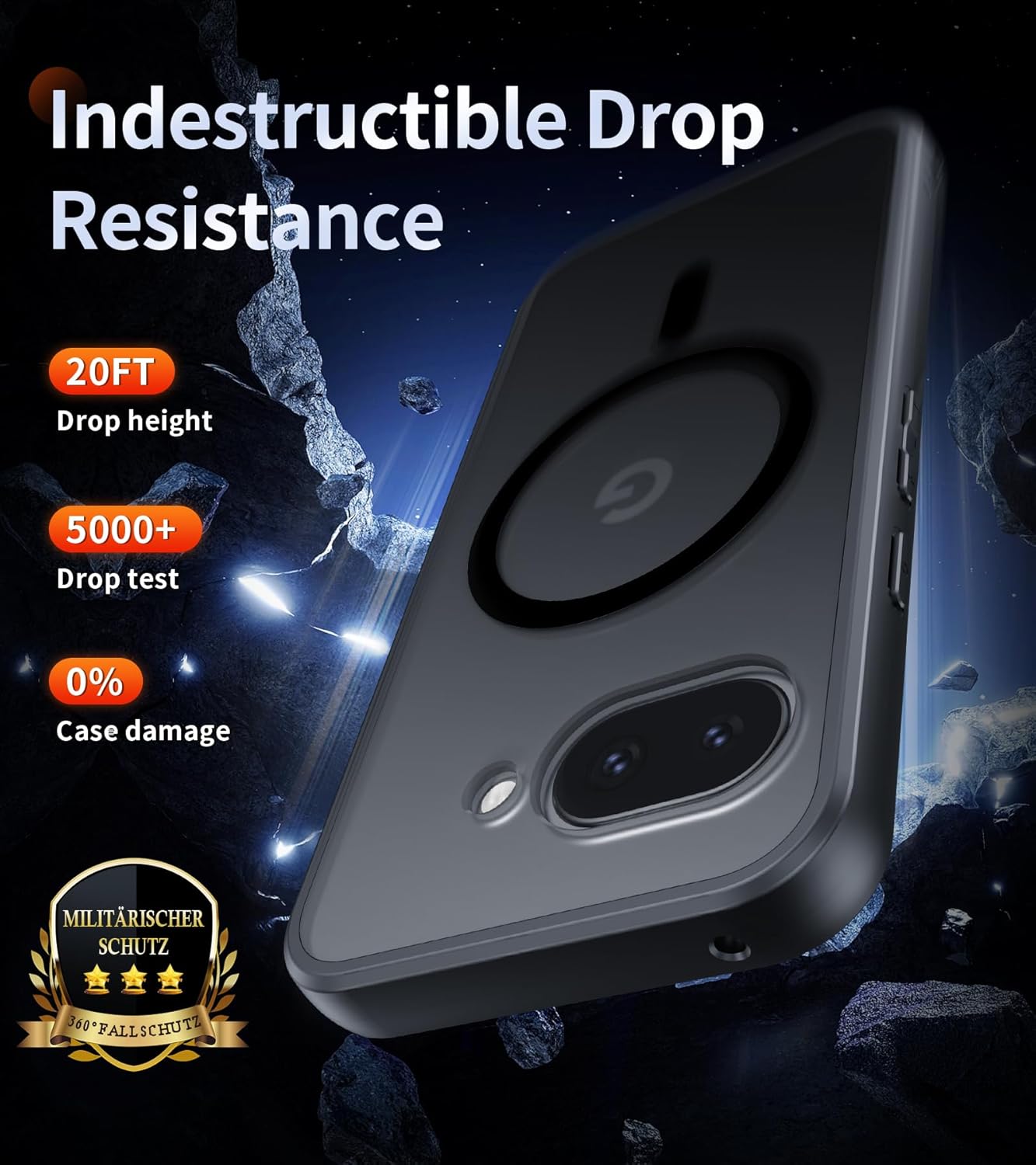 • Стандартна военна защита от падане: корпусът е стриктно тестван, здравият PC гръб и гъвкавият мек TPU броня са устойчиви на удари и повреди при падане отпред или отзад. За да се осигури пълна защита от всички страни, има специално разработени въздушни предпазни ъгли, които абсорбират ударите, повдигнати ръбове на дисплея и рамка на обектива на камерата, за да се осигури подобрена защита от надраскване там, където е наистина важно.
