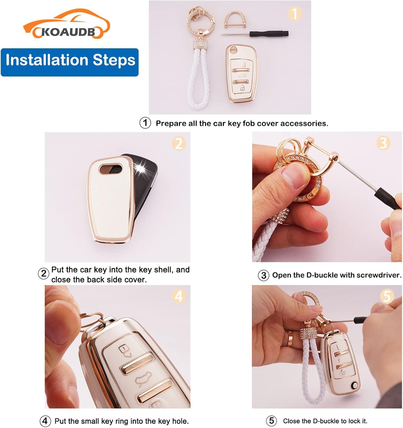 • 【ОПАКОВКА】Този комплект калъфи за автомобилни ключове се предлага с TPU калъф за ключове за кола (ключодържателят не е включен), 1 катарама против загубване, 1 лъскав ключодържател за кола, 3 малки ключодържателя и отвертка. Той може да придаде луксозен и готин вид на ключовете на колата ви, което го прави чудесен подарък за вашите приятели или семейство за Коледа, Деня на благодарността или рождени дни.