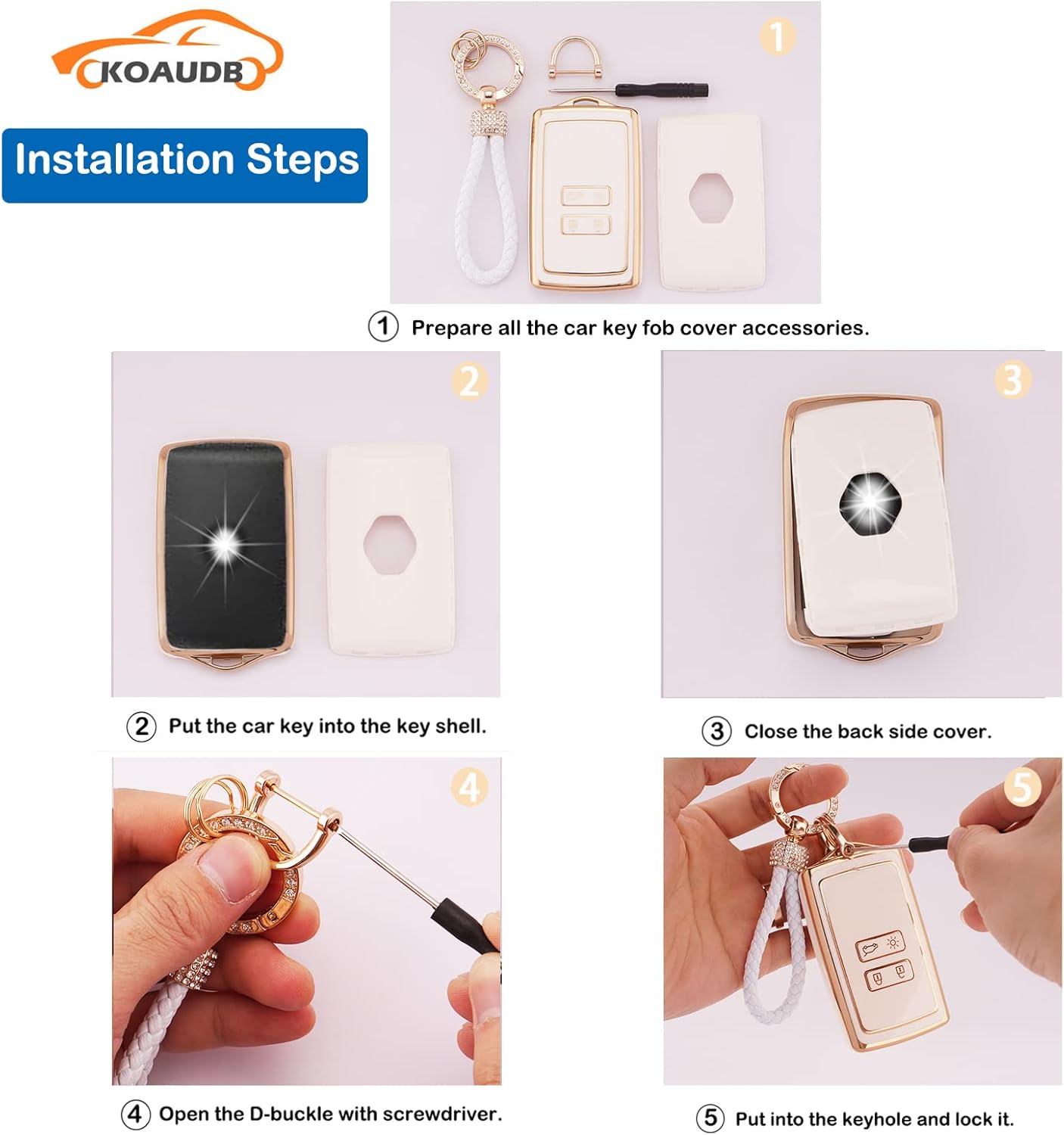 • 【ОПАКОВКА】Този комплект калъфи за автомобилни ключове се предлага с TPU калъф за ключове за кола (ключодържателят не е включен), 1 катарама против загубване, 1 лъскав ключодържател за кола, 3 малки ключодържателя и отвертка. Той може да придаде луксозен и готин вид на ключовете на колата ви, което го прави чудесен подарък за вашите приятели или семейство за Коледа, Деня на благодарността или рождени дни.