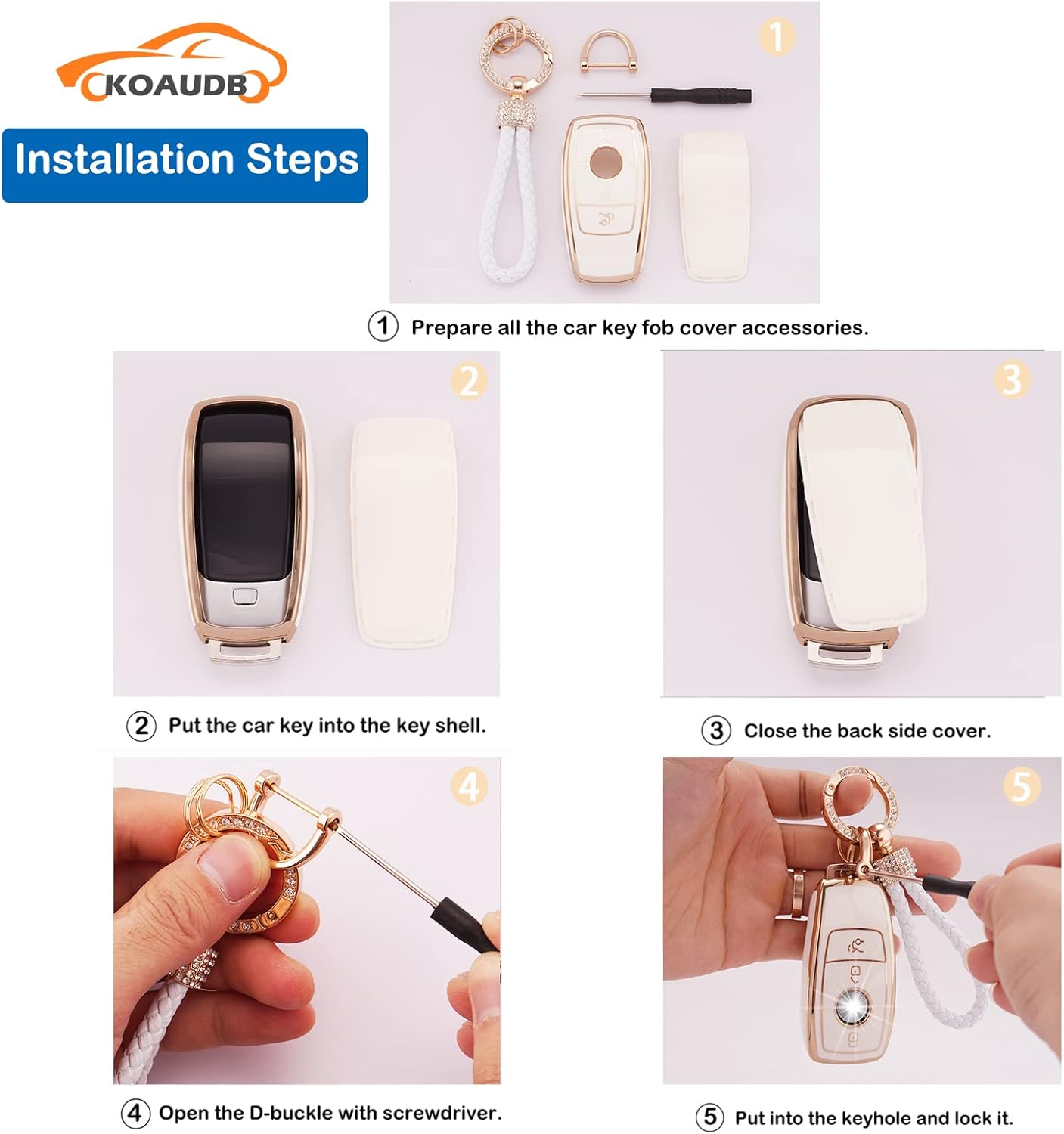 • 【ОПАКОВКА】Този комплект калъфи за автомобилни ключове се предлага с TPU калъф за ключове за кола (ключодържателят не е включен), 1 катарама против загубване, 1 лъскав ключодържател за кола, 3 малки ключодържателя и отвертка. Той може да придаде луксозен и готин вид на ключовете на колата ви, което го прави чудесен подарък за вашите приятели или семейство за Коледа, Деня на благодарността или рождени дни.