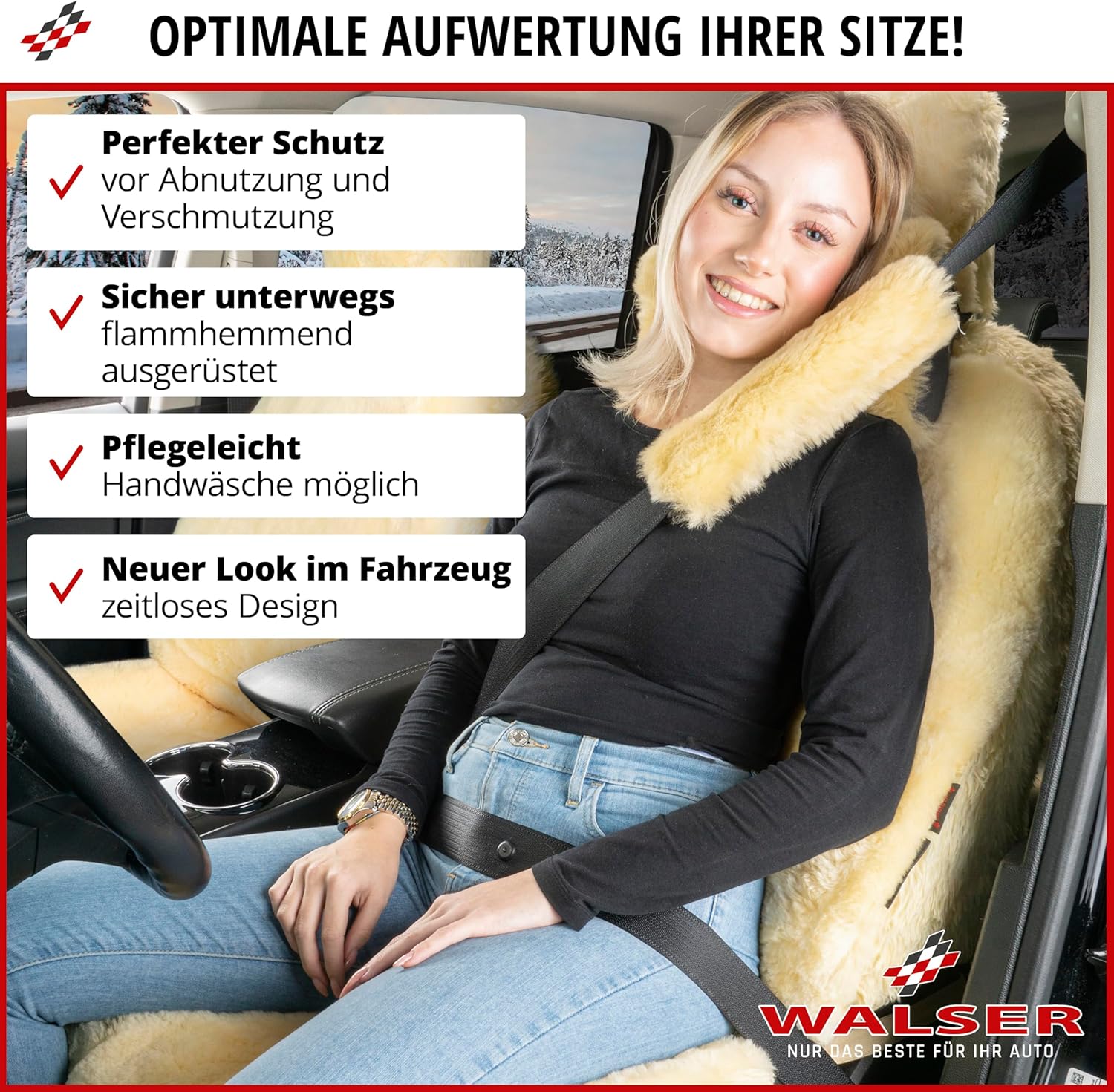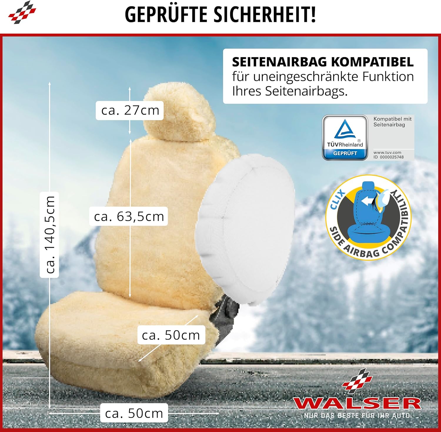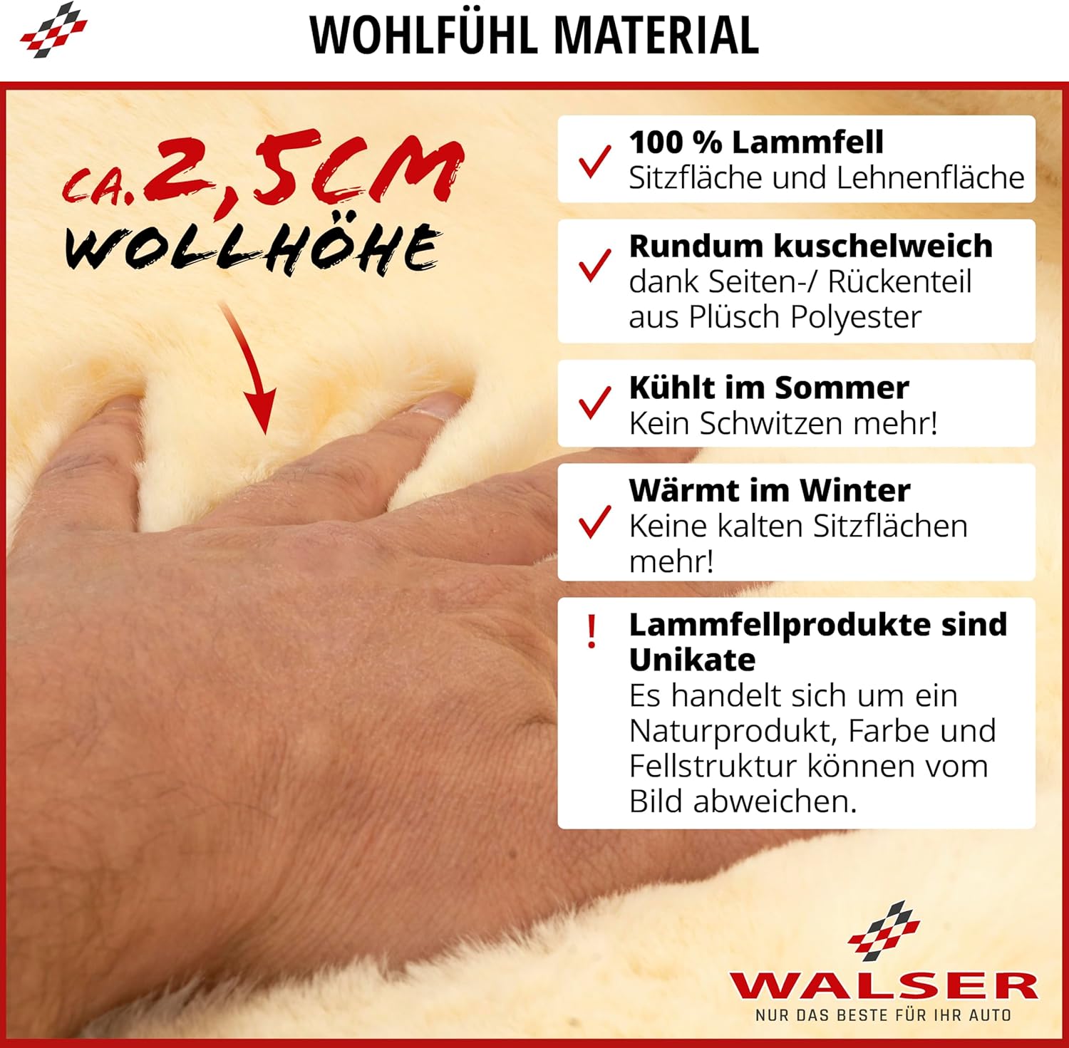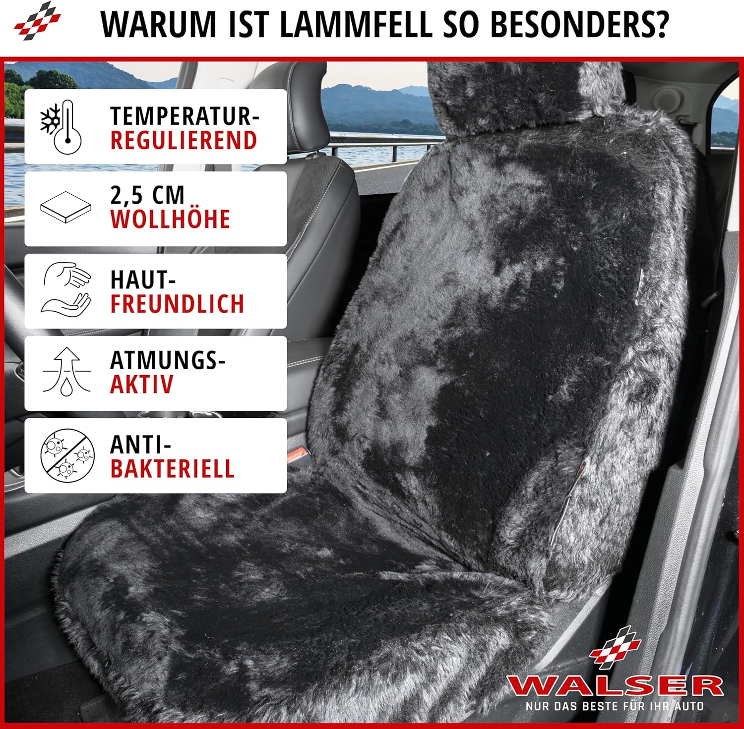 • ПРОДУКТ, КОЙТО ЩЕ СЕ ЧУВСТВА ДОБРЕ: Висококачественият калъф за автомобилна седалка от агнешка кожа WALSER осигурява максимален комфорт във вашия автомобил. Пухкавият, мек калъф за автомобилна седалка от агнешка кожа е щадящ кожата, дишащ и регулира температурата. Действайки като перфектна мини-климатична система в колата ви, антибактериалният калъф от кожа осигурява топлина през зимата и предотвратява студените седалки. През лятото седалките от агнешка кожа ви охлаждат, отвеждат влагата и топлината и балансират температурите.