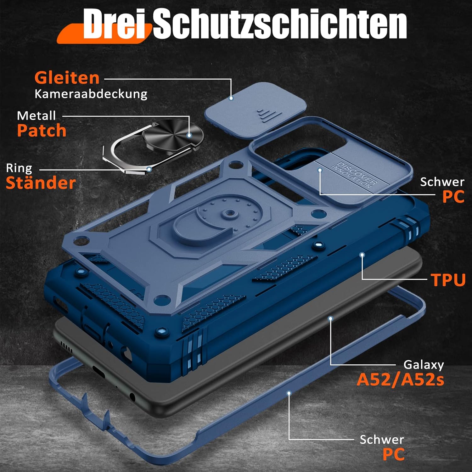 • Защита от военно ниво: калъфът за Galaxy A53 5G използва уникален TPU с ръбове в комбинация с вградени PC 2-в-1 затваряния, за да предпази телефона ви от падания, драскотини и удари. Защитата от военно ниво с технология с въздушна възглавница осигурява цялостна защита за вашето оборудване. Дизайн с плъзгач на обектива: Повдигната рамка за защита на камерата. Капачката покрива обектива и го предпазва от прах и драскотини.