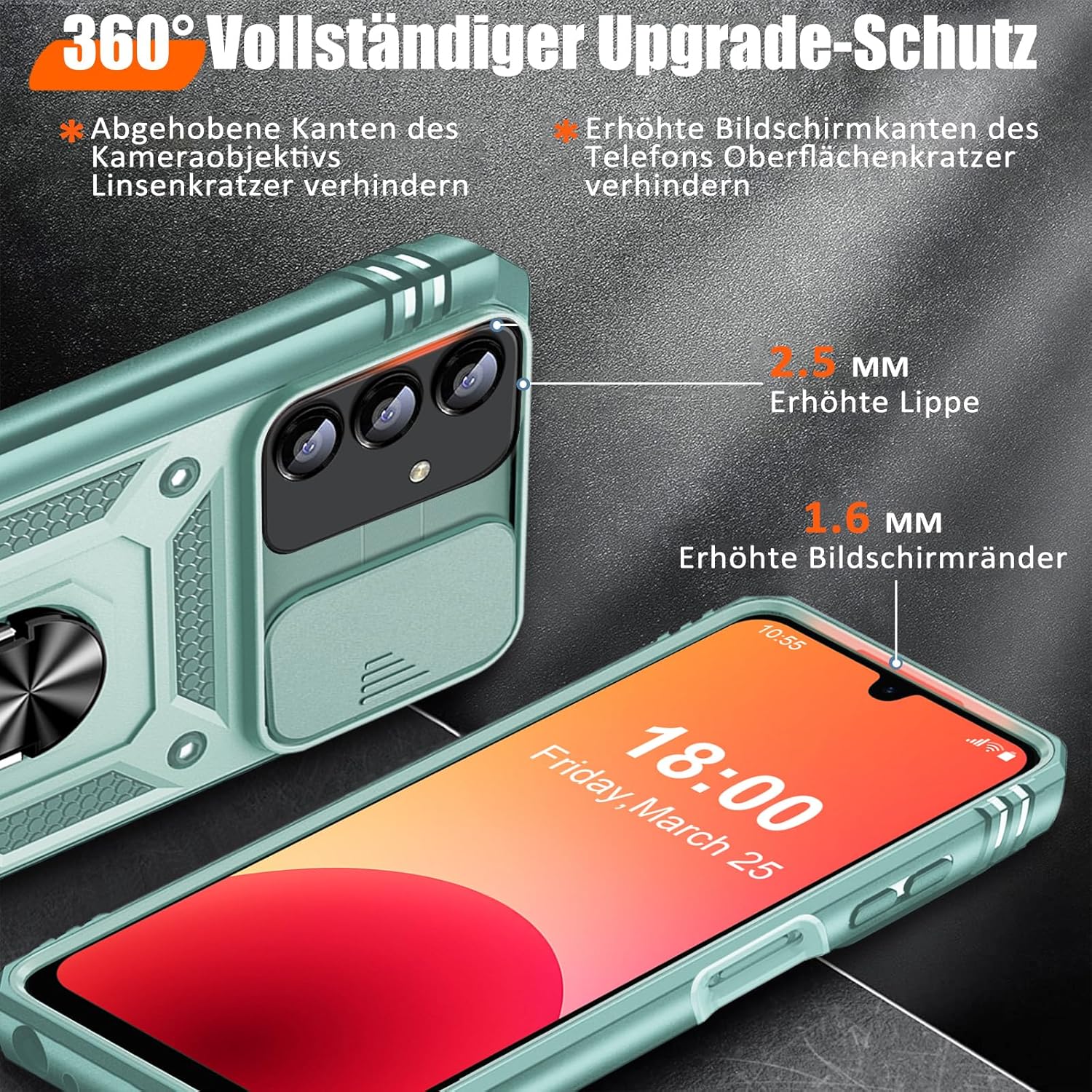 • Защита от военно ниво: калъфът за Galaxy A53 5G използва уникален TPU с ръбове в комбинация с вградени PC 2-в-1 затваряния, за да предпази телефона ви от падания, драскотини и удари. Защитата от военно ниво с технология с въздушна възглавница осигурява цялостна защита за вашето оборудване. Дизайн с плъзгач на обектива: Повдигната рамка за защита на камерата. Капачката покрива обектива и го предпазва от прах и драскотини.