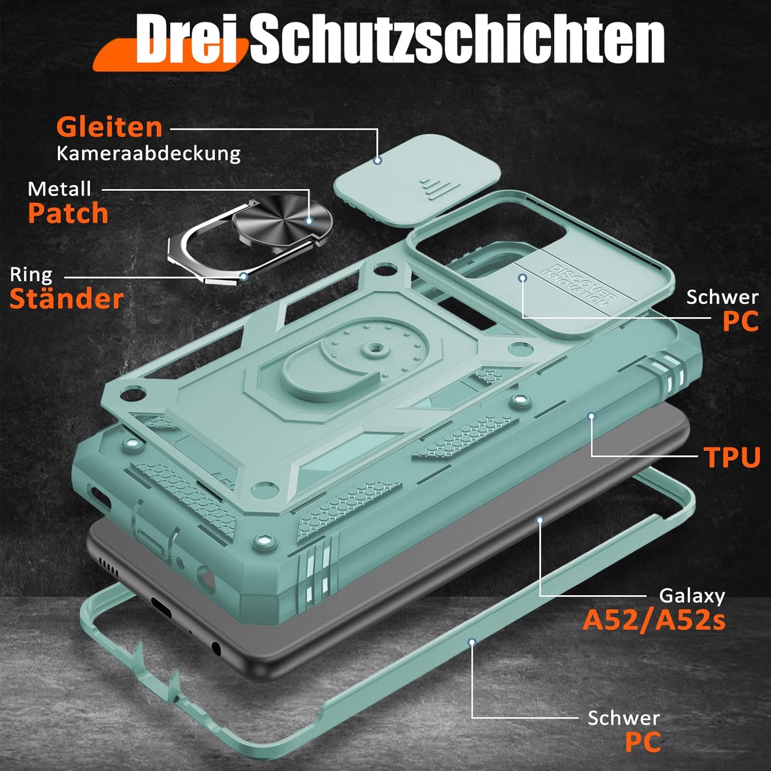 • Защита от военно ниво: калъфът за Galaxy A53 5G използва уникален TPU с ръбове в комбинация с вградени PC 2-в-1 затваряния, за да предпази телефона ви от падания, драскотини и удари. Защитата от военно ниво с технология с въздушна възглавница осигурява цялостна защита за вашето оборудване. Дизайн с плъзгач на обектива: Повдигната рамка за защита на камерата. Капачката покрива обектива и го предпазва от прах и драскотини.