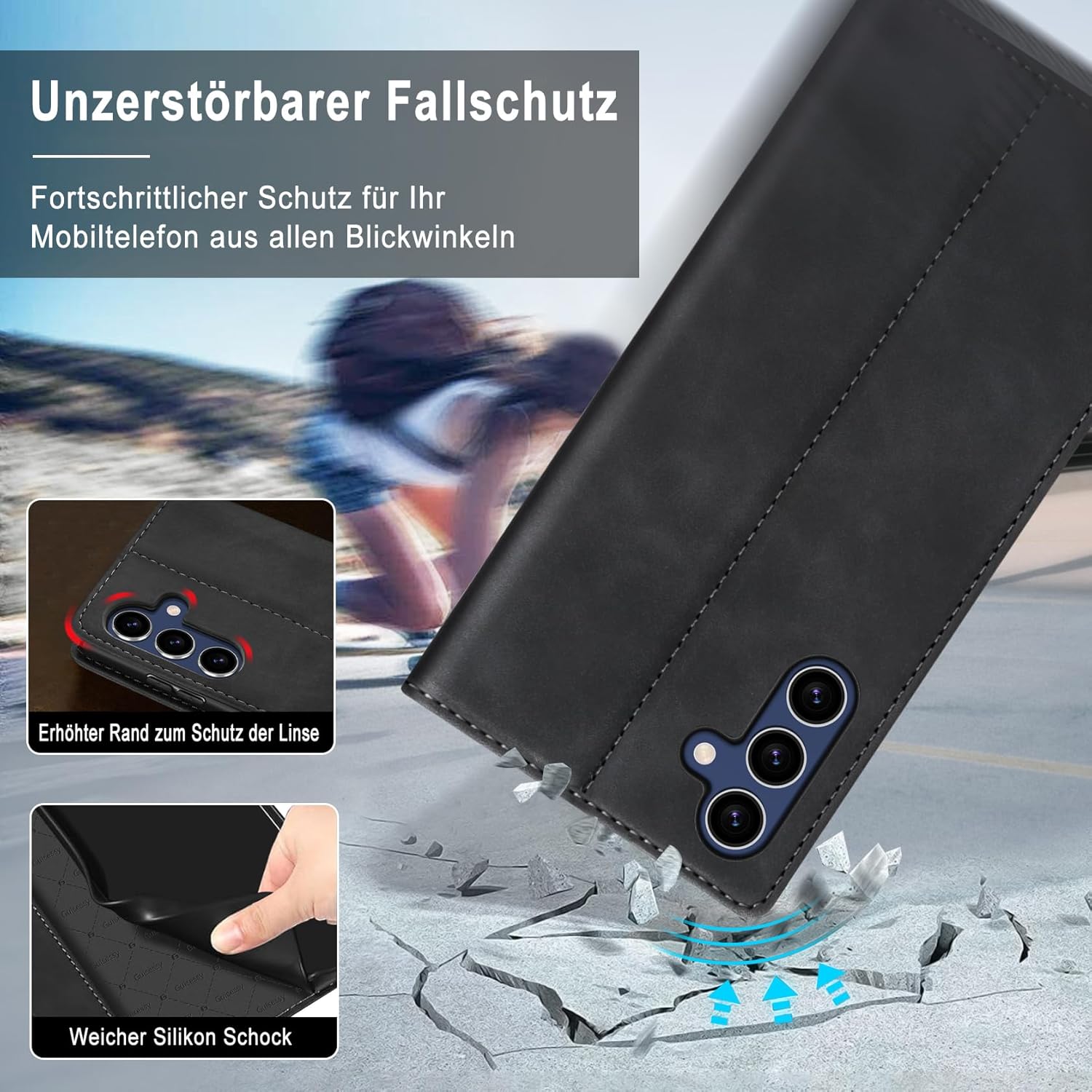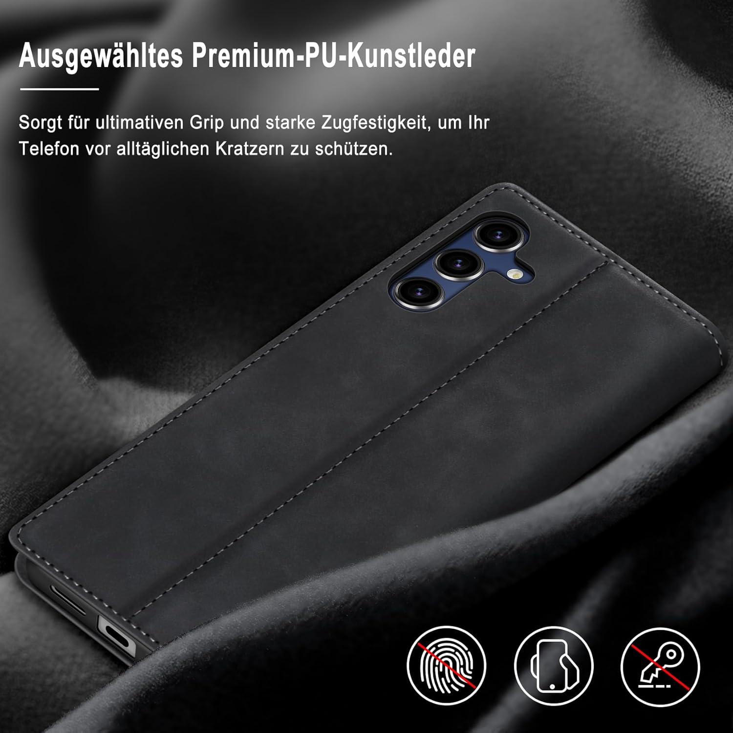 • Премиум PU кожа: Този калъф-портфейл за Samsung Galaxy S25 FE 5G е изработен от висококачествена изкуствена кожа PU и мек и гладък силиконов TPU. Елегантен външен вид, качествената PU има деликатен захват и силна якост на опън, но също така е удароустойчив и осигурява максимална защита от замърсявания, удари и драскотини, осигурявайки отлична 360-градусова всестранна защита.