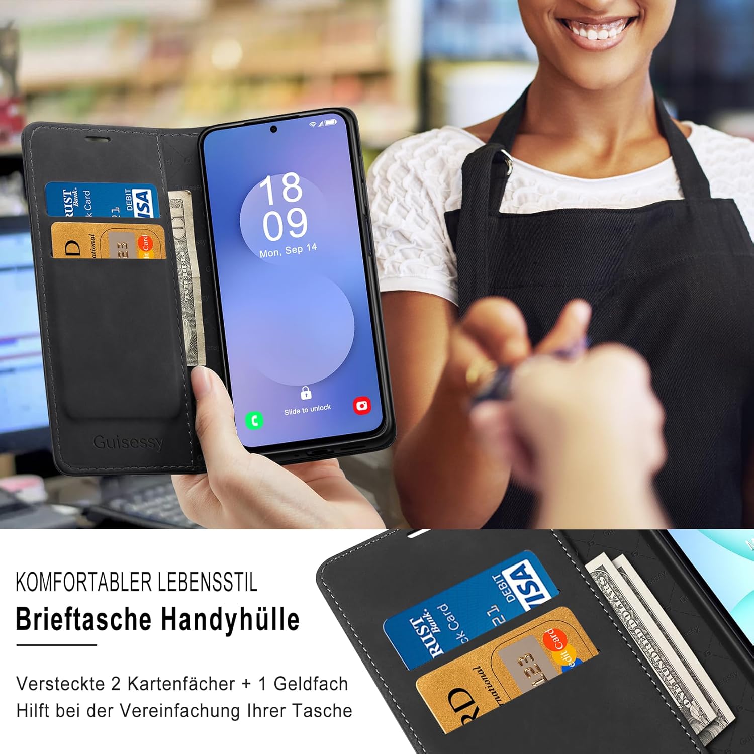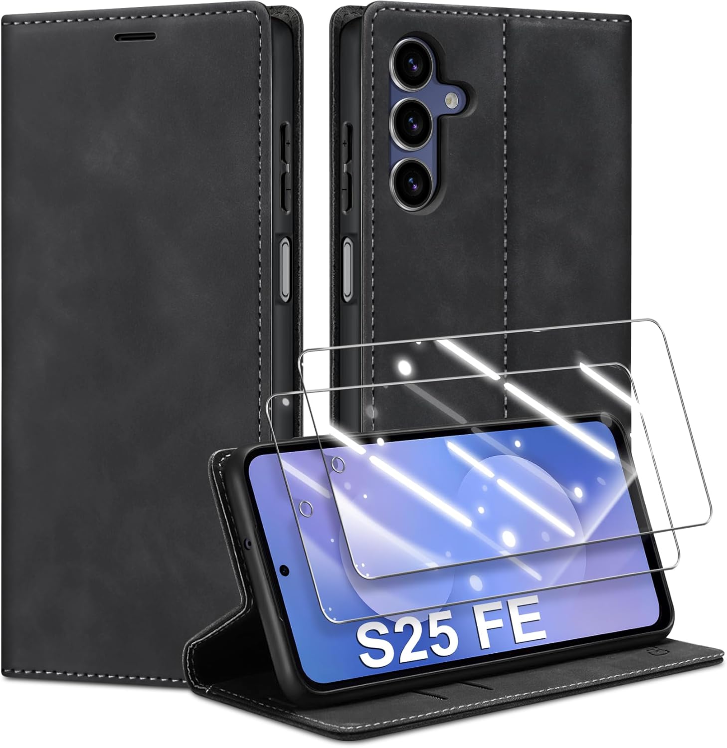 Калъф за мобилен телефон Guisessy за Samsung Galaxy S25 FE 5G и 2 протектора за екран, първокласен кожен сгъваем калъф-портфейл, [магнит] [слот за карти] [функция стойка] защитен калъф за Samsung S25 FE