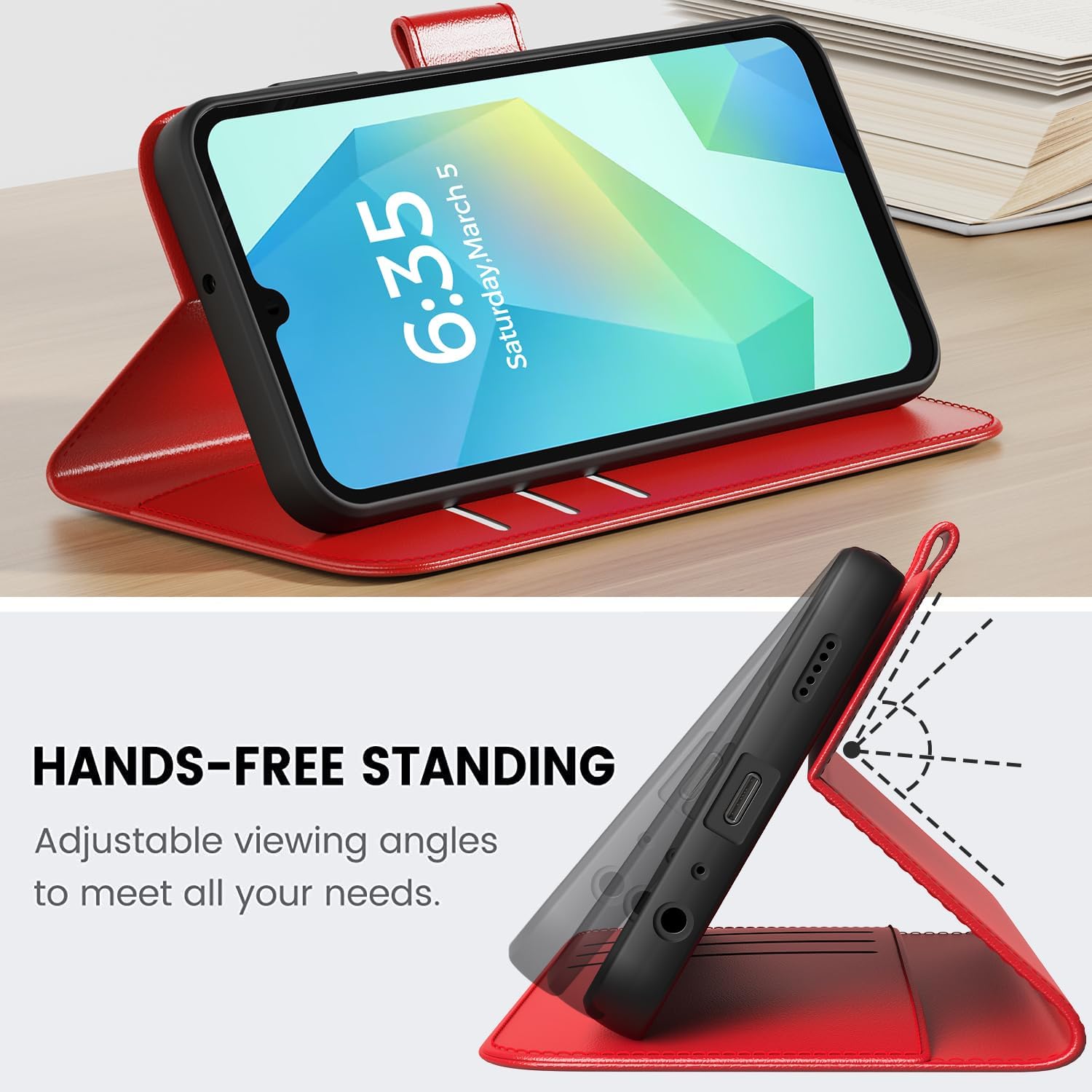 • Вградена стойка за телефон: калъфът за Samsung Galaxy A16 5G може да се използва като стойка за телефон за гледане на видеоклипове в пейзажен формат. Могат да се регулират множество ъгли на гледане. Те използват най-добрия ъгъл, за да се насладите на четене и гледане на филми.