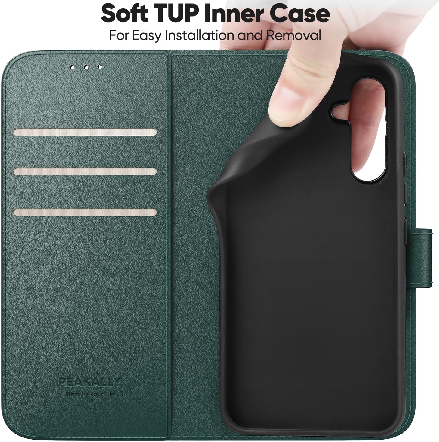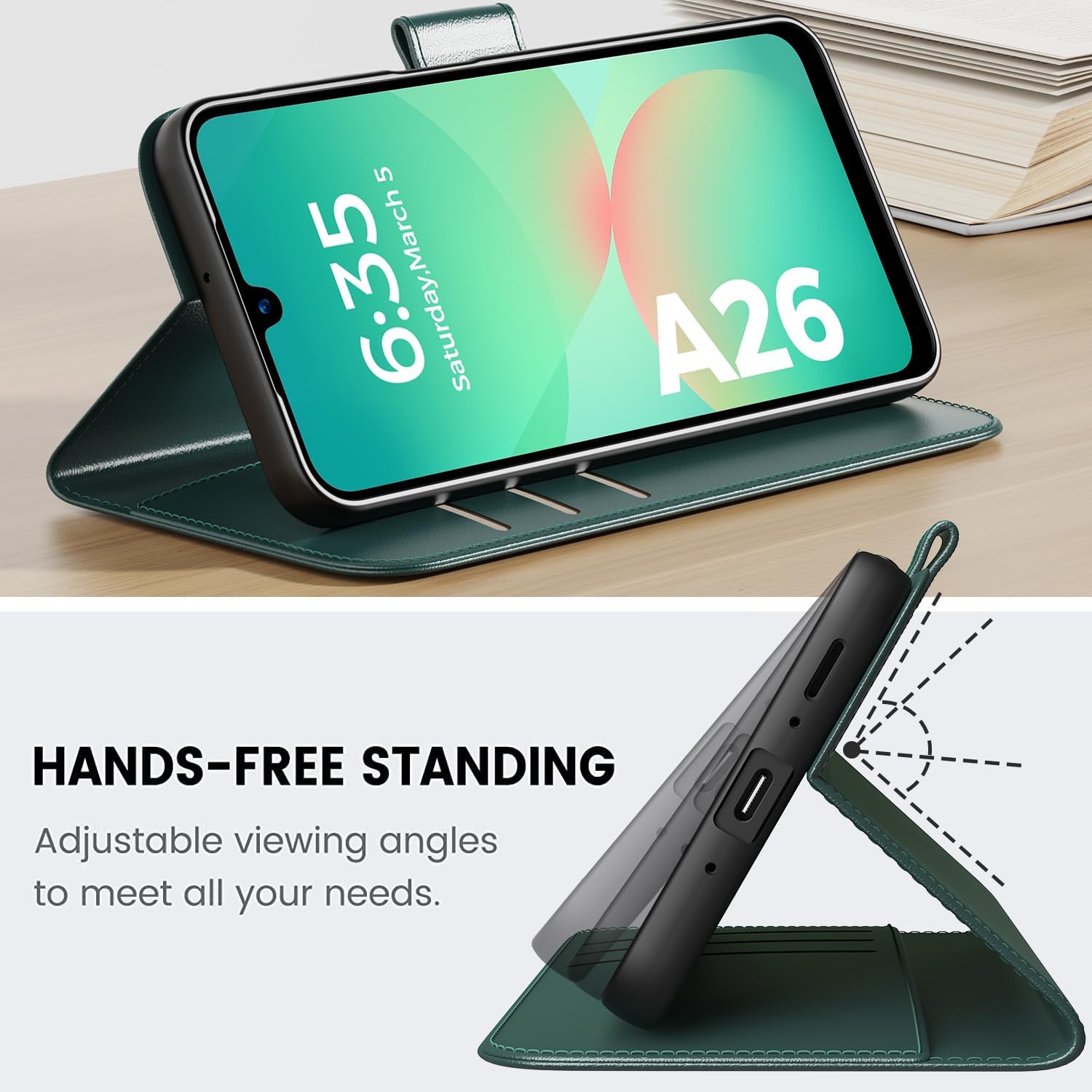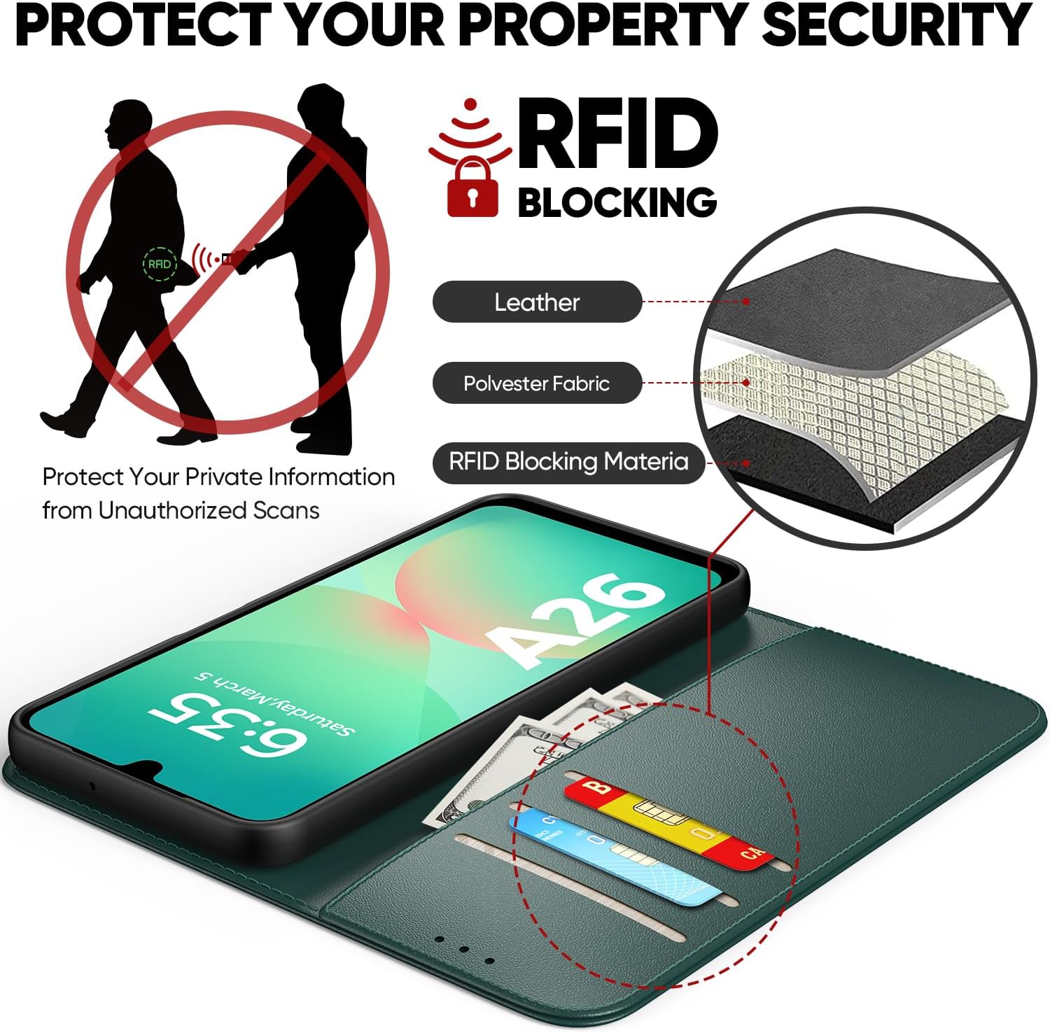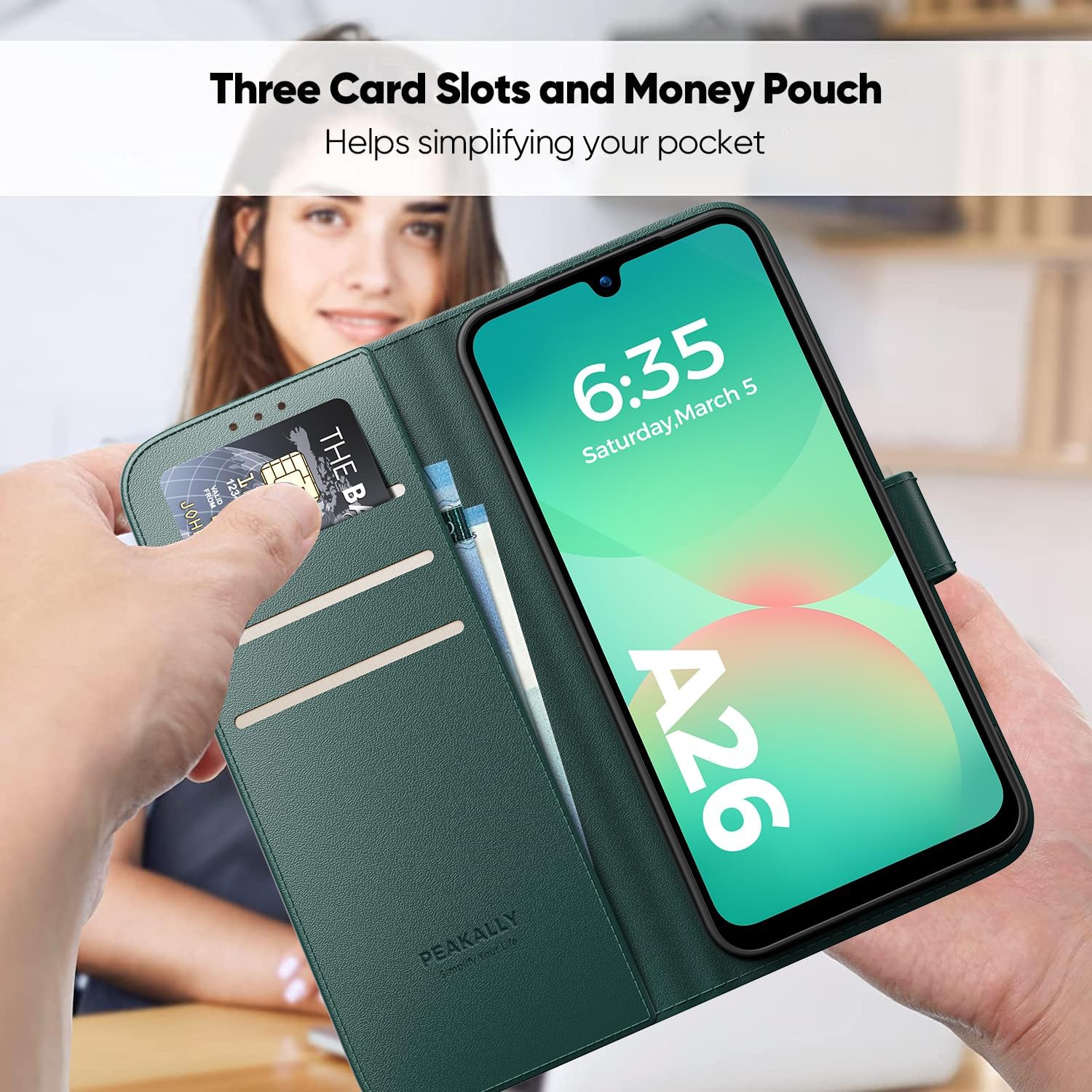 Калъф за мобилен телефон Peakally за Samsung Galaxy A26 5G [С 1 парче закалено стъкло] [Премиум PU кожа] [RFID блокиране] [Слот за карта] [Стойка] Флип калъф за Galaxy A26 5G / A26 4G
