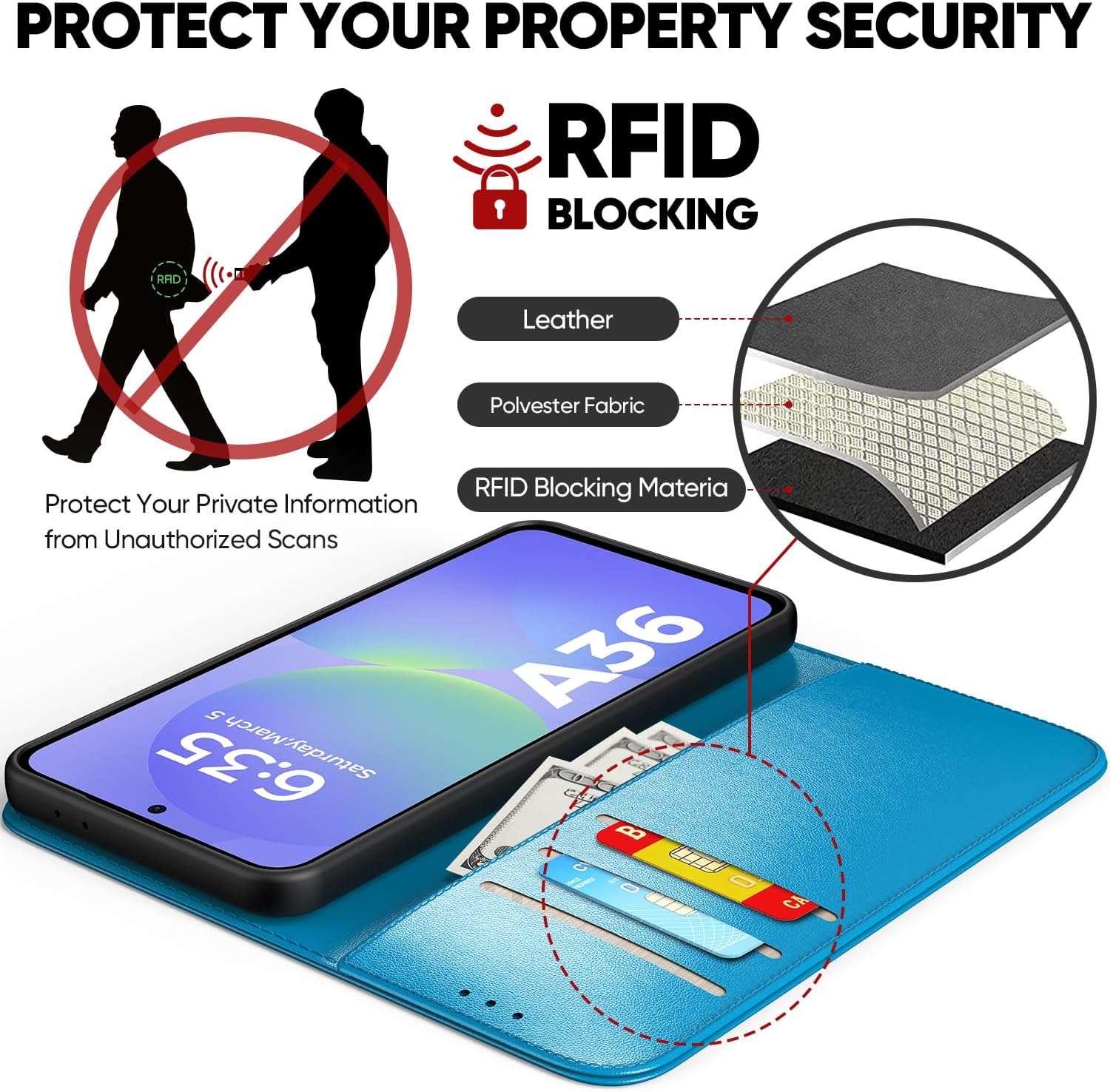 • RFID защита и слот за карта: Подходящ за калъф за мобилен телефон Samsung Galaxy A16, вътре има 3 слота за карти и 1 отделение за портфейл. В същото време е въведена подобрена анти-RFID технология. Съхранявайте кредитни карти, визитки и пари в брой. Лесен за употреба без търсене.