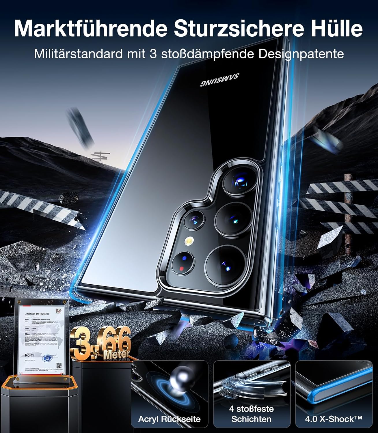 • [№ 1 Военна защита, предпазва при всяко падане] Все още ли се притеснявате, че телефонът ви ще се счупи в случай на падане? Не се притеснявайте! Този калъф за Samsung S25 Ultra използва ексклузивна технология X-Shock 3.0 и професионално защитава четирите ъгъла. С вградена 360° възглавница за абсорбиране на удара, той абсорбира 92,5% от силата на удара. След над 2500 падания от височина 3,66 м, той остава непокътнат - за максимална защита и безпроблемни падания.