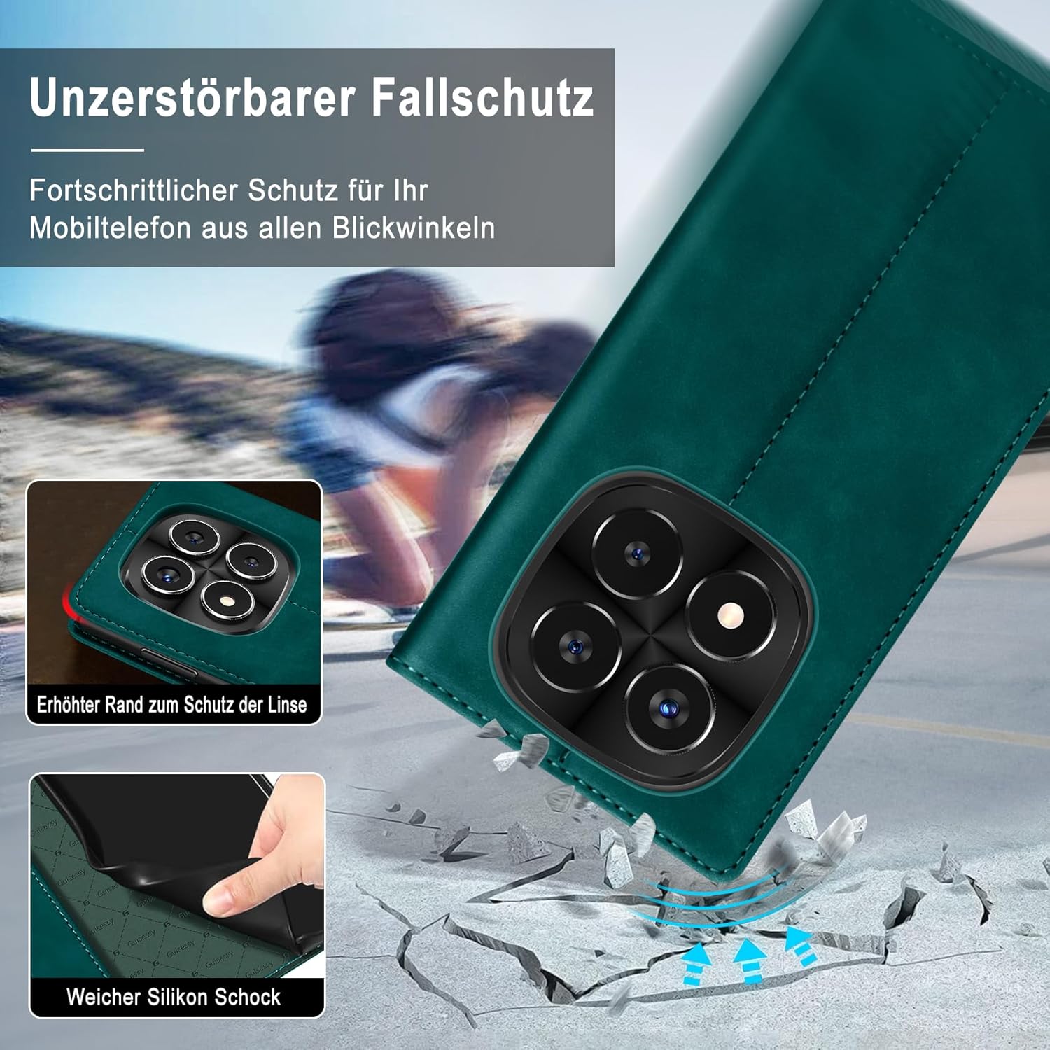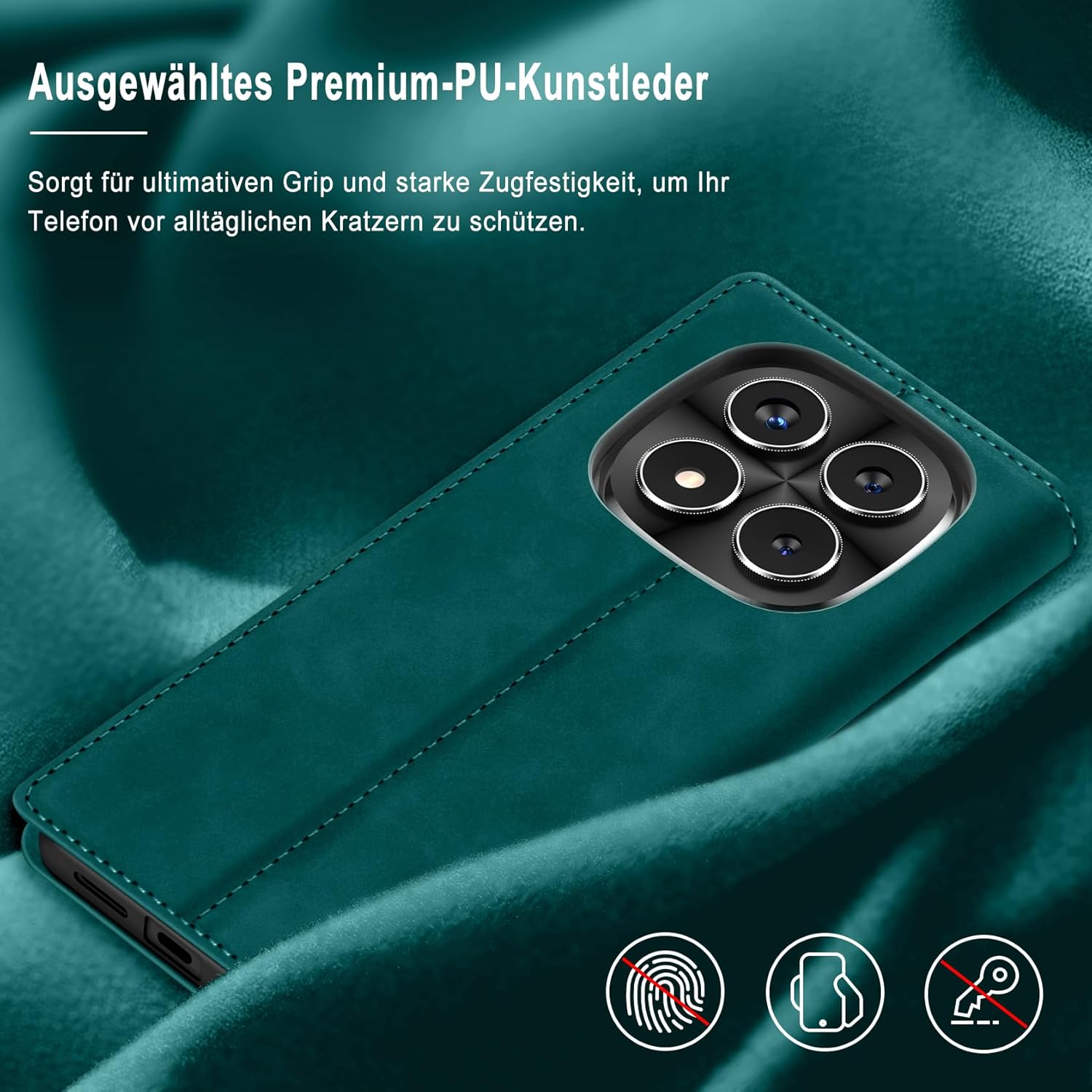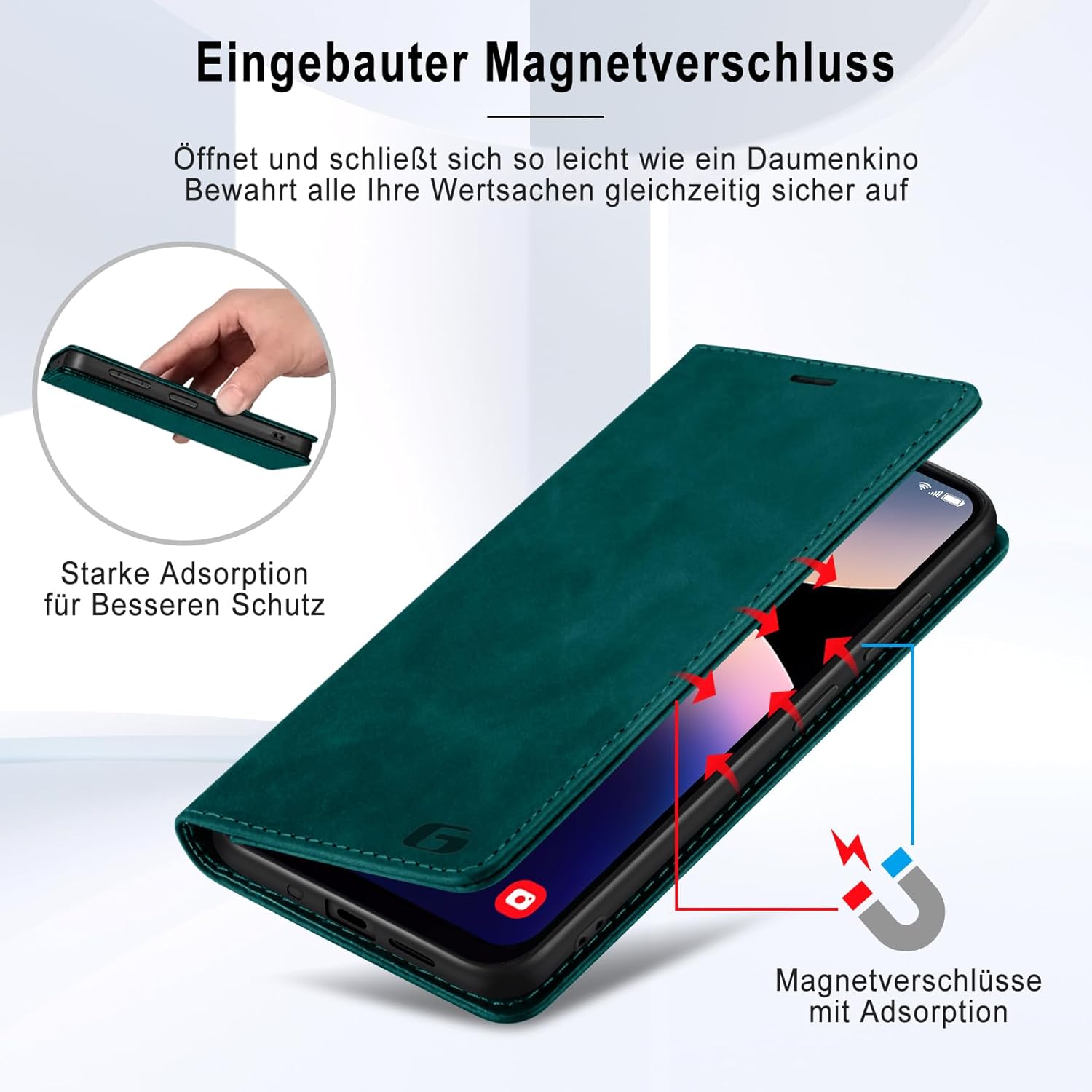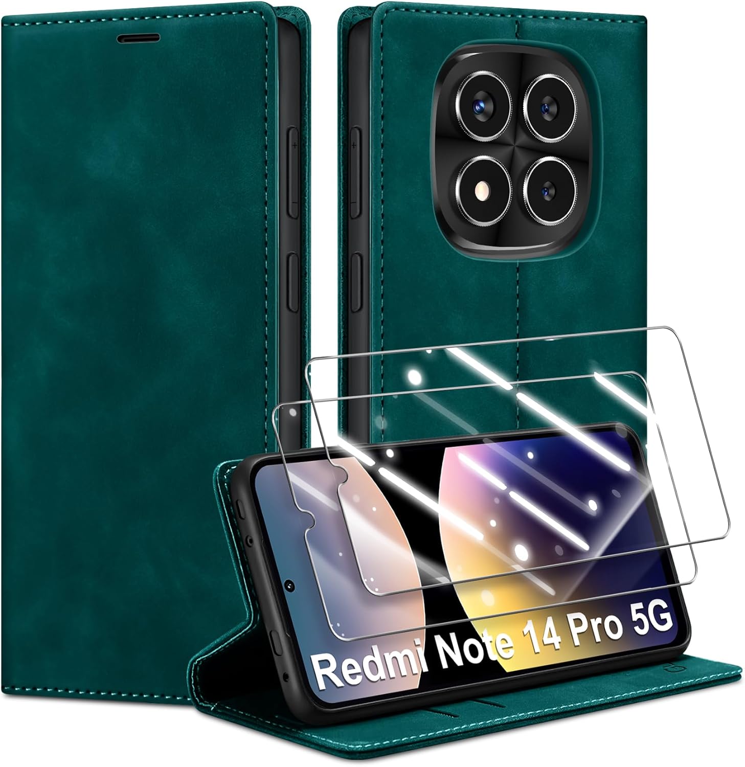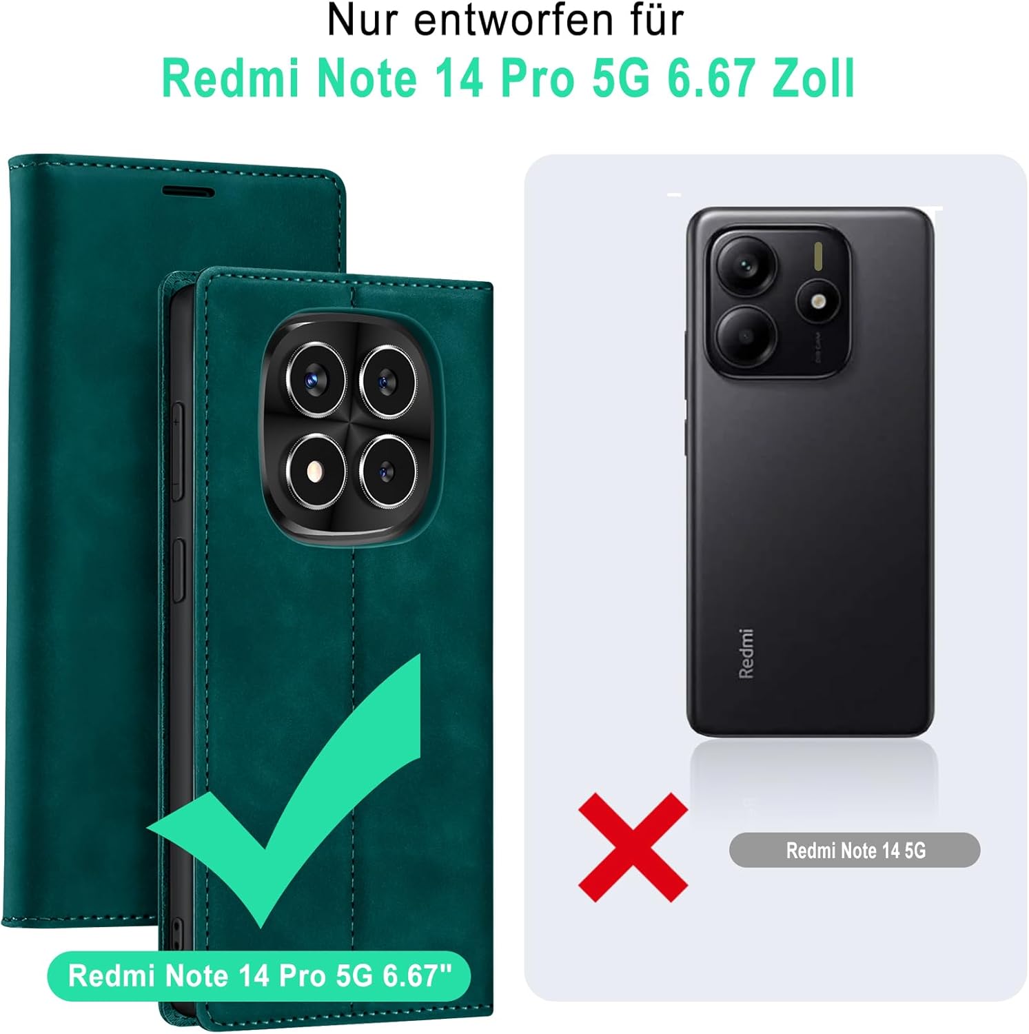 Калъф за мобилен телефон Xiaomi Redmi Note 14 Pro 5G, кожен калъф, премиум сгъваем калъф-портфейл с магнитен слот за карти, функция стойка, защитен калъф за Redmi Note 14 Pro 5G, синьо-зелен