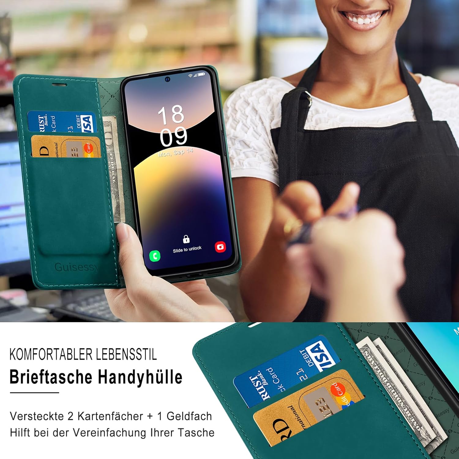 • Стил портфейл: съвместим с Samsung Galaxy S25 FE, сгъваем кожен калъф, перфектна комбинация от калъф за мобилен телефон и портфейл. Два слота за карти за кредитни карти, лична карта, визитки и страничен джоб за пари, касови бележки и сметки. Може да служи като калъф и сигурен преносим портфейл.
