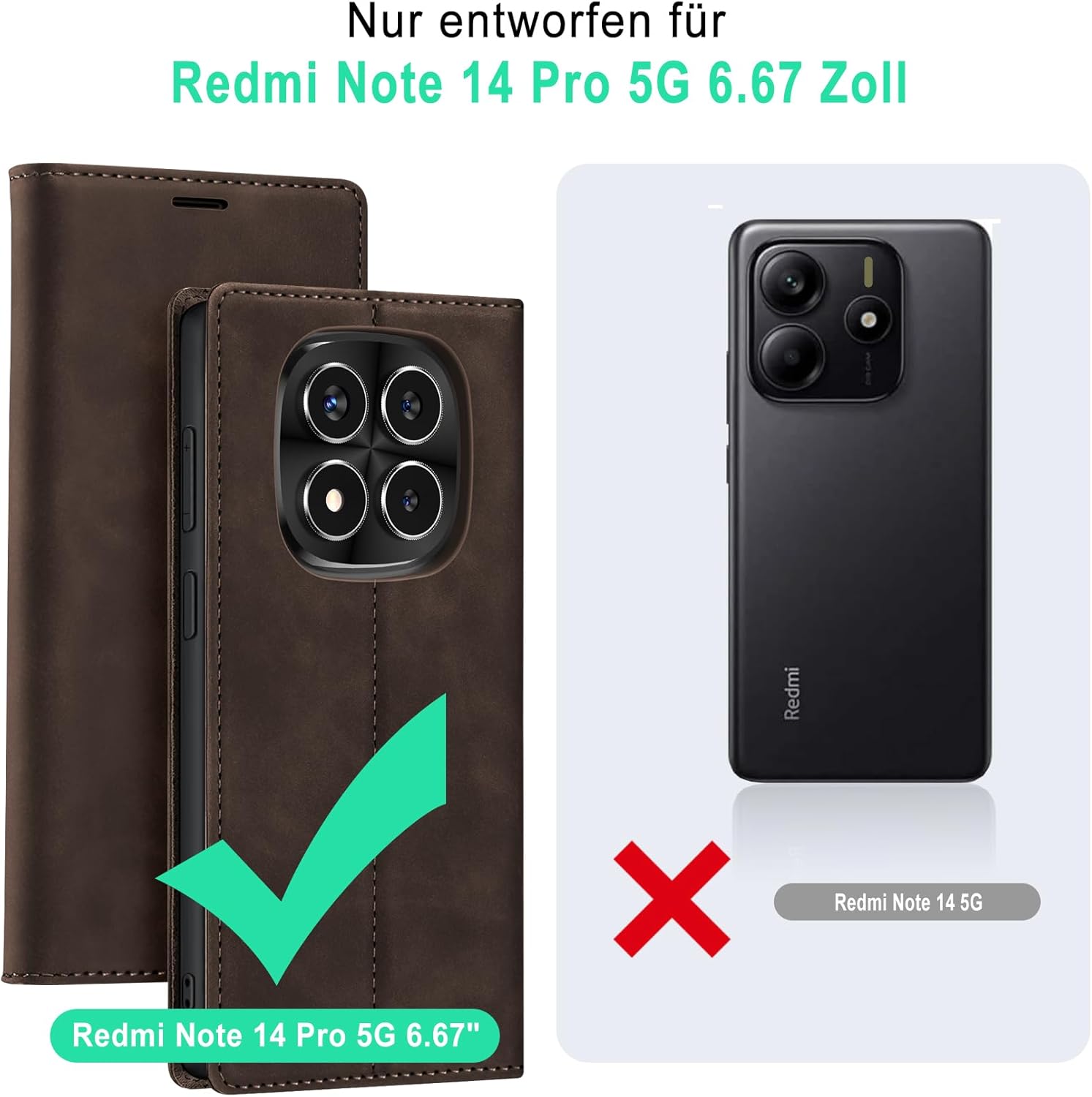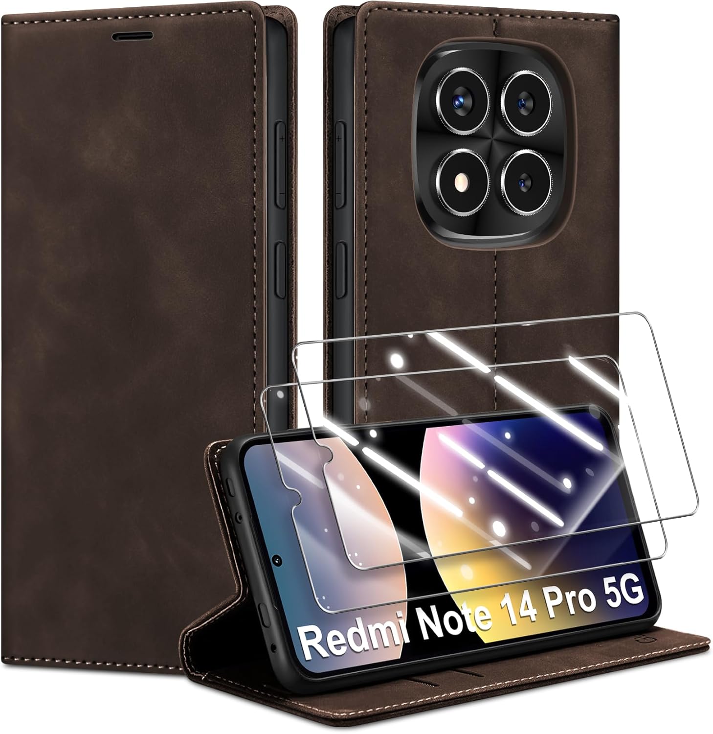 Калъф за мобилен телефон Xiaomi Redmi Note 14 Pro 5G, кожен калъф, премиум сгъваем калъф-портфейл с магнитен слот за карти, функция стойка, защитен калъф за Redmi Note 14 Pro 5G, цвят кафе