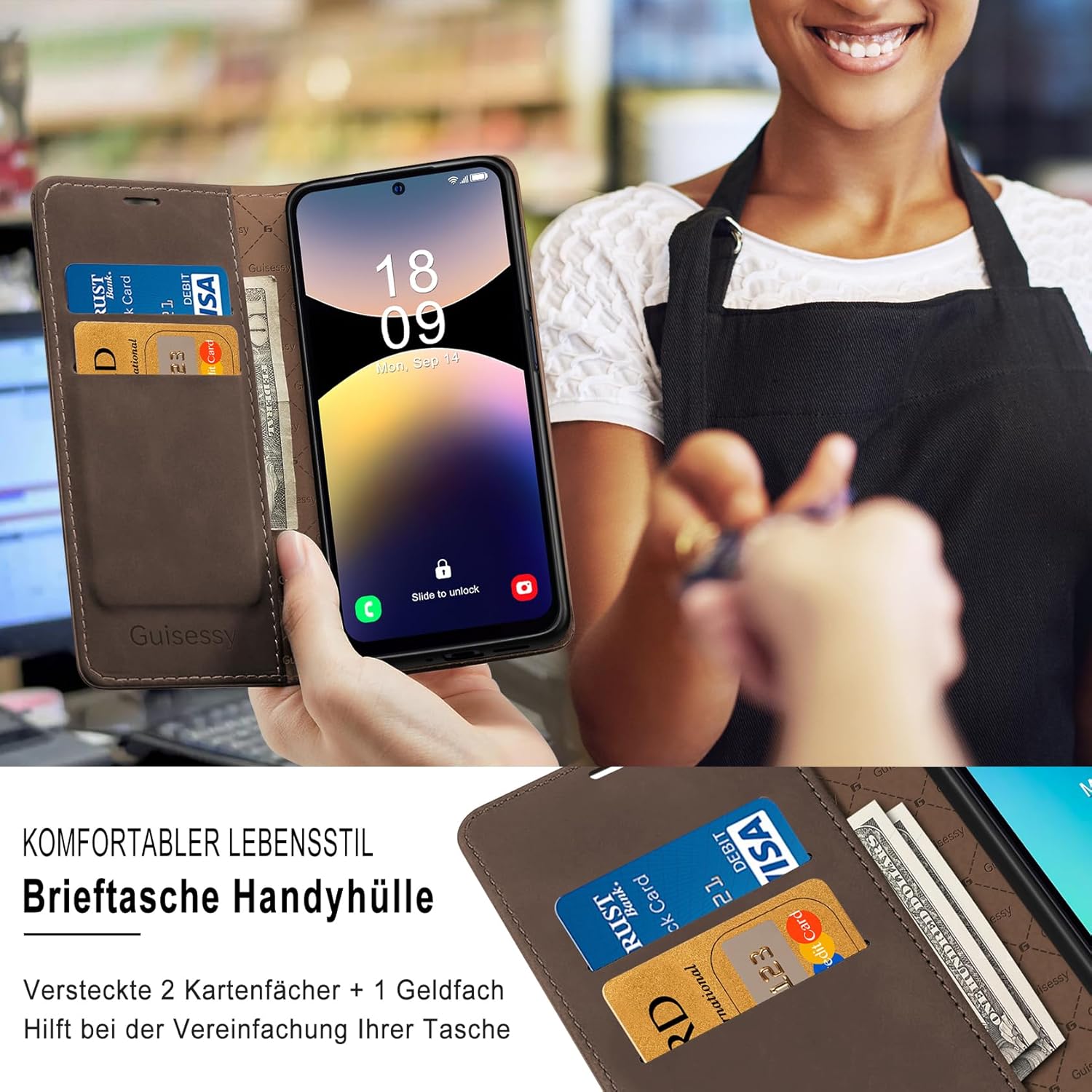 • Стил портфейл: съвместим с Samsung Galaxy S25 FE, сгъваем кожен калъф, перфектна комбинация от калъф за мобилен телефон и портфейл. Два слота за карти за кредитни карти, лична карта, визитки и страничен джоб за пари, касови бележки и сметки. Може да служи като калъф и сигурен преносим портфейл.