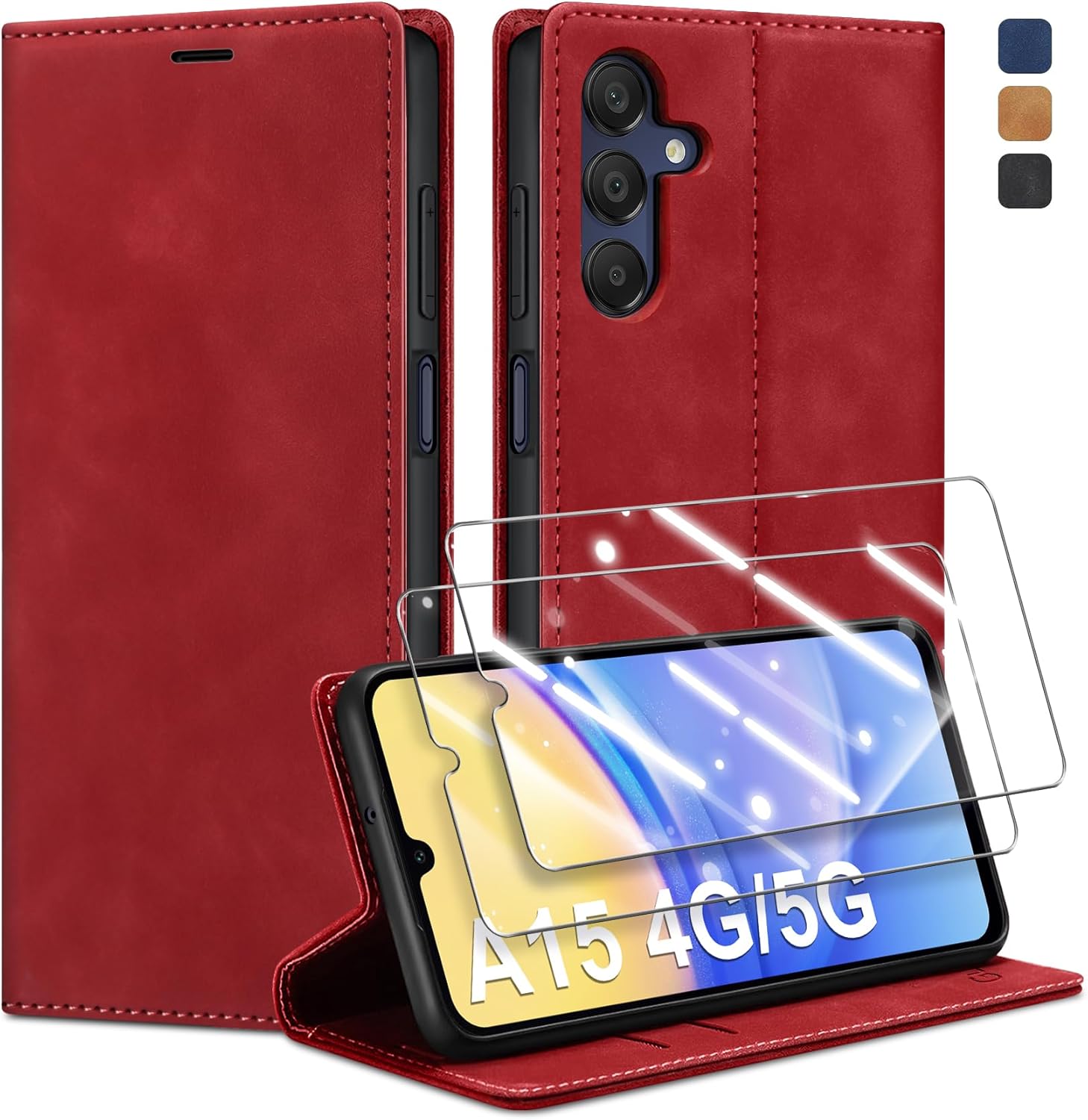 Калъф за мобилен телефон за Samsung Galaxy A15 5G / 4G с кожен калъф и 2 протектора за екран, първокласен сгъваем портфейл с магнитен слот за карти, функция стойка, защитен калъф за Samsung A15