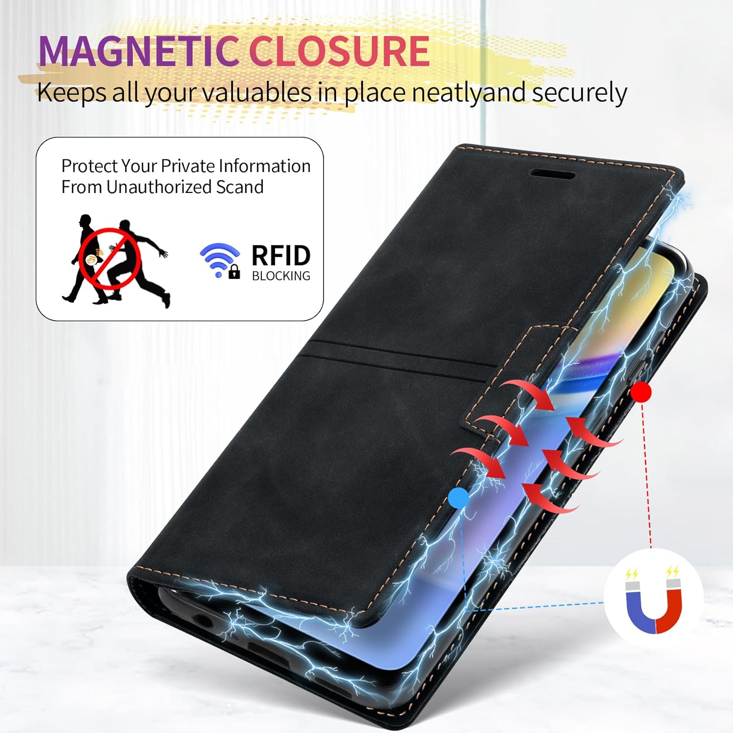 • Вградено магнитно закопчаване: Калъфът за мобилен телефон Guisessy за Samsung Galaxy S25 FE има вградено магнитно закопчаване, може лесно да се отваря и затваря, прави използването на телефона по-лесно и удобно. Вграденото силно магнитно закопчаване подобрява магнитната връзка, предпазва телефона ви, когато не се използва, като ефективно предотвратява случайно отваряне на калъфа.