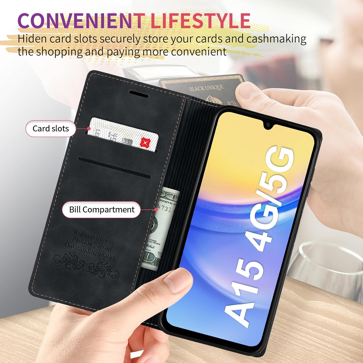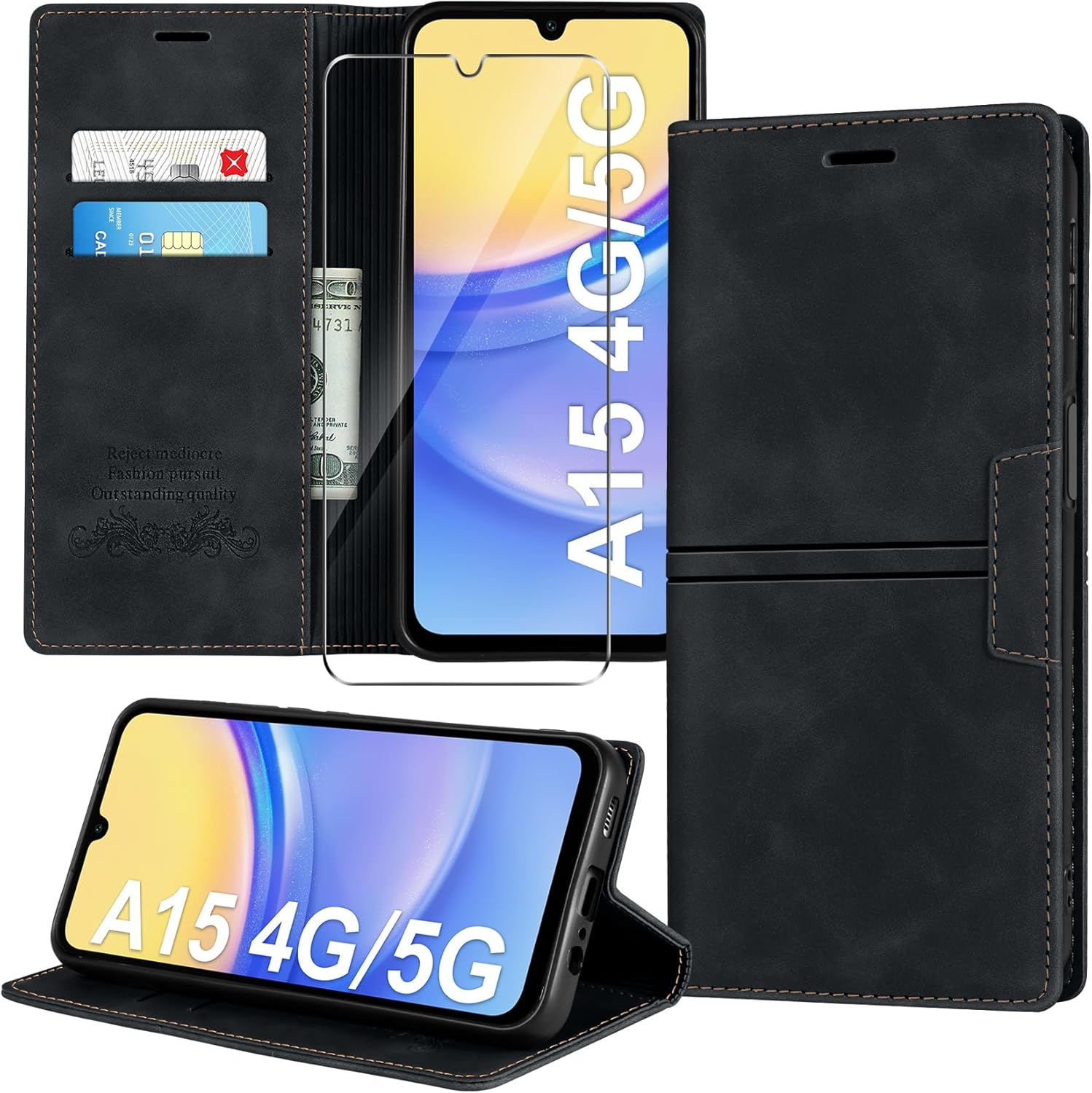 Калъф за мобилен телефон за Samsung Galaxy A15 5G / A15 4G, кожен калъф с протектор за екран, PU кожа, флип калъф за Samsung A15, сгъваем калъф, стойка, слот за карти, портфейл, флип калъф, черен