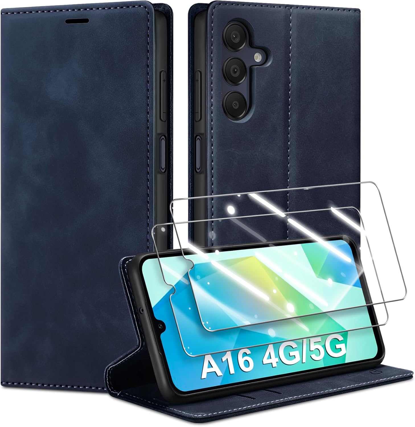 Калъф за мобилен телефон за Samsung Galaxy A16 5G / 4G и 2 протектора за екран, първокласен сгъваем портфейл с магнитен слот за карти, функция стойка, защитен калъф за Samsung A16