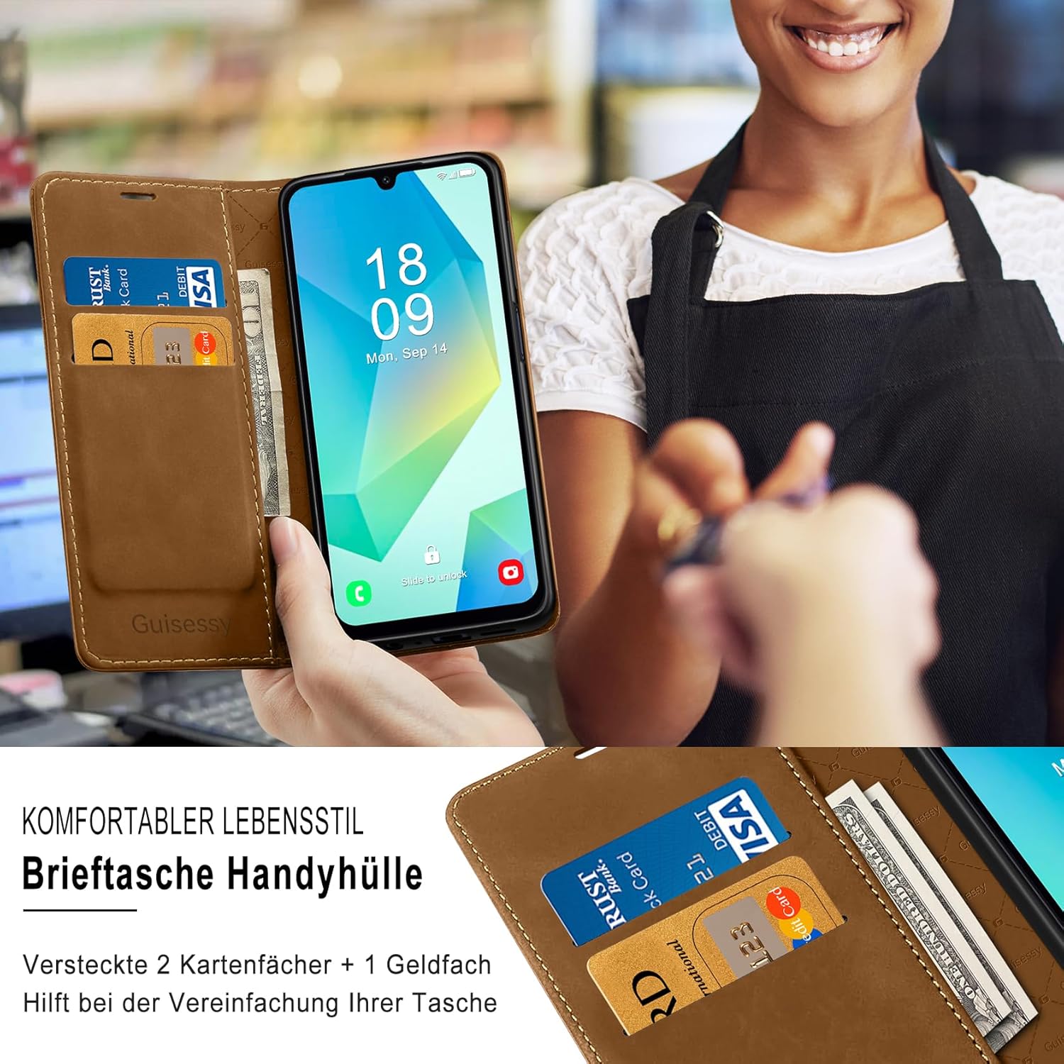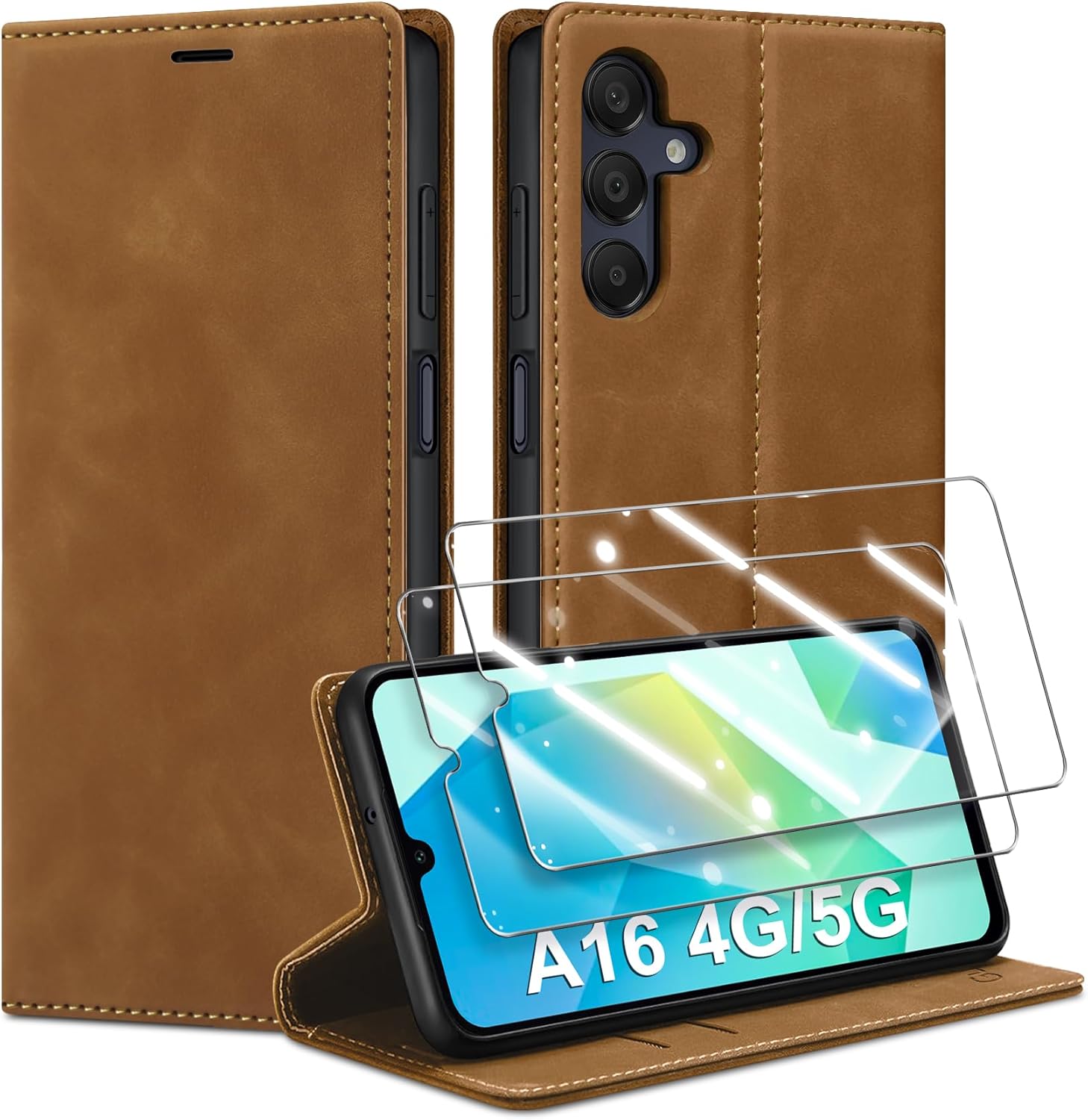 Калъф за мобилен телефон за Samsung Galaxy A16 5G / 4G с кожен калъф и 2 протектора за екран, първокласен сгъваем портфейл с магнитен слот за карти и функция стойка, защитен калъф за Samsung A16 4G/5G