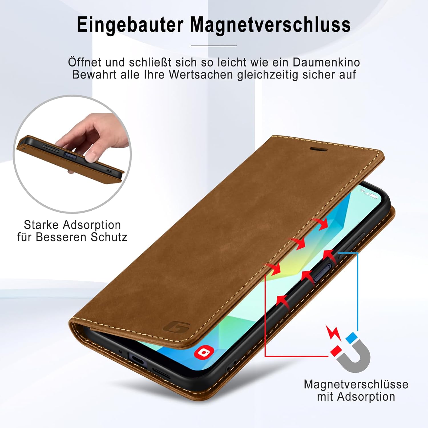 • Премиум PU кожа: Този калъф-портфейл за Samsung Galaxy S25 FE 5G е изработен от висококачествена изкуствена кожа PU и мек и гладък силиконов TPU. Елегантен външен вид, качествената PU има деликатен захват и силна якост на опън, но също така е удароустойчив и осигурява максимална защита от замърсявания, удари и драскотини, осигурявайки отлична 360-градусова всестранна защита.