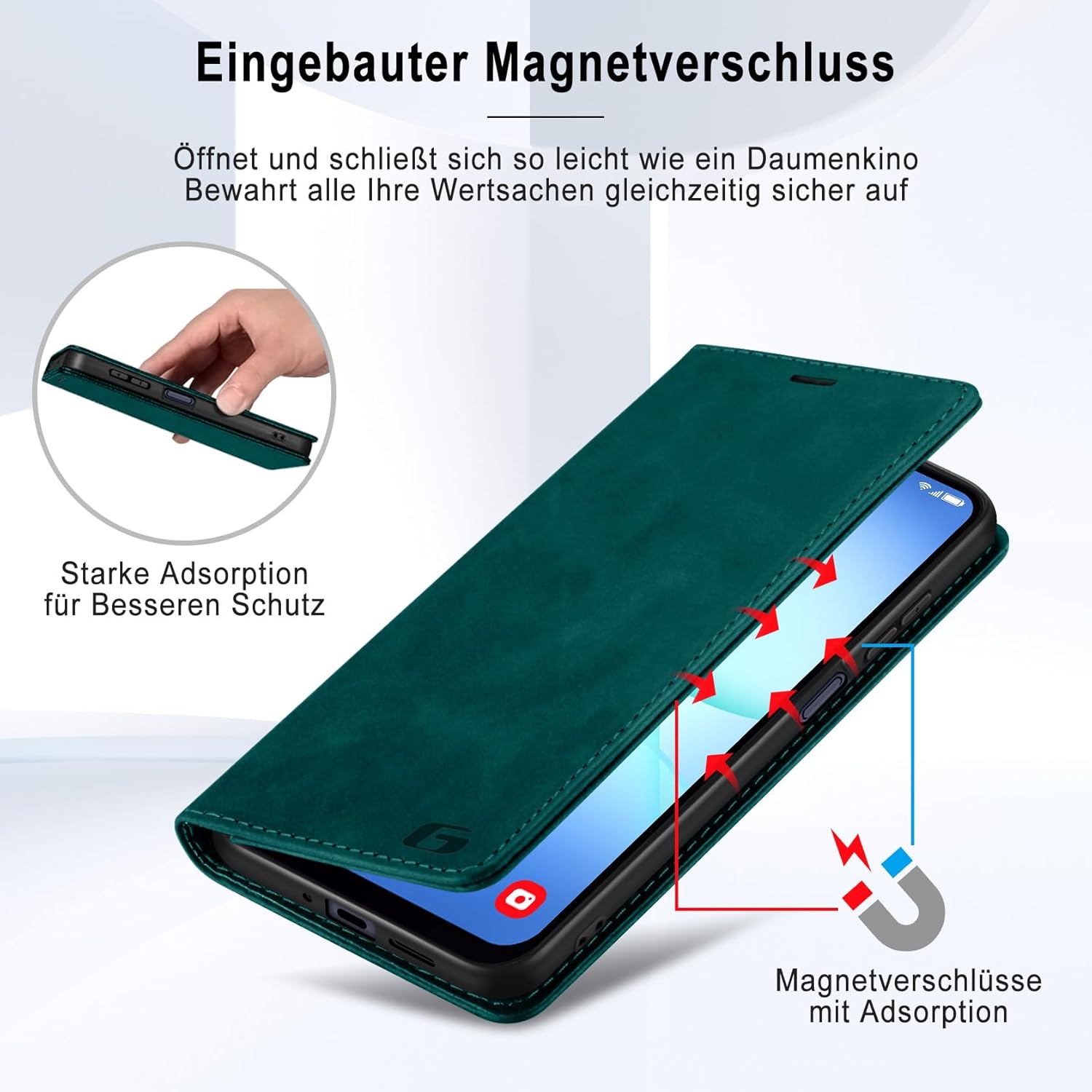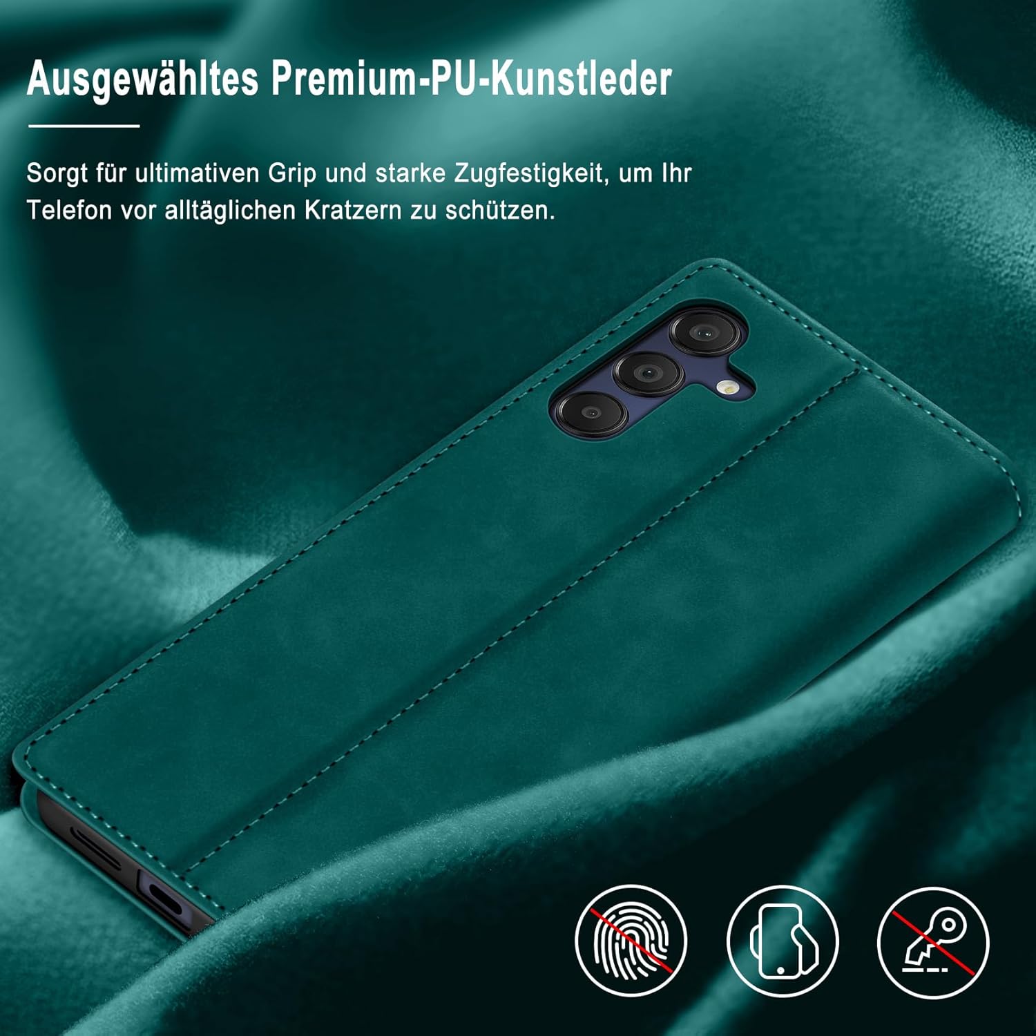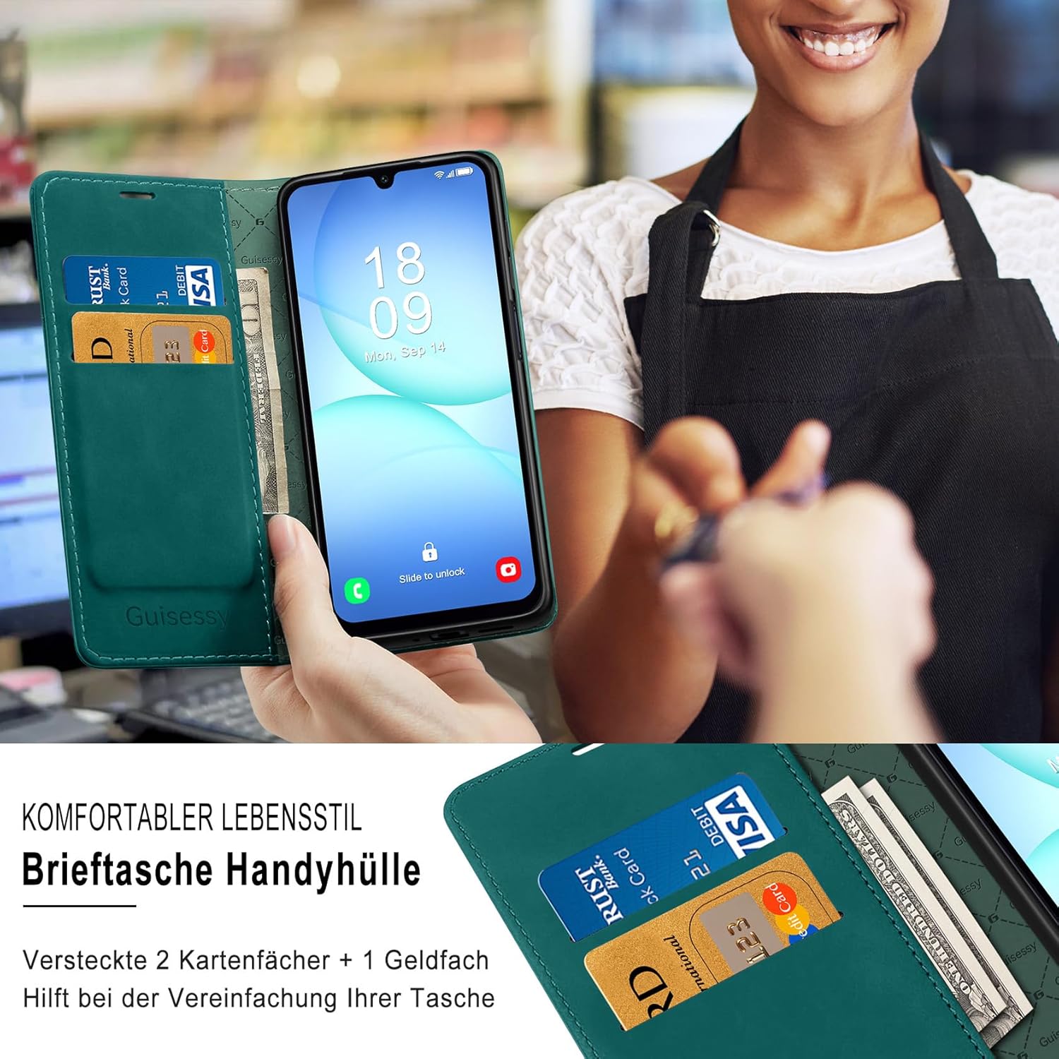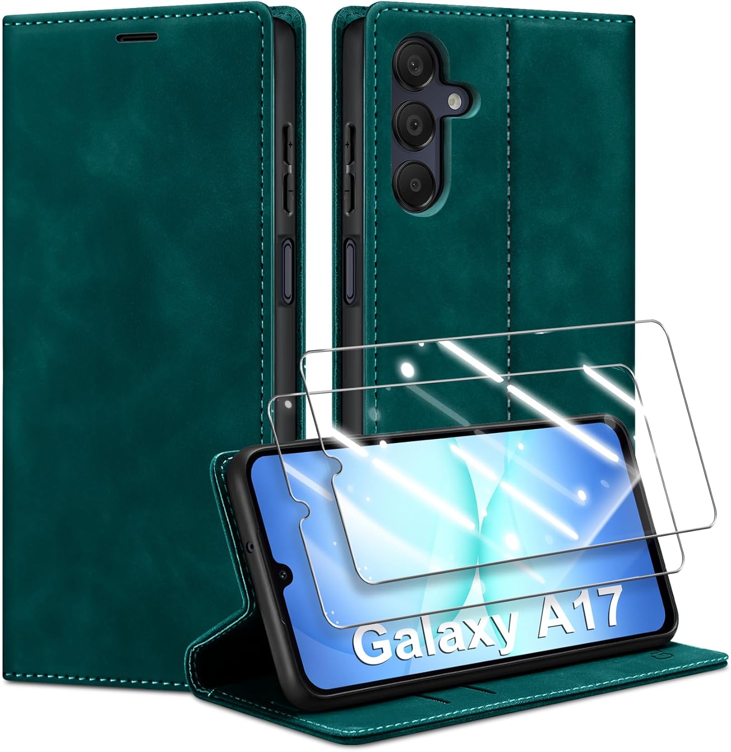 Калъф за мобилен телефон за Samsung Galaxy A17 5G и 2 протектора за екран, първокласен кожен сгъваем калъф-портфейл, [магнит] [слот за карти] [функция стойка] защитен калъф за Samsung A17, синьо-зелен