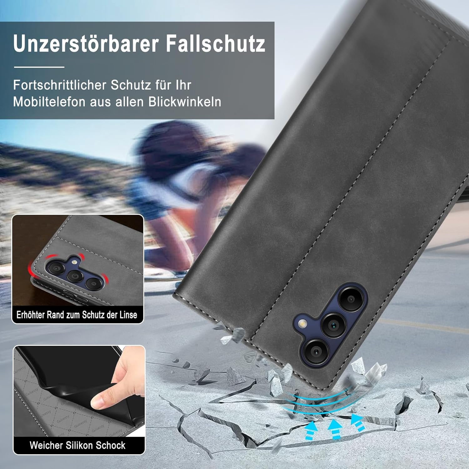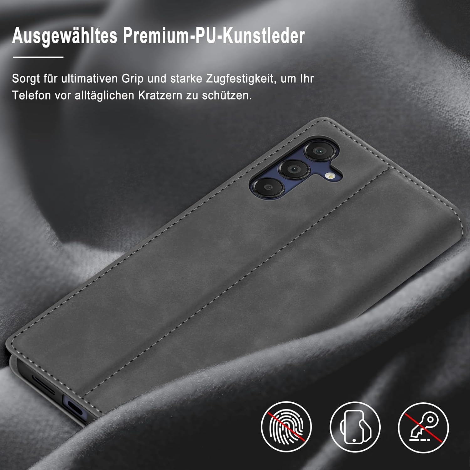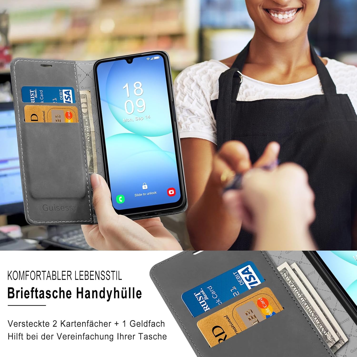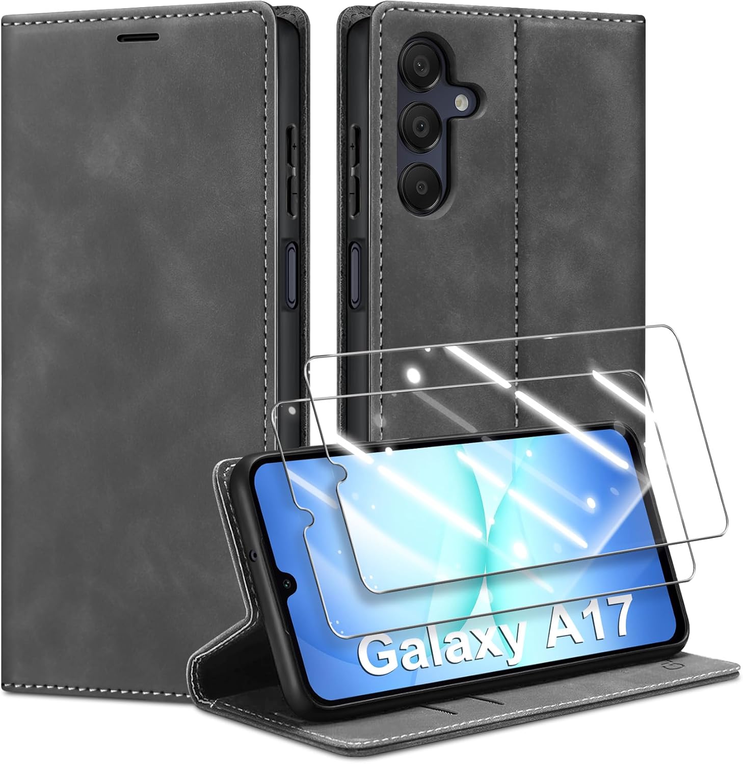 Калъф за мобилен телефон за Samsung Galaxy A17 5G и 2 протектора за екран, първокласен кожен сгъваем калъф-портфейл, [магнит] [слот за карти] [функция стойка] защитен калъф за Samsung A17, сив